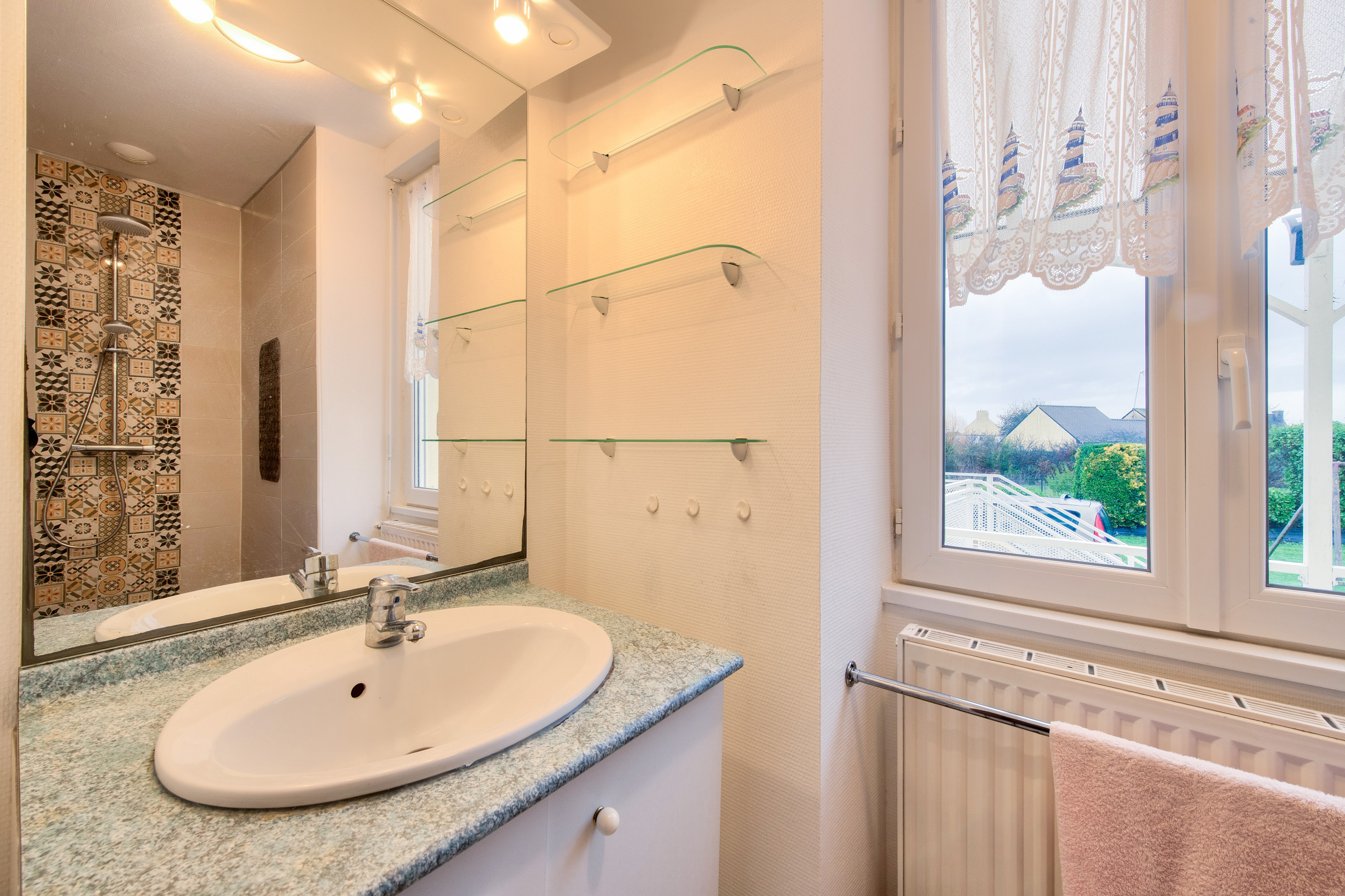 En el piso superior, descubrirá dos habitaciones, cada una equipada con una cama doble (140x190), así como una habitación infantil con dos camas individuales (90x190). Nada más despertar, al abrir las persianas, ¡disfrutará de una vista de 180 grados sobre el Aber Wrac'h!