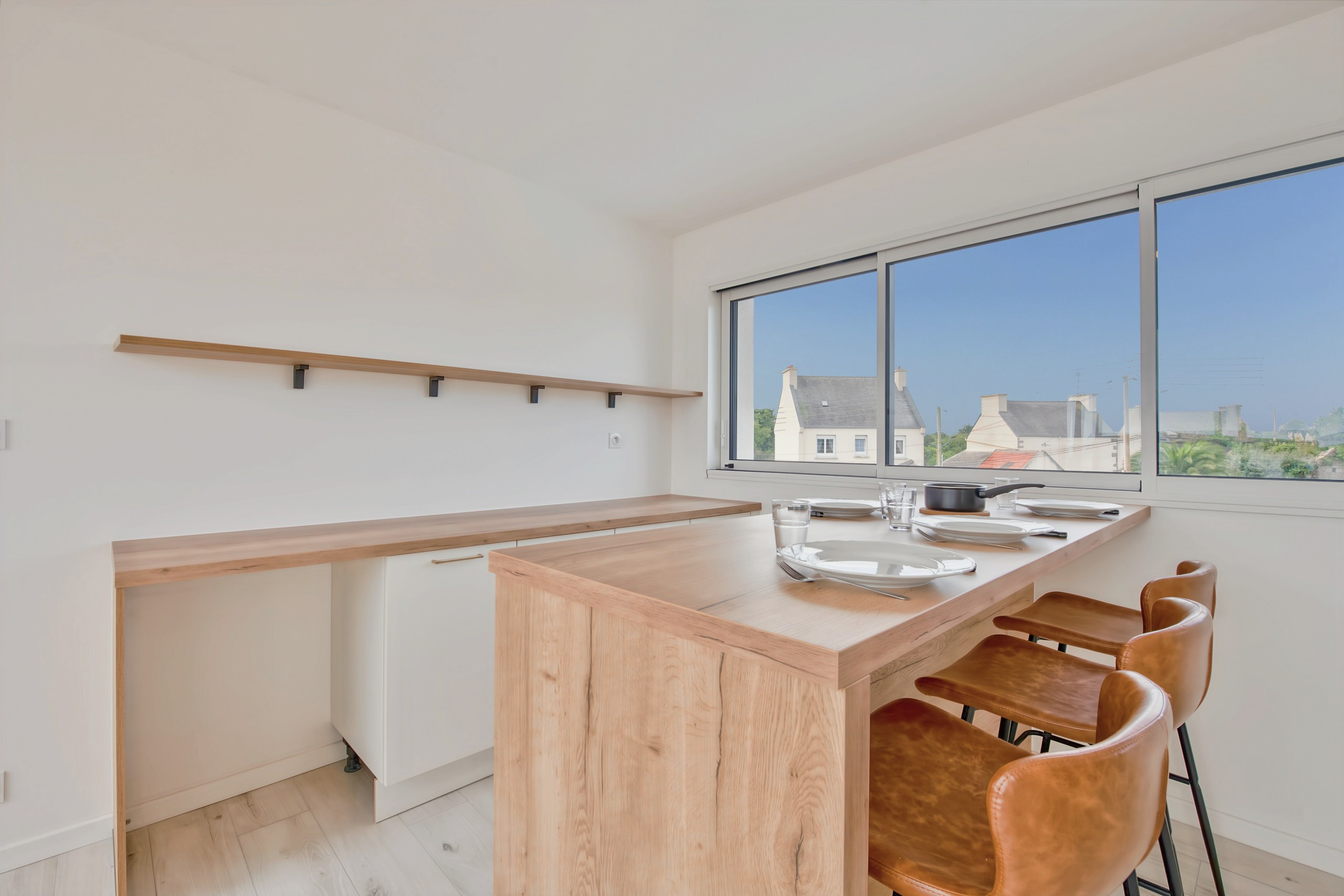 El gran salón está ubicado en la planta superior. Dispone de una cocina moderna y completamente equipada (refrigerador, congelador, horno, microondas, lavavajillas, placas de inducción) que le ofrece todo lo necesario para cocinar como en casa. Para sus desayunos, hay una hervidor de agua, una tostadora y una cafetera Nespresso a su disposición. Podrá compartir sus comidas alrededor de la mesa para 9 personas, o disfrutar de la terraza en verano. Un rincón de bar con taburetes completa la habitación. Por la noche, reúnase en el salón, cómodamente sentado en los sofás frente a la televisión.