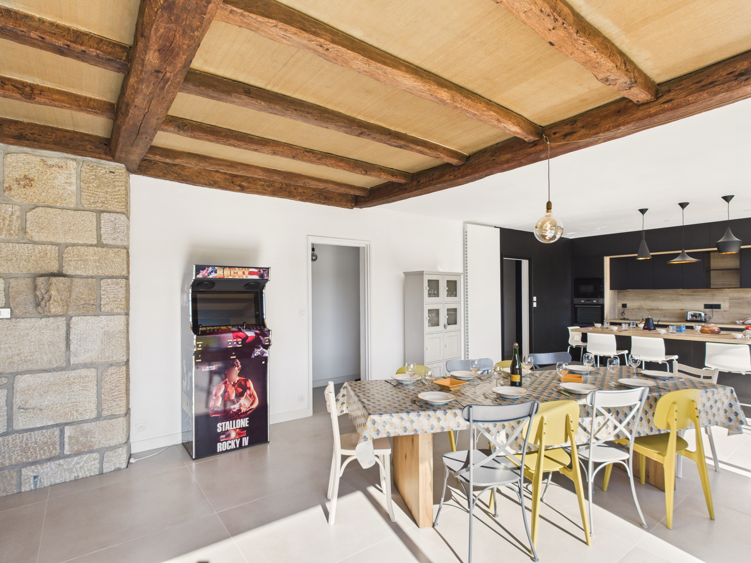 Bienvenido a esta gran casa amueblada ubicada en Pont-l'Abbé, a dos pasos del centro de la ciudad y de los comercios, con una vista impresionante y un acceso directo al río al fondo del jardín. Completamente equipada para acoger hasta 10 viajeros, ofrece todo el confort necesario para una estancia agradable en familia o entre amigos. Disfrutará de un amplio jardín cerrado con un tobogán para los niños y una terraza acondicionada con barbacoa, ideal para las comidas de verano. El cine, los restaurantes, los comercios y el mercado del jueves por la mañana son accesibles a pie. En pleno corazón del País Bigouden, estará a 10 km de las playas y a 11 km del famoso spot de surf de La Torche.