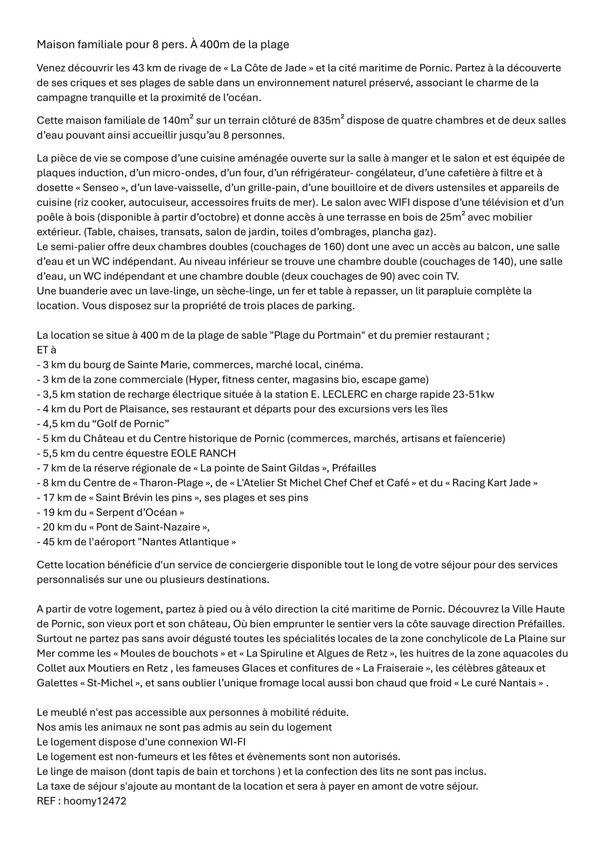 - 3,8 km del Centro histórico de Pornic, su Castillo, su puerto, sus restaurantes, artesanos y comercios, "Estación SNCF", Casino y en verano las lanzaderas a Noirmoutier