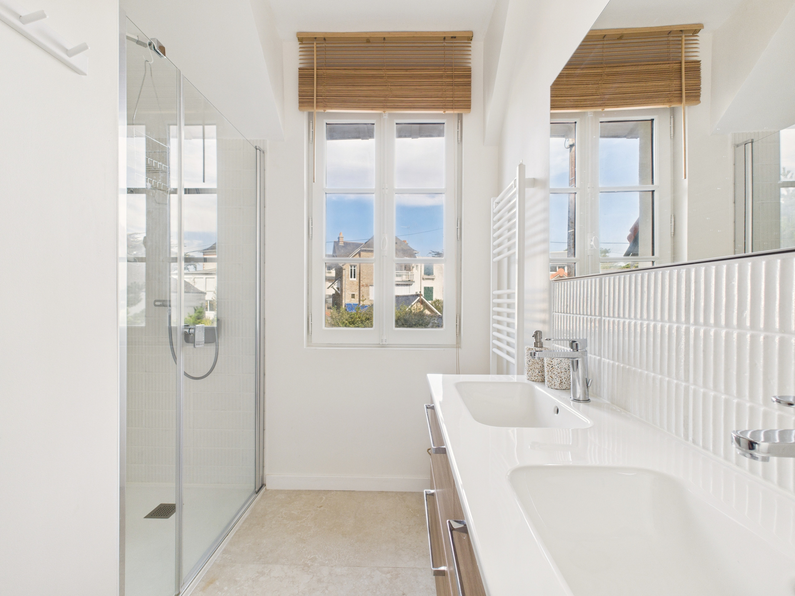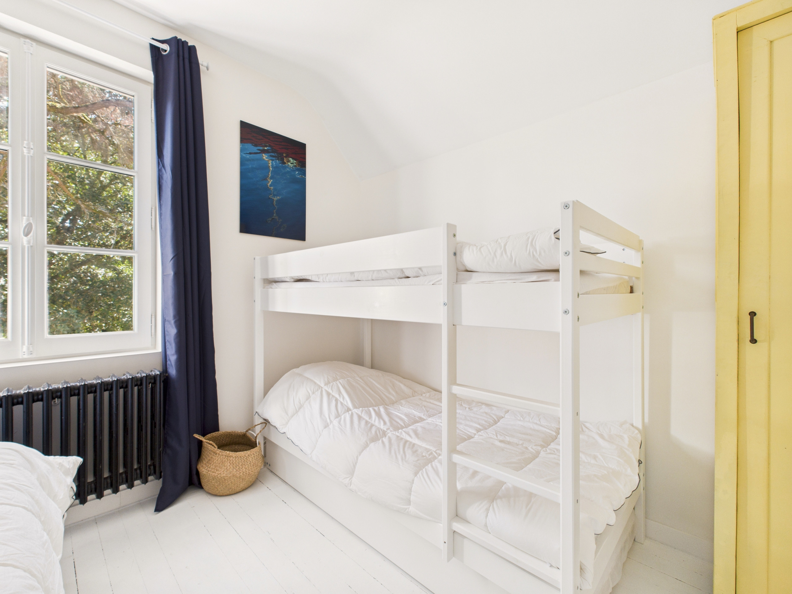 En el piso superior, descubrirá las tres habitaciones: una está equipada con una cama doble (140x190), la segunda con una cama Queen Size (160x200), y la tercera con una cama Queen Size (160x200) así como una litera, ideal para dos niños. Un segundo cuarto de baño también es accesible en el piso superior.