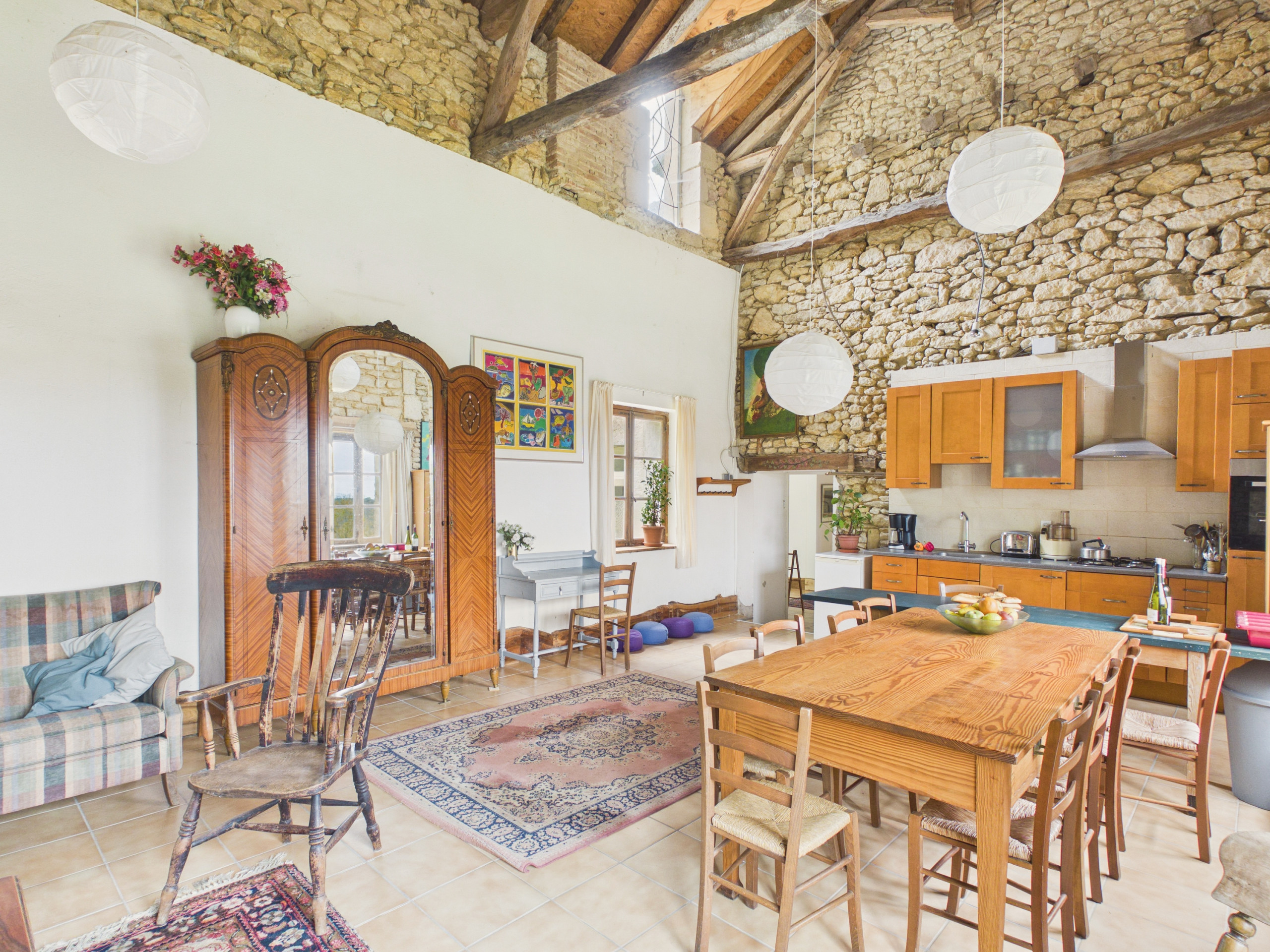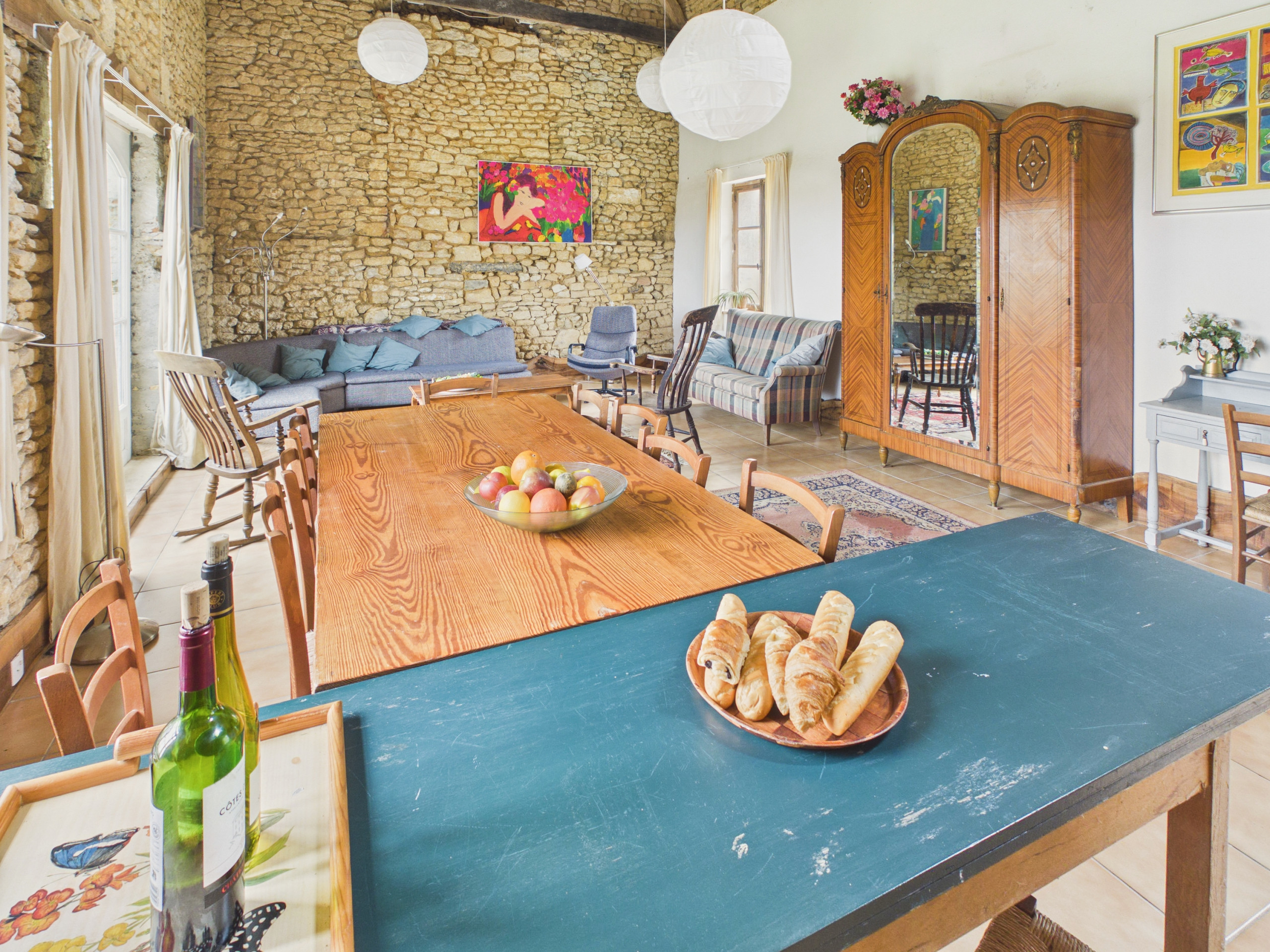 Desde su llegada, descubrirá la gran y encantadora sala de estar con su altura de techo y sus paredes de piedra, hay su rincón de salón con los sofás y el acceso al jardín. También hay una gran mesa de comedor acogedora y la cocina abierta justo detrás. Completamente equipada, dispone de lo necesario para cocinar, así como un horno, una hervidor, una tostadora y una cafetera de filtro.