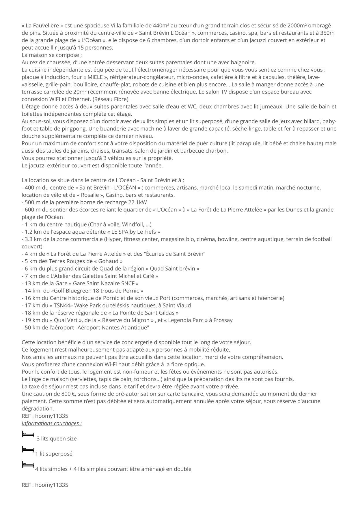 Se le solicitará un depósito de 800 €, en forma de pre-autorización en tarjeta bancaria, en el momento del último pago. Esta cantidad no se debitará y se anulará automáticamente después de su estancia, siempre que no haya ningún deterioro.