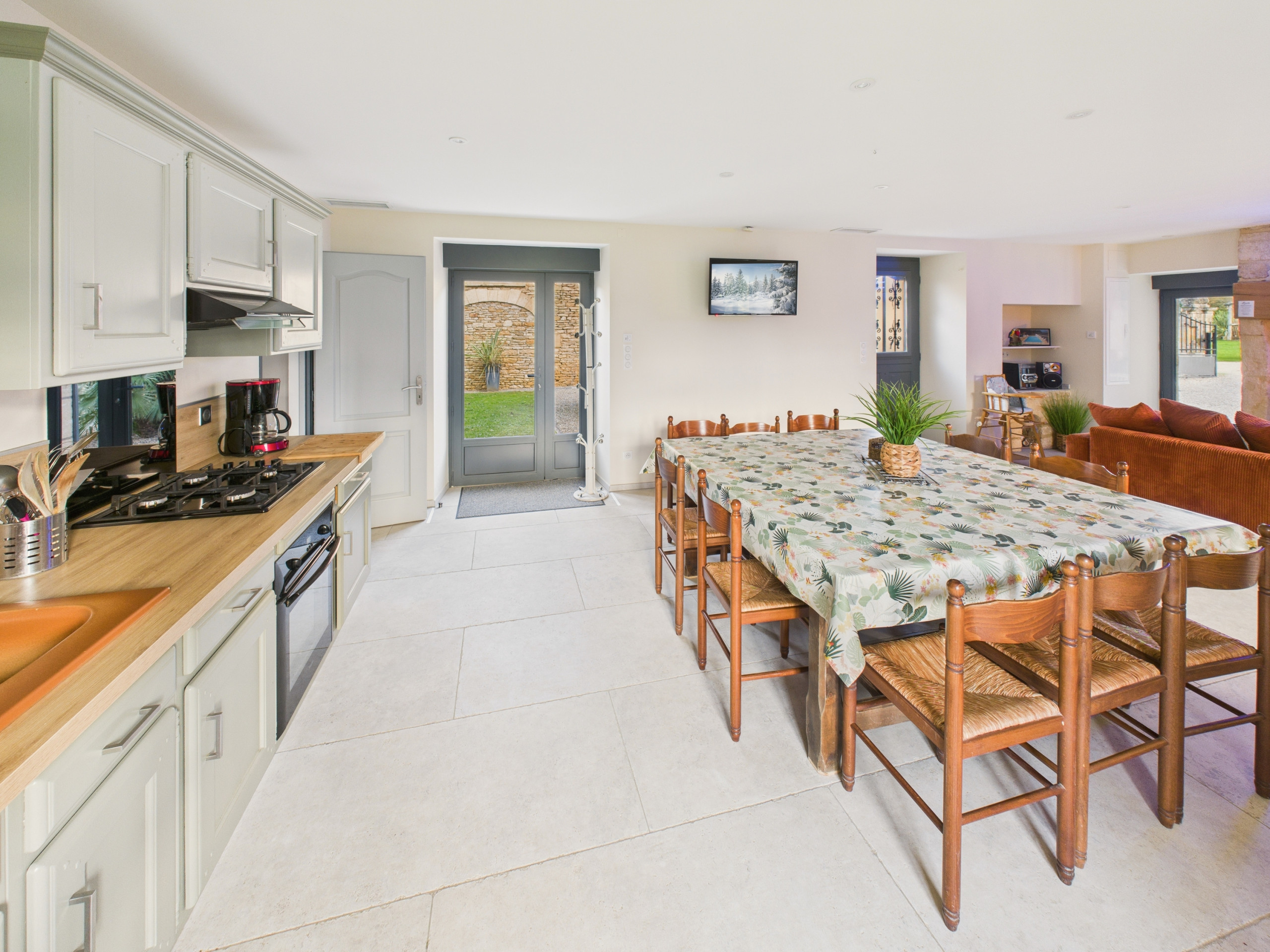 Cruce la puerta de entrada y descubra una gran sala de estar de 45m2 bellamente decorada. La cocina, moderna y completamente equipada (refrigerador, congelador, microondas, horno, placas de gas y lavavajillas), pone a su disposición todo lo necesario para preparar sus comidas. Para el desayuno, encontrará una hervidor, una tostadora y una cafetera de filtro y una máquina Senseo. Comparta sus comidas alrededor de la gran mesa para 10 personas. Por la noche, disfrute de los sofás y la televisión para relajarse.