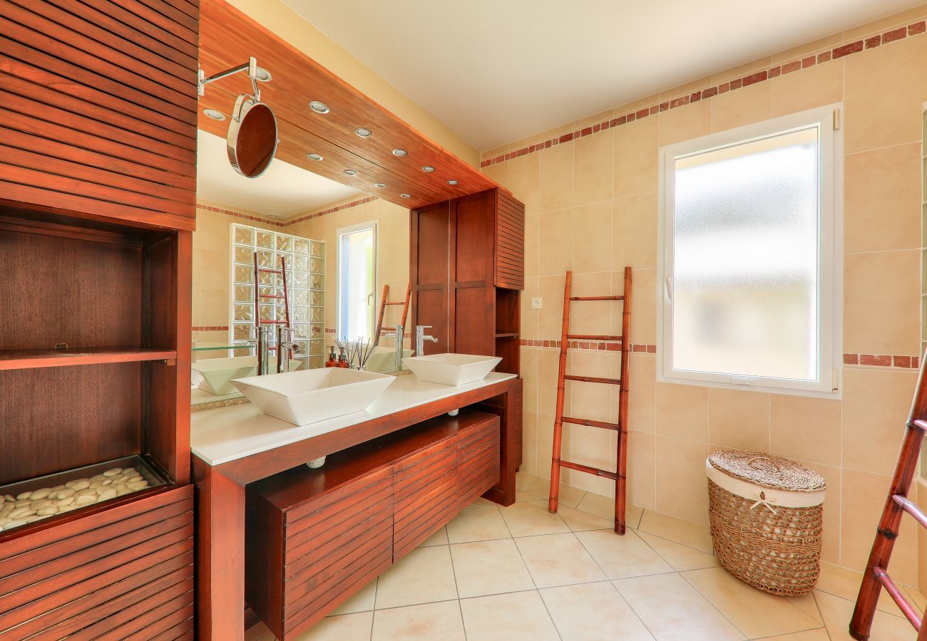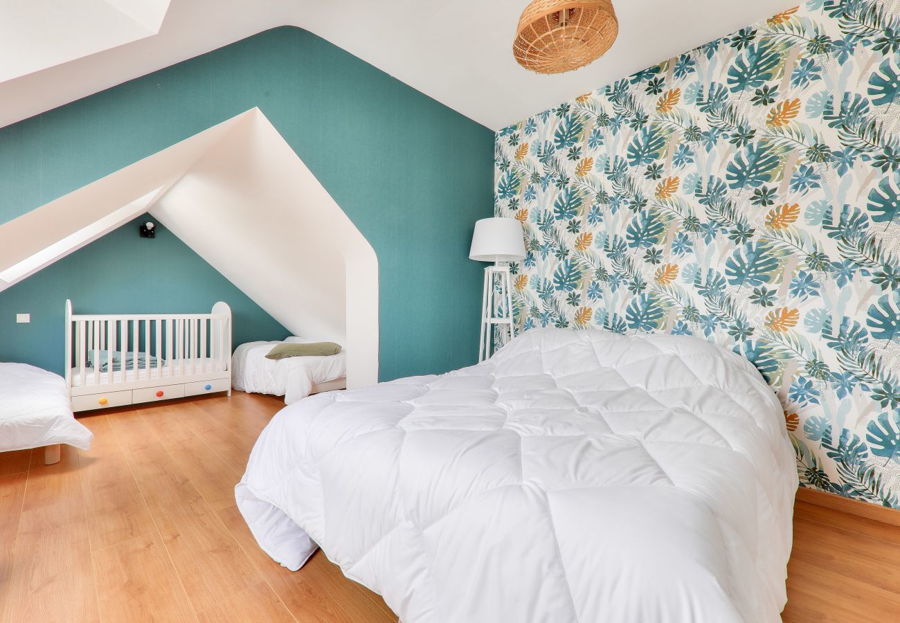 Después de un largo día de descubrimiento de la región, podrá descansar en una de las 4 habitaciones de la casa. La primera, situada en la planta baja, cuenta con una gran cama doble, una abertura al jardín y un cuarto de baño privado, ofreciéndole así un máximo de confort e intimidad. Las otras tres habitaciones se encuentran en la planta superior. Las dos primeras disponen cada una de una cama doble. Ambas abuhardilladas y con ambiente tranquilo, le ofrecen un espacio ideal para una noche serena. Finalmente, la última habitación, con tonos azules y ambiente tropical, podrá acoger a una familia o a los niños gracias a su cama doble, sus dos camas individuales y su cuna. Un amplio cuarto de baño con bañera y ducha completa esta planta.