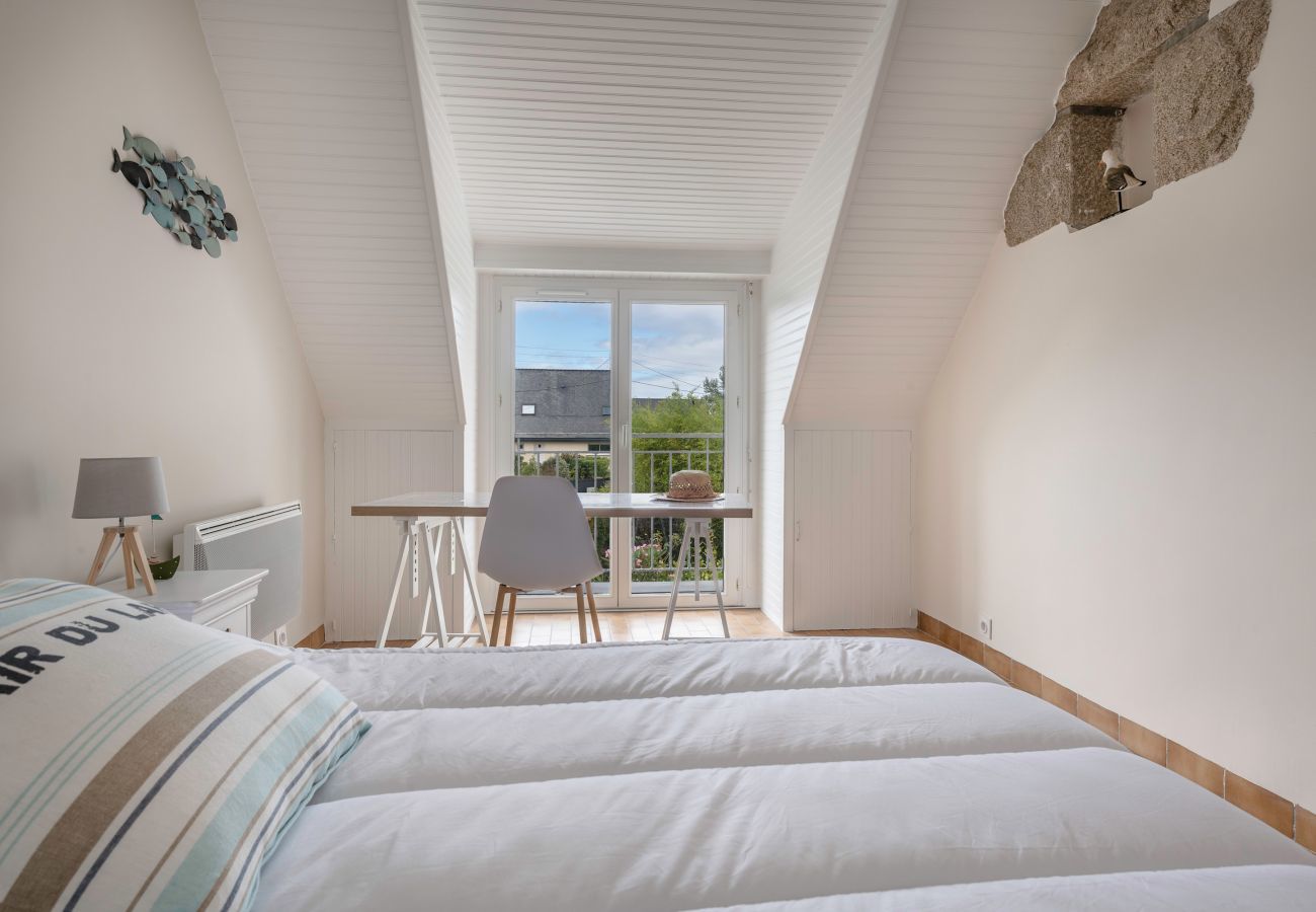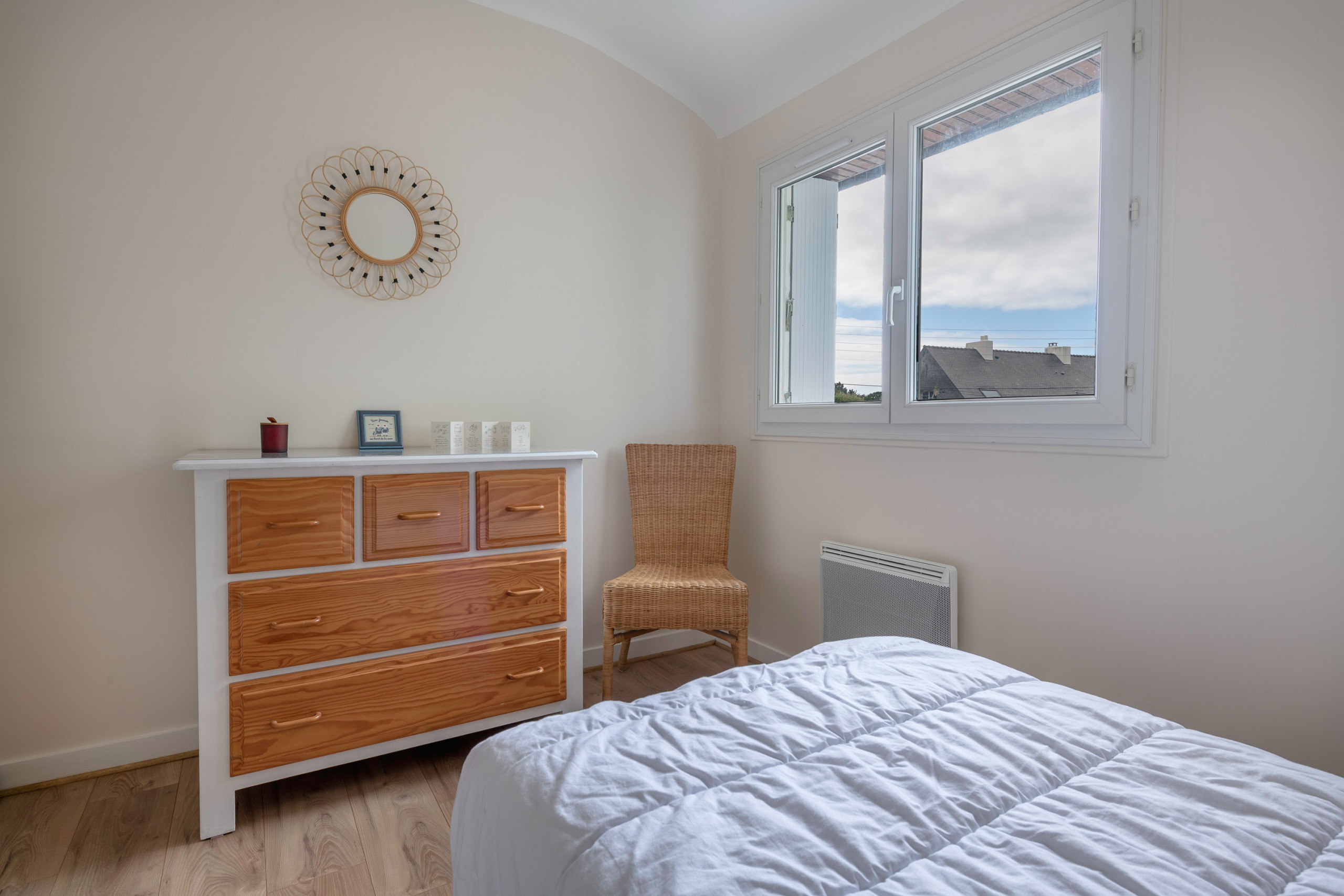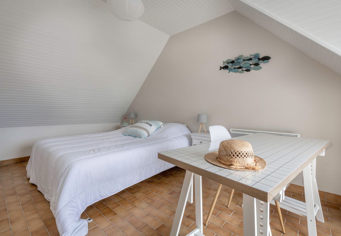 Luego, encontrará tres dormitorios, el primero con una cama de matrimonio es muy amplio y tiene un área de escritorio, el segundo con una cama doble y una pared azul es un rincón acogedor con vista al mar y, finalmente, el último donde reina un ambiente sereno está equipado con dos camas individuales.