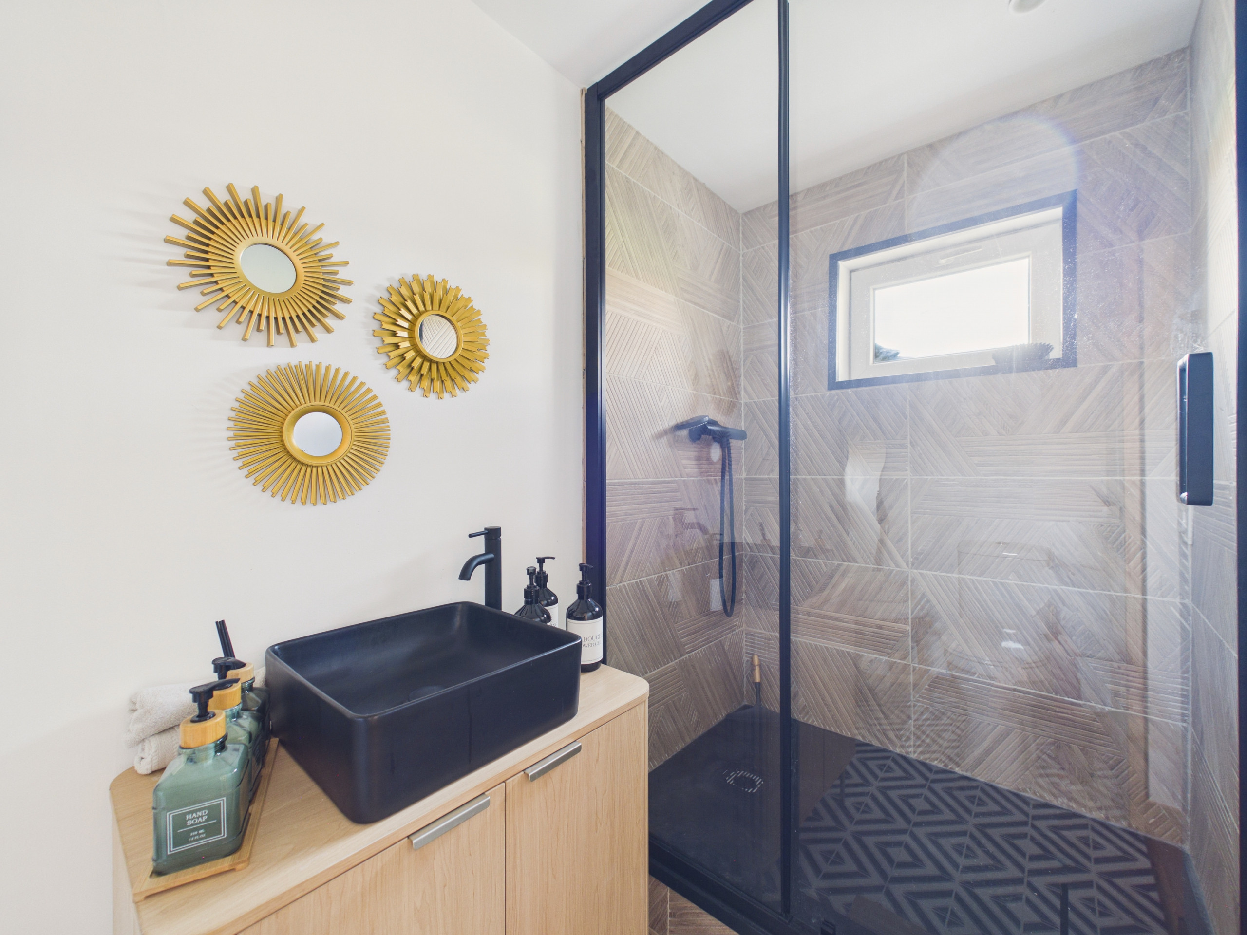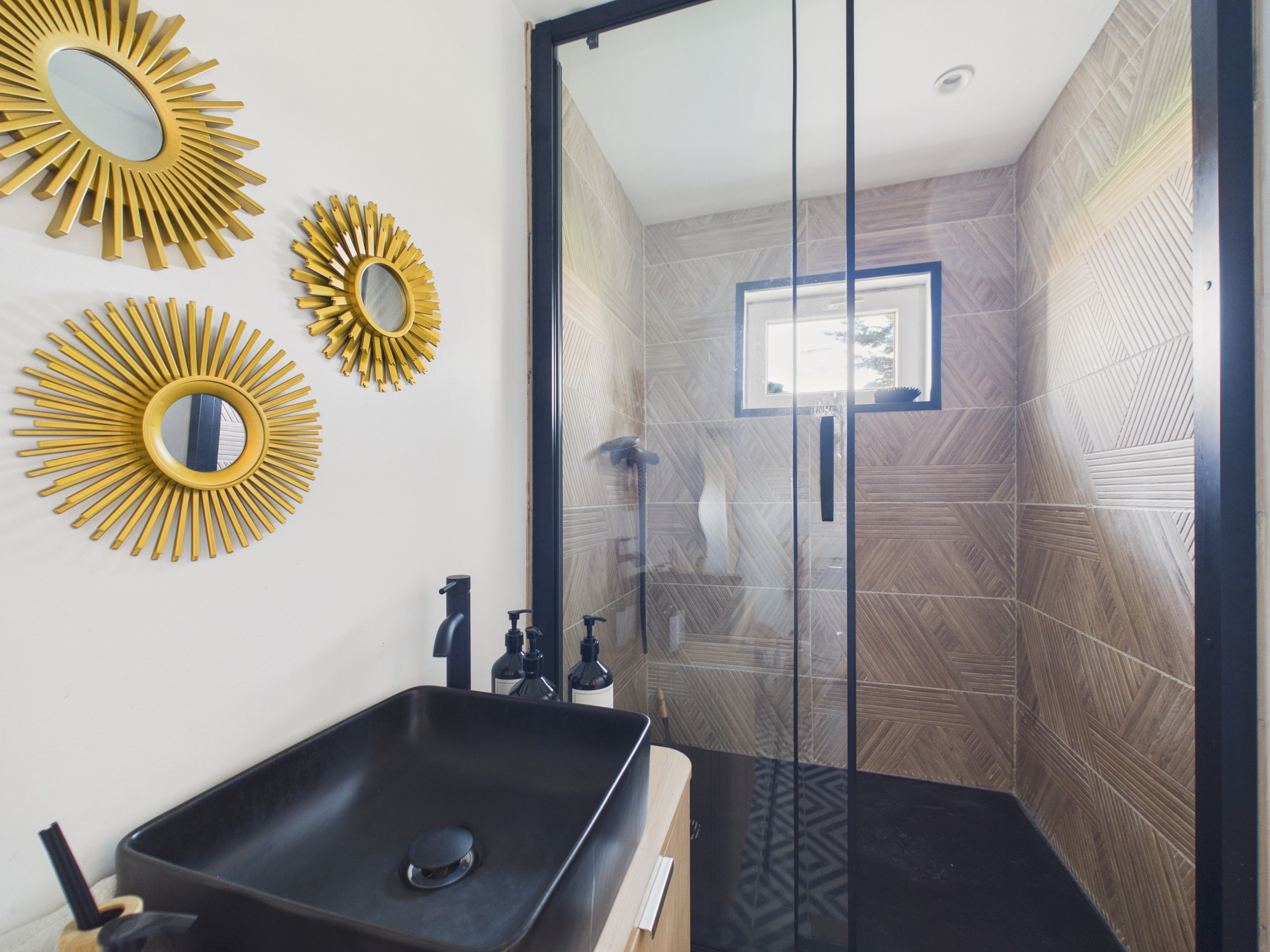 Un baño con bañera y ducha se encuentra en la planta alta de la casa. En la dependencia, hay un segundo cuarto de baño con ducha y secador de pelo a su disposición. Tres inodoros separados completan la vivienda: uno en la planta baja, uno en la planta alta y uno en la dependencia.