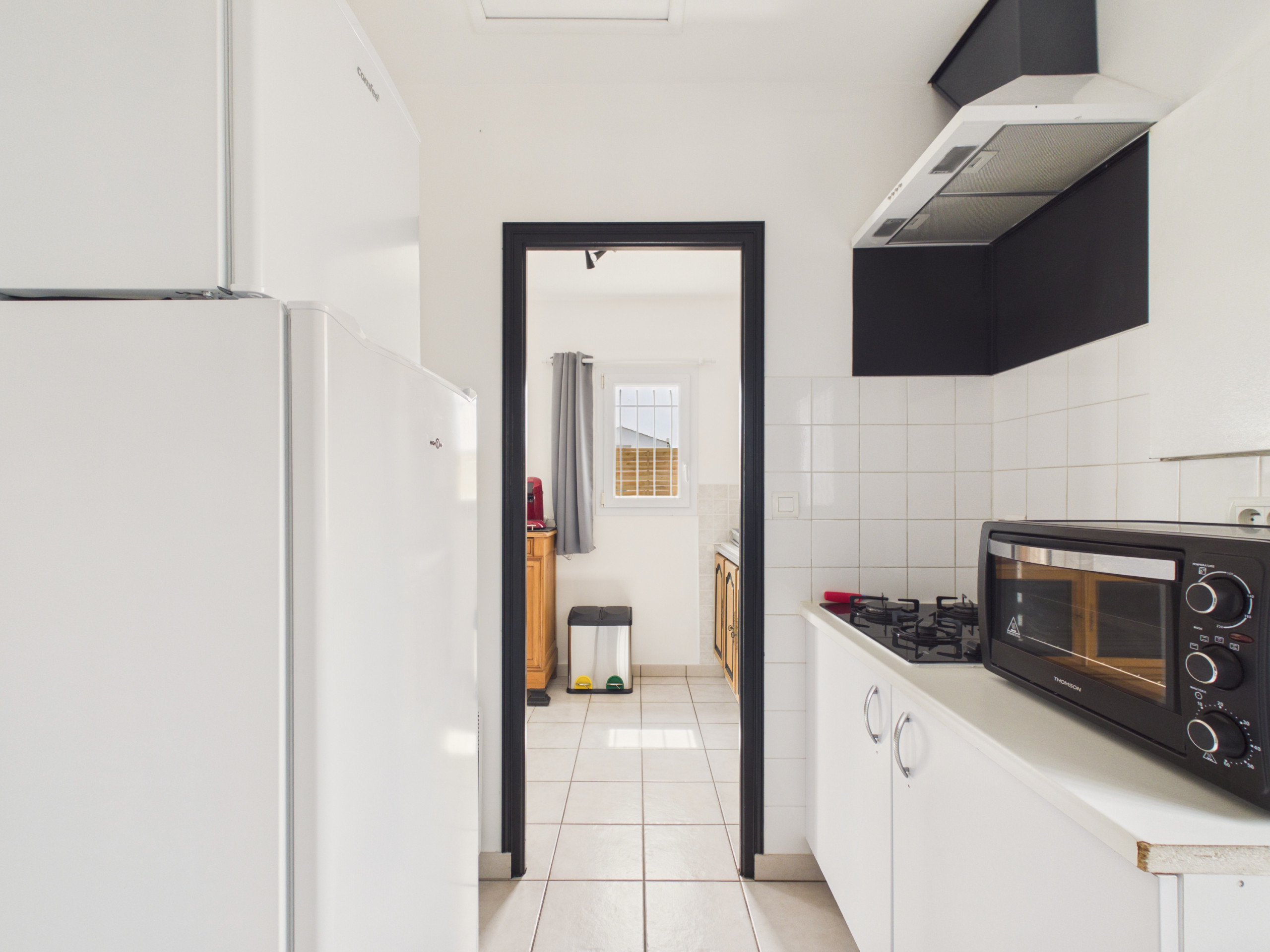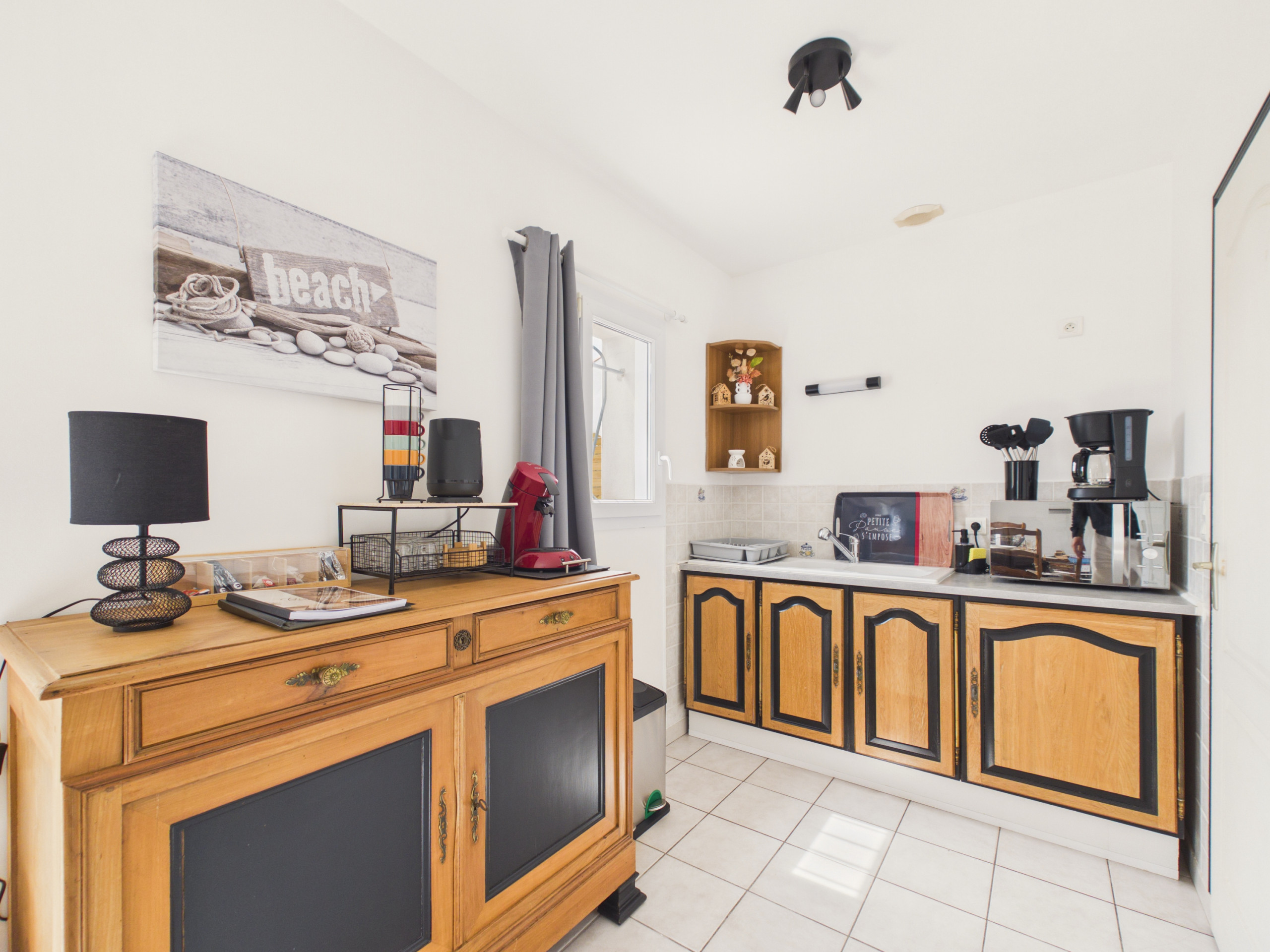 Encontrará en la primera parte de la cocina parte de los equipos, incluyendo un microondas, una tetera así como una cafetera de filtro y una cafetera Senseo. En la trascocina, placas de cocción a gas, refrigerador, congelador, horno y lavavajillas le acompañarán en la preparación de sus comidas.