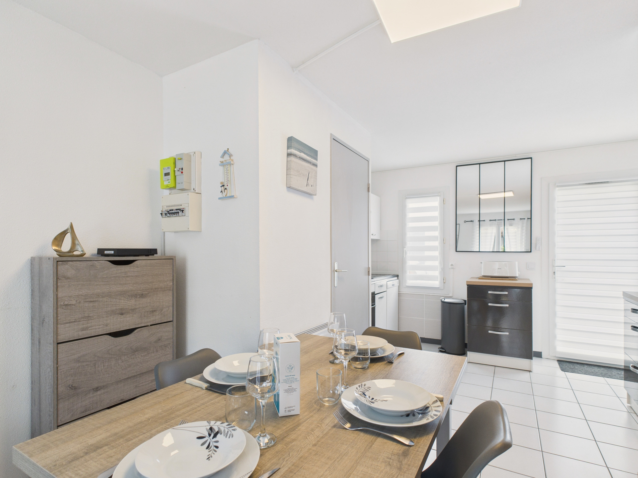 Esta bonita casa de 59 m², con una decoración simple y acogedora, le ofrece todo el confort necesario para una estancia completamente relajada. Al entrar, descubrirá un espacio optimizado: una entrada con armario, aseos separados, y luego un espacio de vida luminoso compuesto por una zona de salón con televisión, un espacio de comedor acogedor, y una cocina abierta. Esta está equipada con una cocina de gas, un frigorífico, un horno, un microondas, un congelador, un lavavajillas, una cafetera de filtro y Nespresso, una tostadora y todos los utensilios imprescindibles para preparar sus comidas.