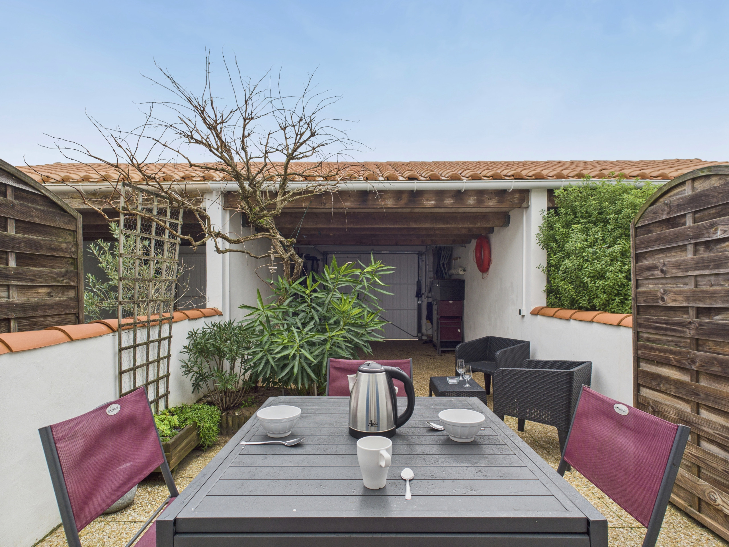 En el exterior, un pequeño patio acondicionado con muebles de jardín le permitirá disfrutar de comidas al aire libre o momentos de relajación bajo el sol de Vendée.