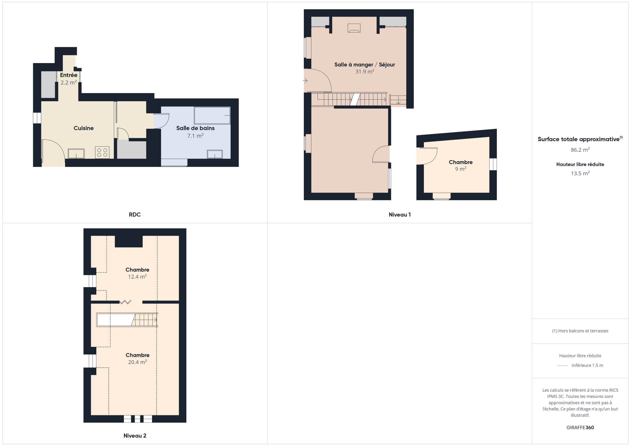 La vivienda cuenta con tres habitaciones. La primera, ubicada en la planta baja, está equipada con una cama Queen Size (160x200 cm). Las otras dos se encuentran en la planta superior: una dispone también de una cama doble (140x190 cm) y la otra, en un altillo (no cerrado), de dos camas individuales (90x190 cm) que pueden juntarse para formar una gran cama doble.