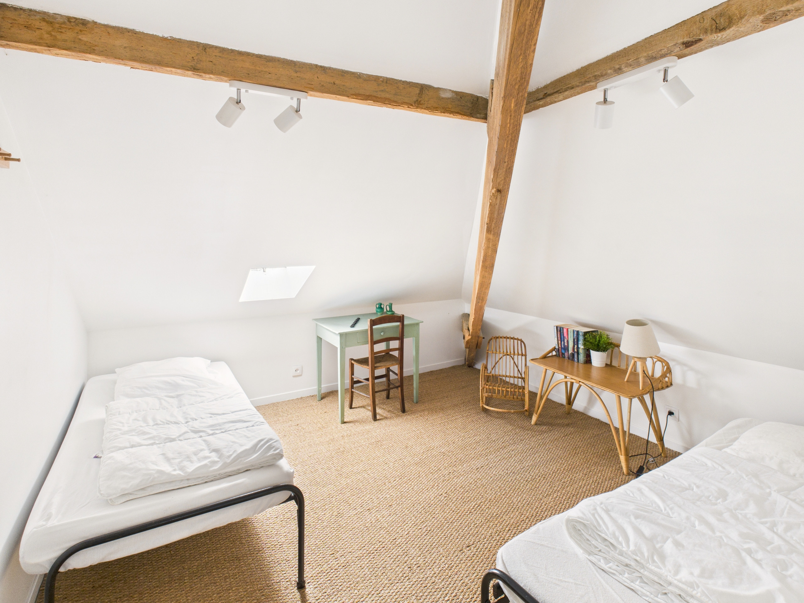 Habitación 5 – 2º piso: 2 camas individuales (90x190 cm) que se pueden juntar en una cama doble, lavabo, 2 sillones y armario.