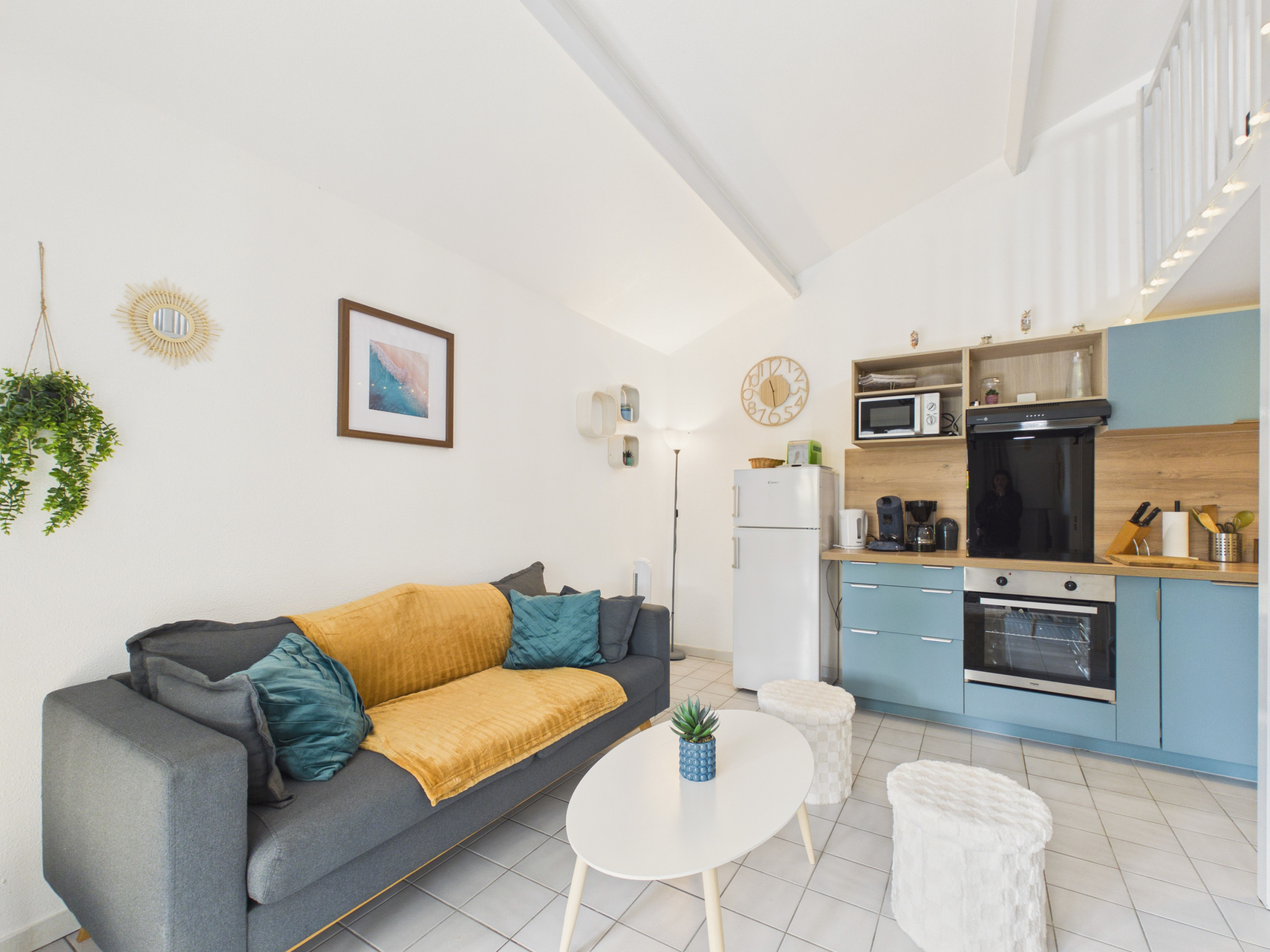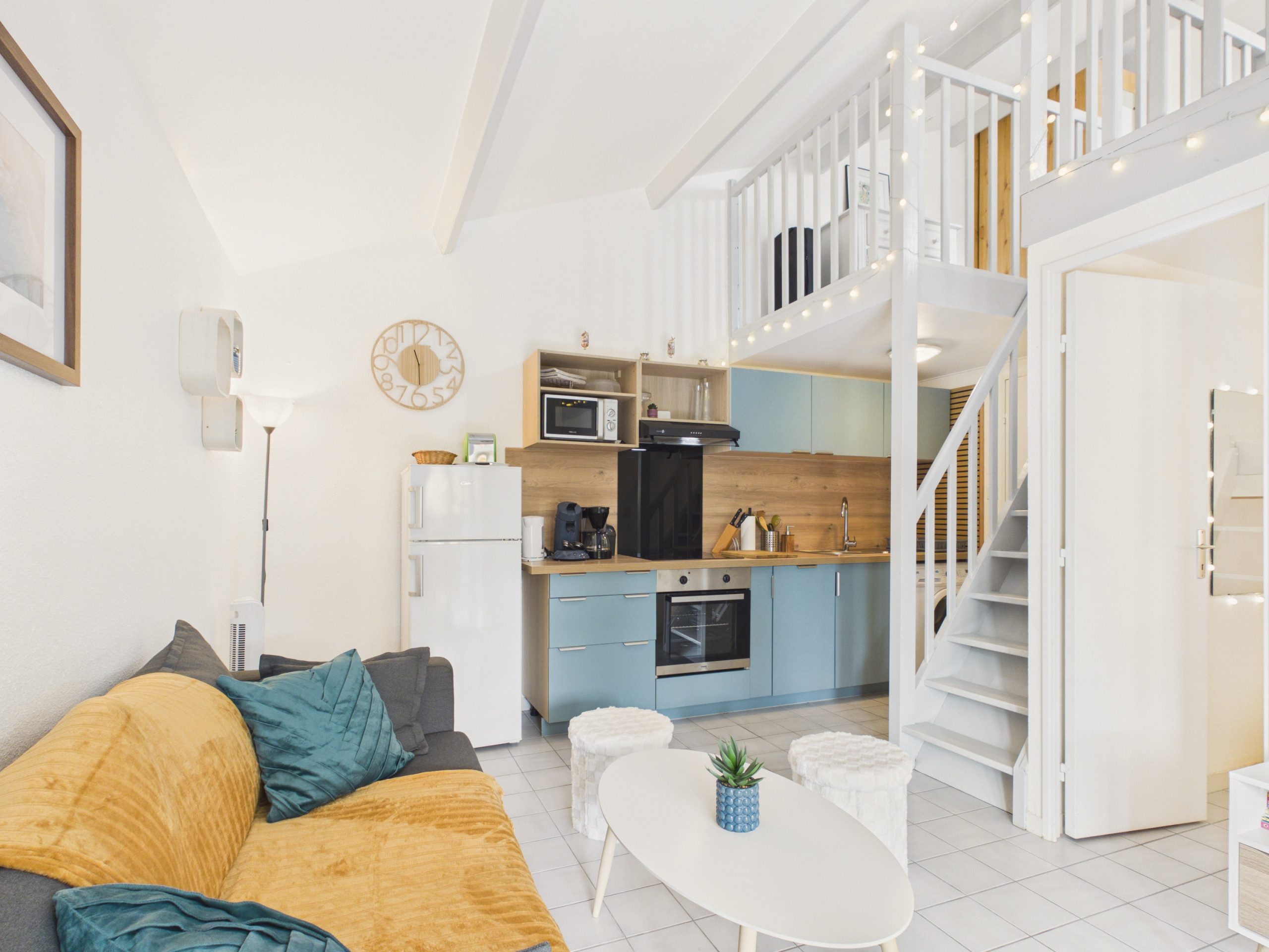 La entrada se realiza directamente por la terraza que le conduce a una agradable sala de estar. Encontrará un rincón de salón acogedor con un sofá cama (que permite alojar por la noche a 2 personas adicionales) y un televisor, perfecto para sus momentos de relajación, así como un espacio de comedor para compartir sus comidas en familia. La cocina americana, moderna y funcional, está equipada con placas eléctricas, frigorífico-congelador, horno, microondas, cafetera de filtro, hervidor y todos los utensilios necesarios para preparar buenas comidas.