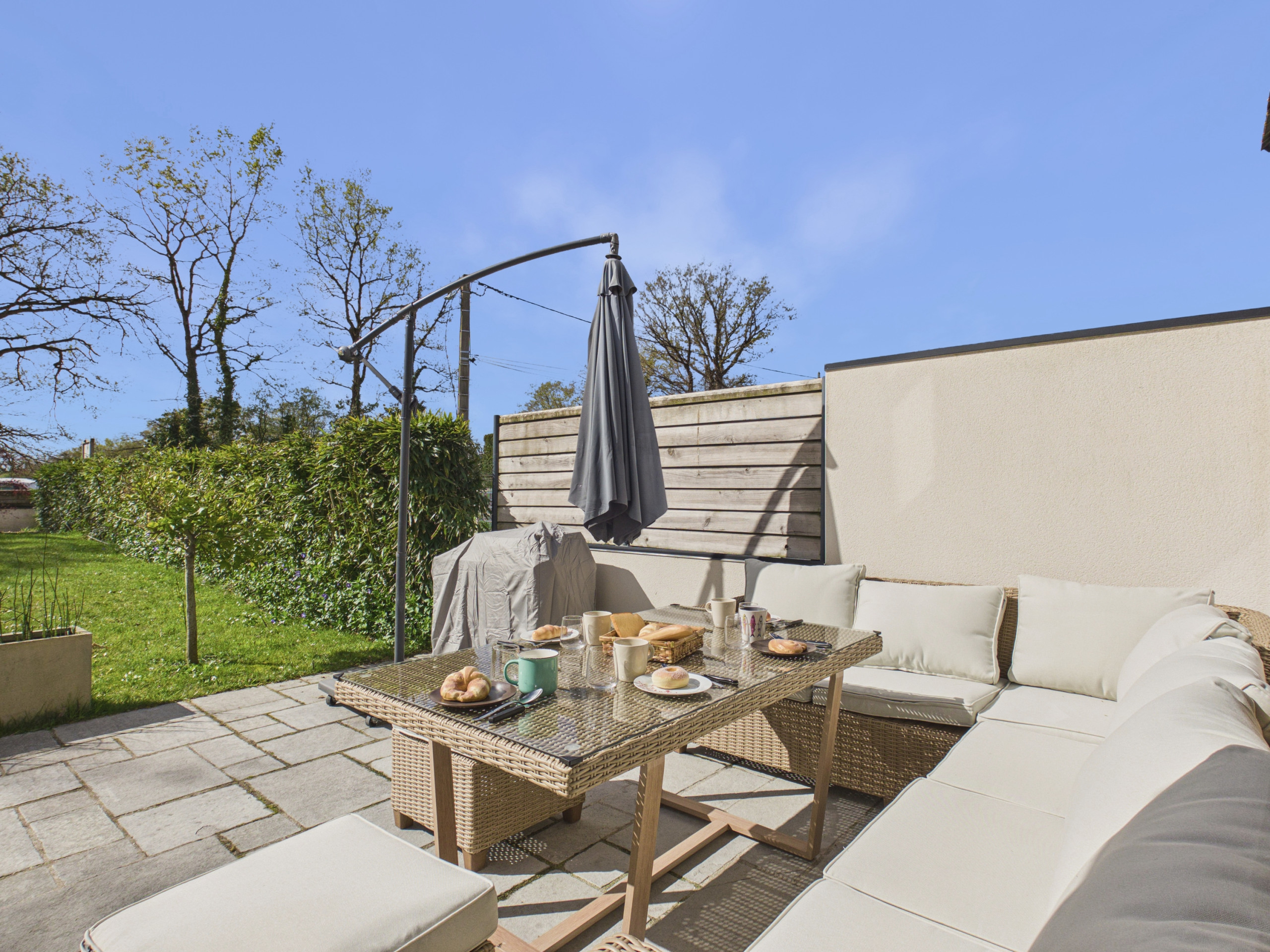El rincón de comida le permitirá reunirse alrededor de la mesa. Otra posibilidad: comer fuera, aprovechando la terraza y su mobiliario, aún mejor para degustar las buenas carnes a la parrilla cocinadas en la barbacoa.