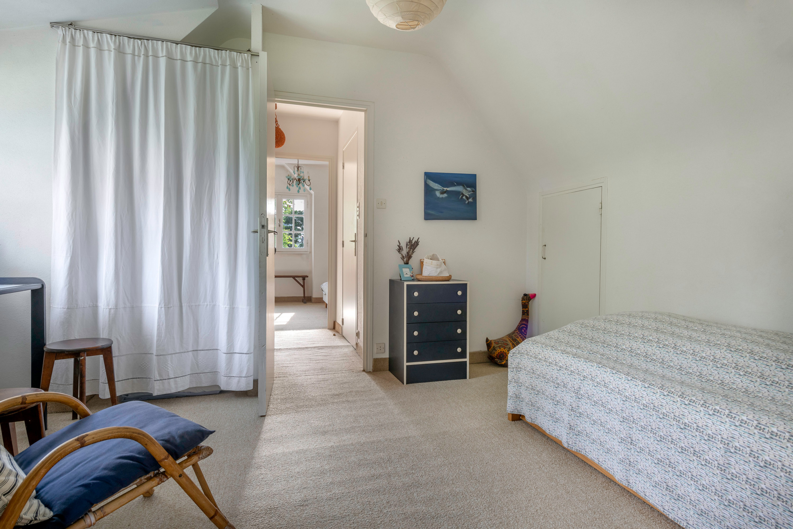 En la planta superior, dos dormitorios le esperan para pasar la noche. La primera, con cama doble y colores claros, será ideal para una pareja. La segunda hará las delicias de los niños o de una pareja con niños, con su litera y sus dos camas individuales que también se pueden juntar para formar una cama king size.