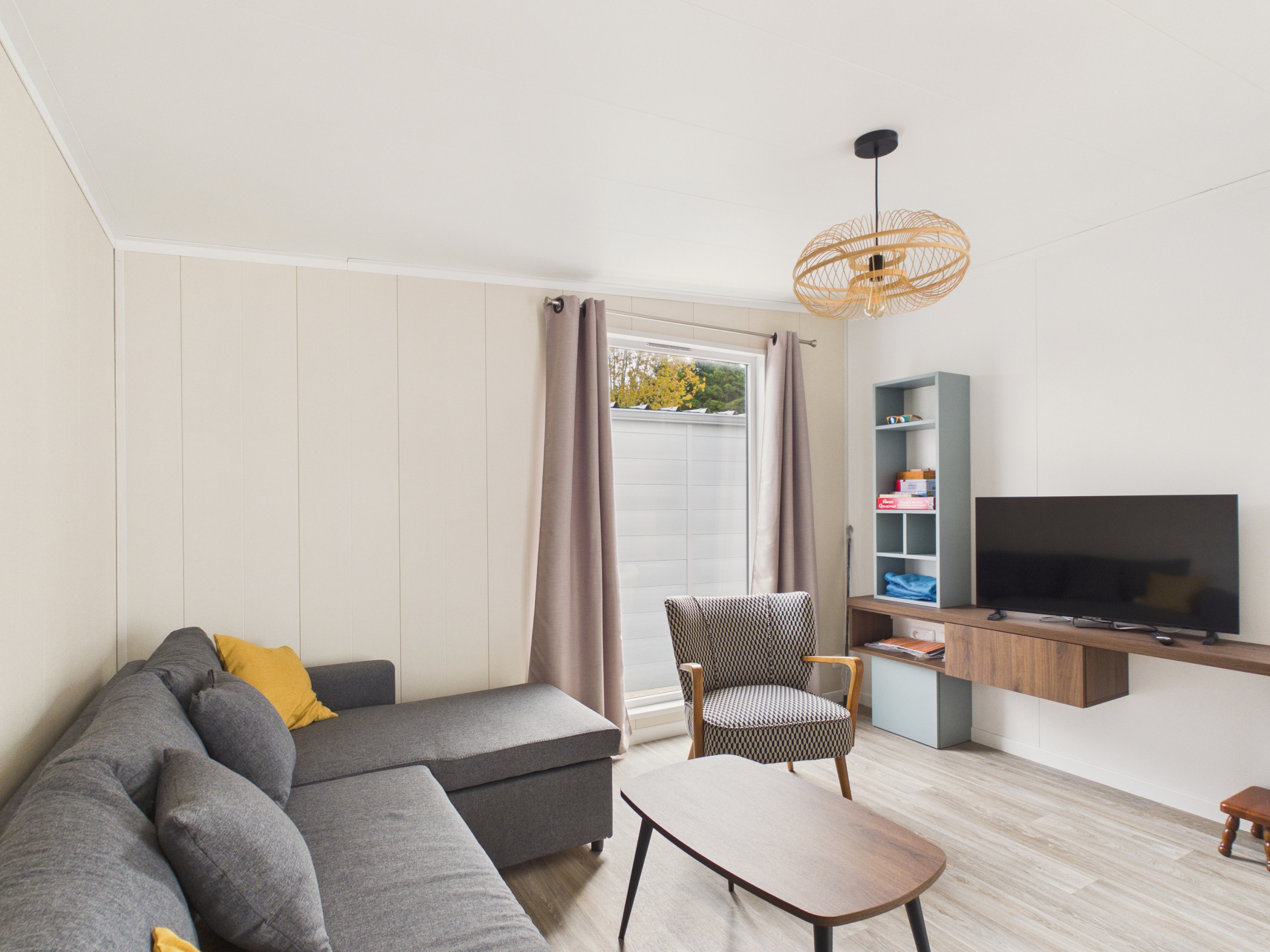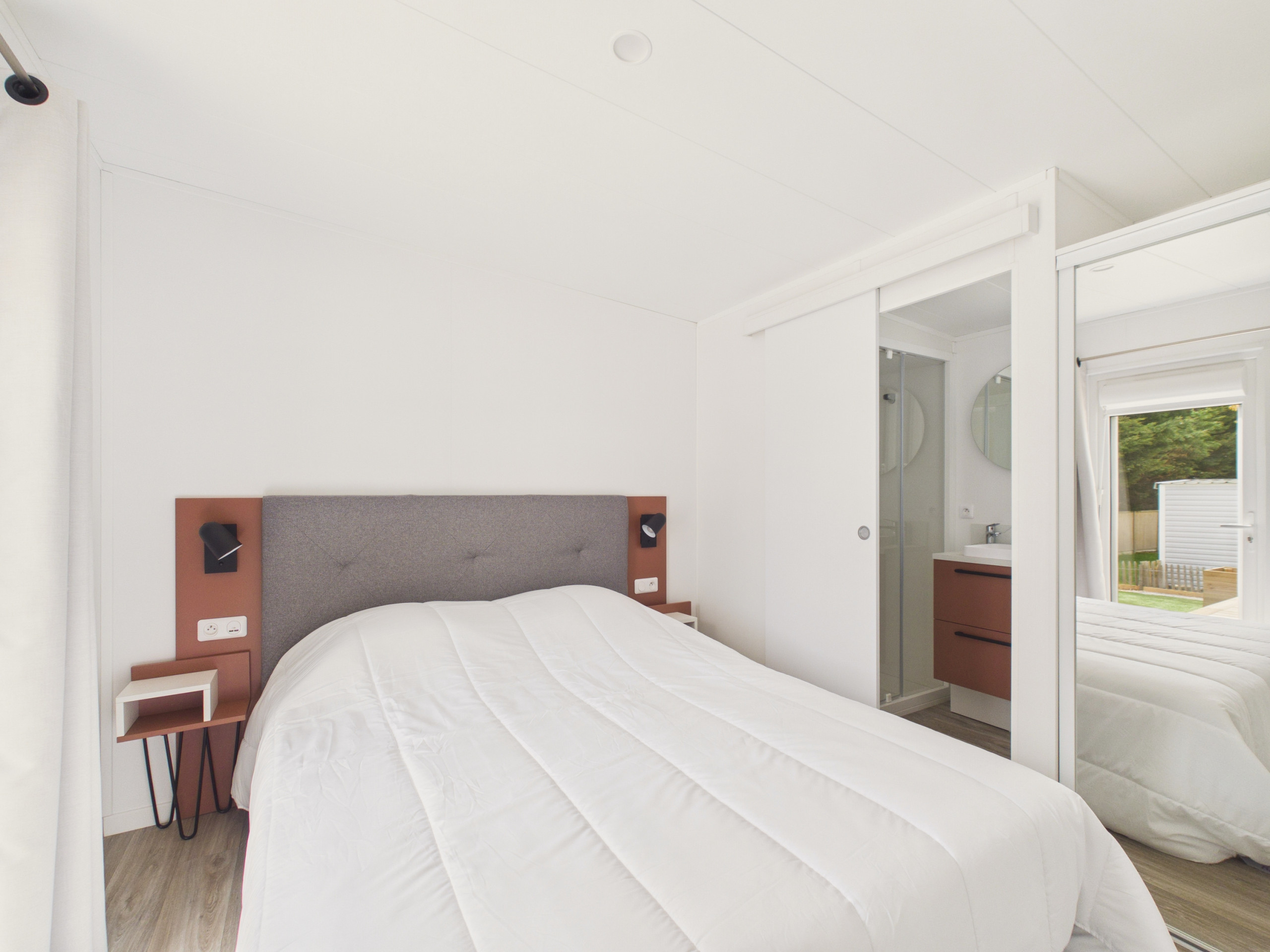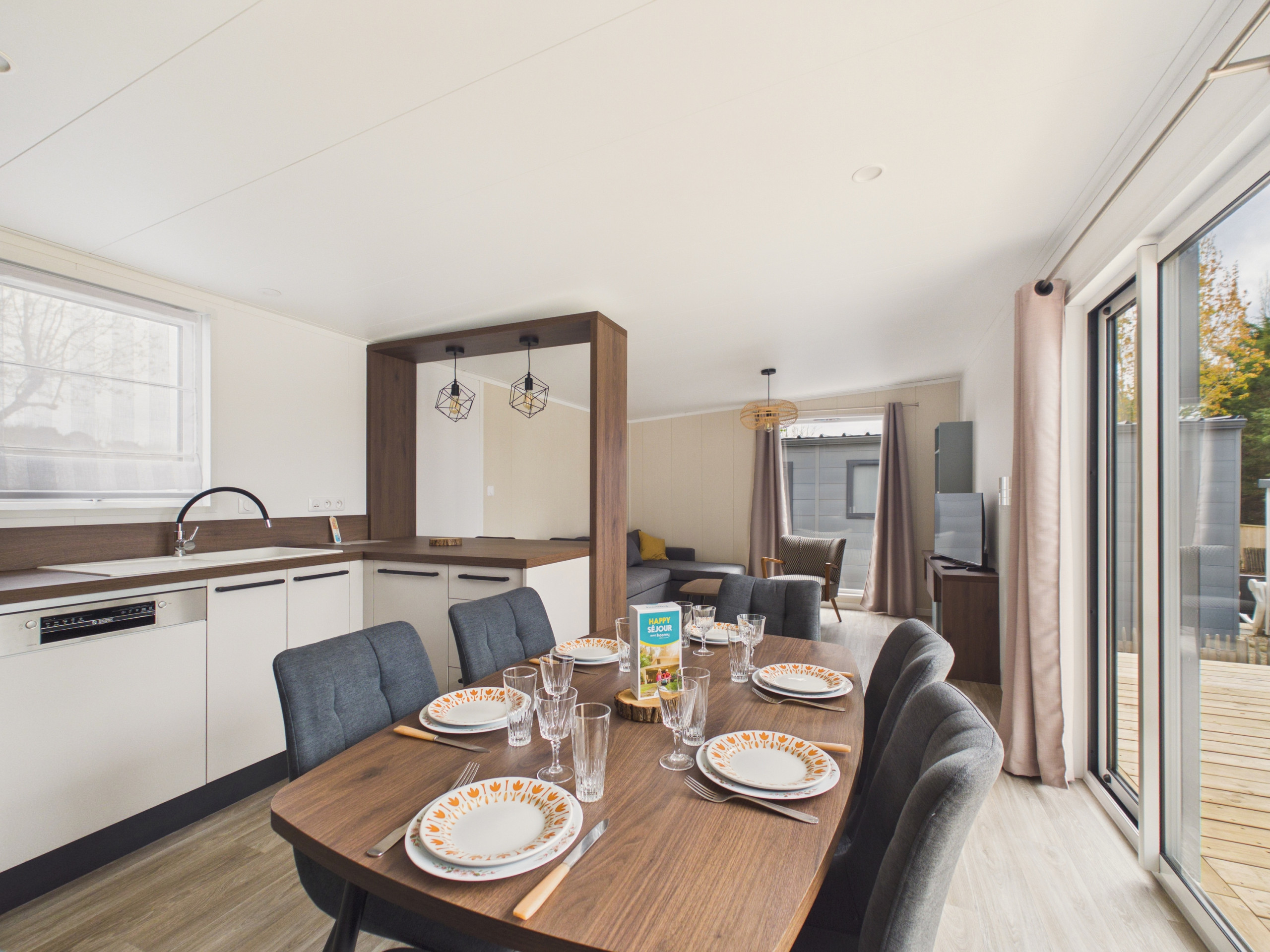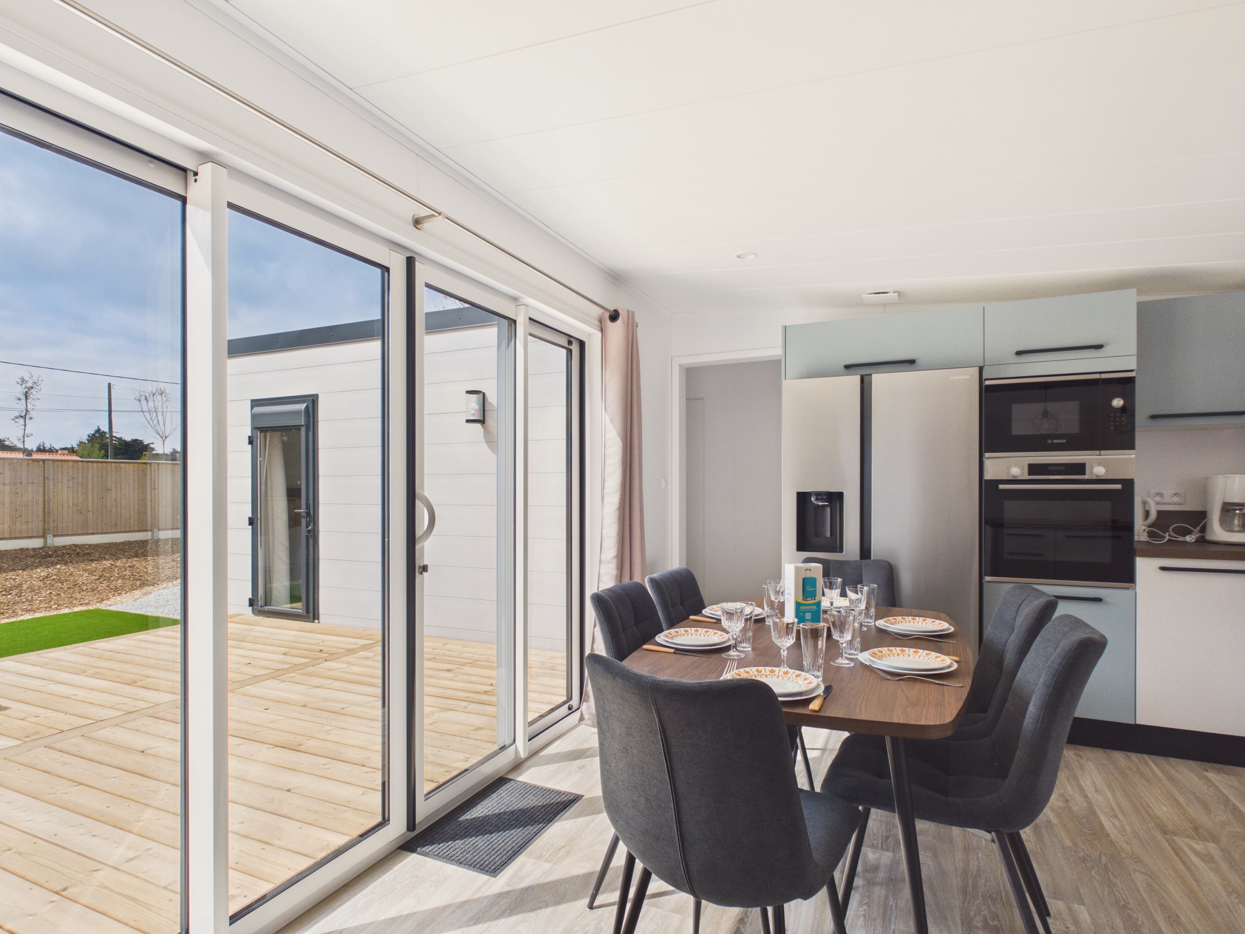 En el interior, nada más entrar en el chalet descubrirá una estancia luminosa y acogedora. Se compone de un salón confortable con un sofá en forma de L, un sillón y una televisión, ideal para relajarse después de un día en la playa. En prolongación, el espacio comedor dispone de una mesa que puede acoger hasta 6 comensales. La cocina americana abierta, moderna y funcional, está completamente equipada: placas de inducción, frigorífico, congelador, horno, microondas, lavavajillas, cafetera de filtro, tostadora, hervidor, así como una segunda mesa alta con dos taburetes, perfecta para desayunos rápidos. Un gran ventanal ilumina el conjunto y ofrece un acceso directo a la terraza.