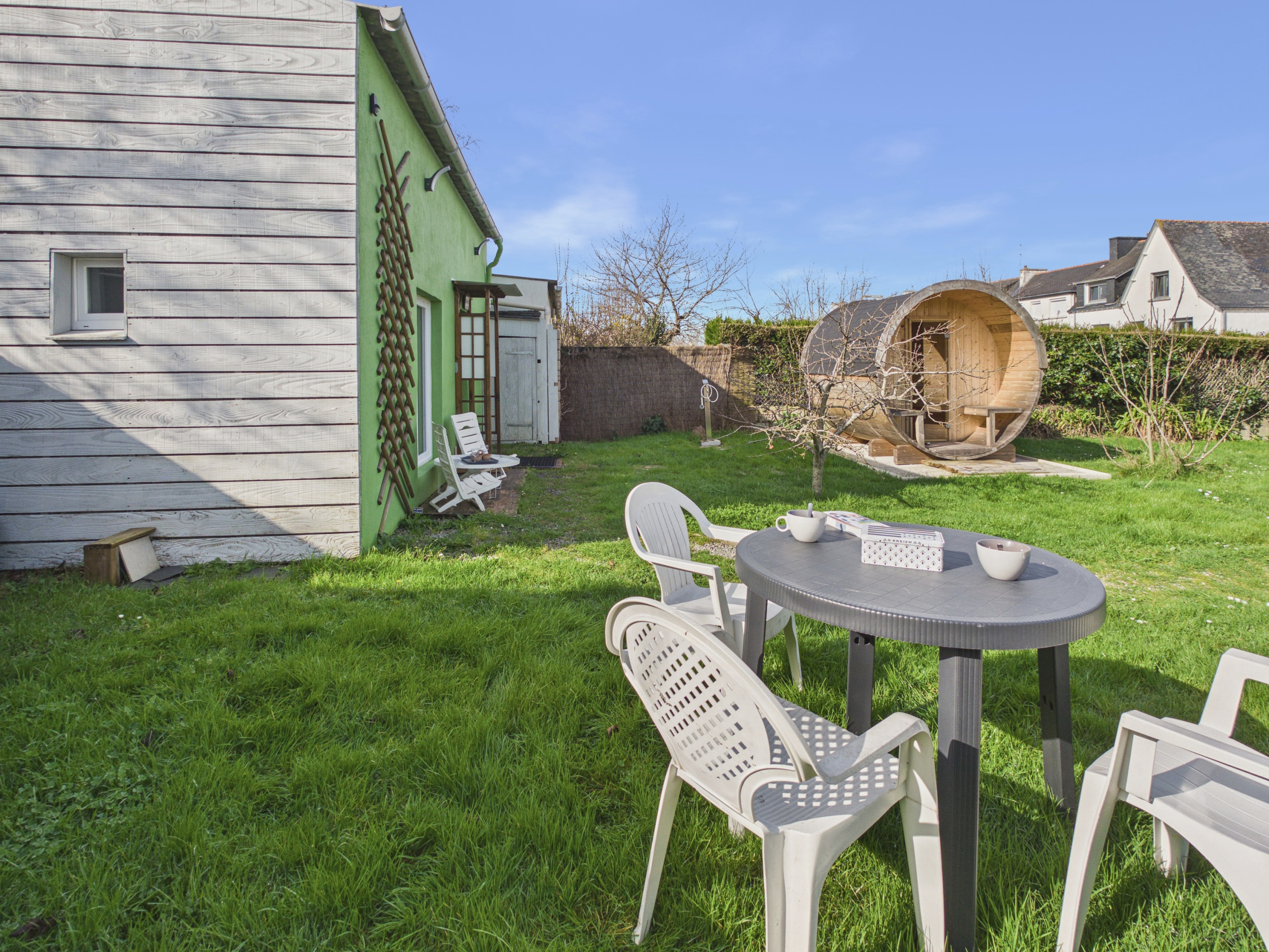 En el interior, descubra una hermosa sala de estar funcional y acogedora. La cocina, completamente equipada (placas de inducción, horno, microondas, refrigerador), le permite preparar sus comidas como en casa. Para sus desayunos, también dispondrá de una tostadora, una hervidor y una cafetera Nespresso. Para comer, tendrá la opción de la mesa interior o la mesa exterior en el jardín.