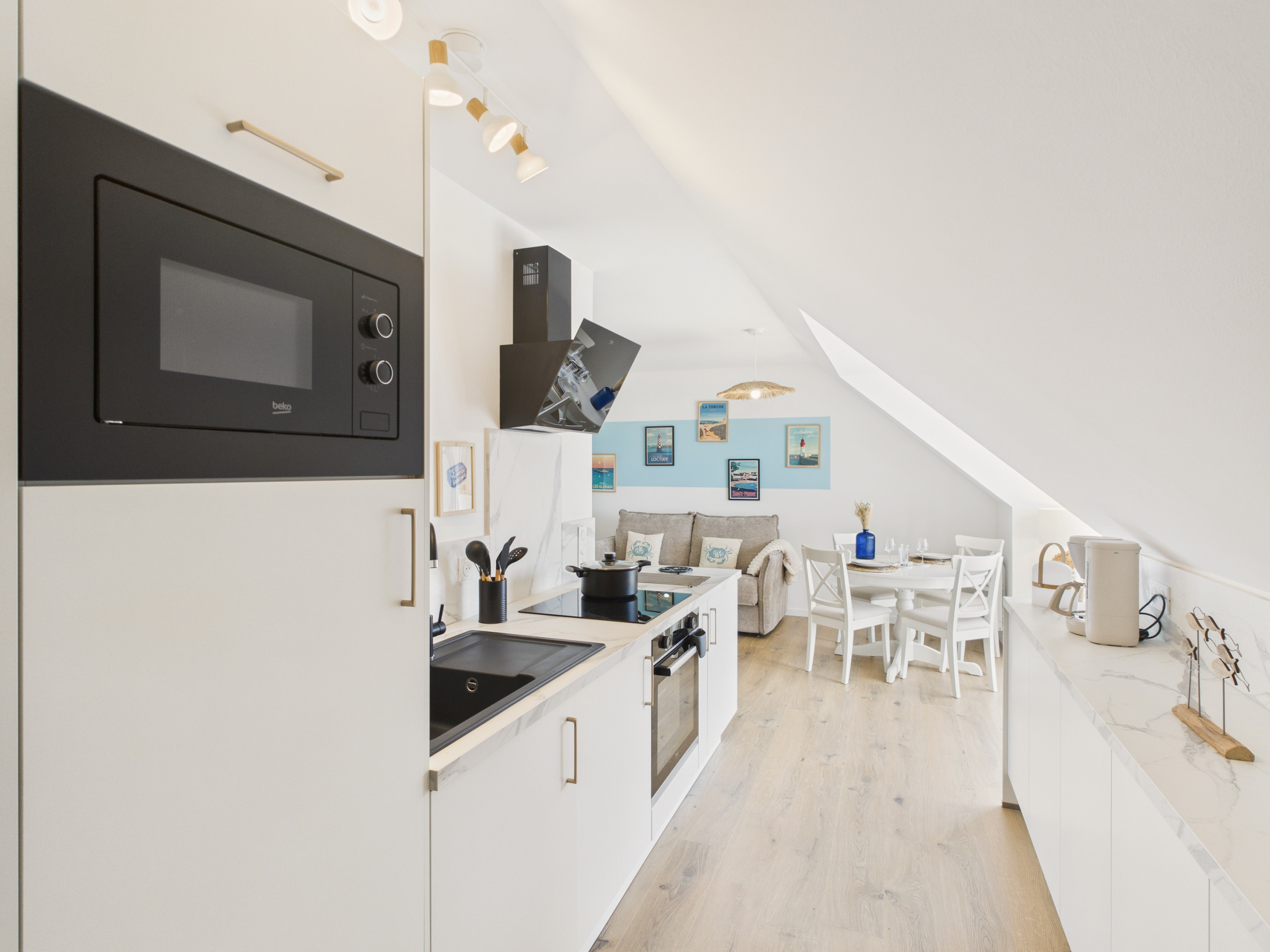 Pase por la puerta de entrada y descubra una hermosa sala de estar moderna, bellamente decorada, que da acceso a un balcón con vista al puerto. La cocina abierta está completamente equipada (refrigerador, horno, microondas, placas de inducción) y le ofrece todo lo necesario para preparar sus comidas. Para el desayuno, también tiene a su disposición una hervidor, una tostadora y una cafetera de filtro. Comparta sus comidas alrededor de la mesa de comedor o disfrute de la del balcón en los días soleados. En cuanto al descanso, siéntese cómodamente en el sofá frente a la televisión.