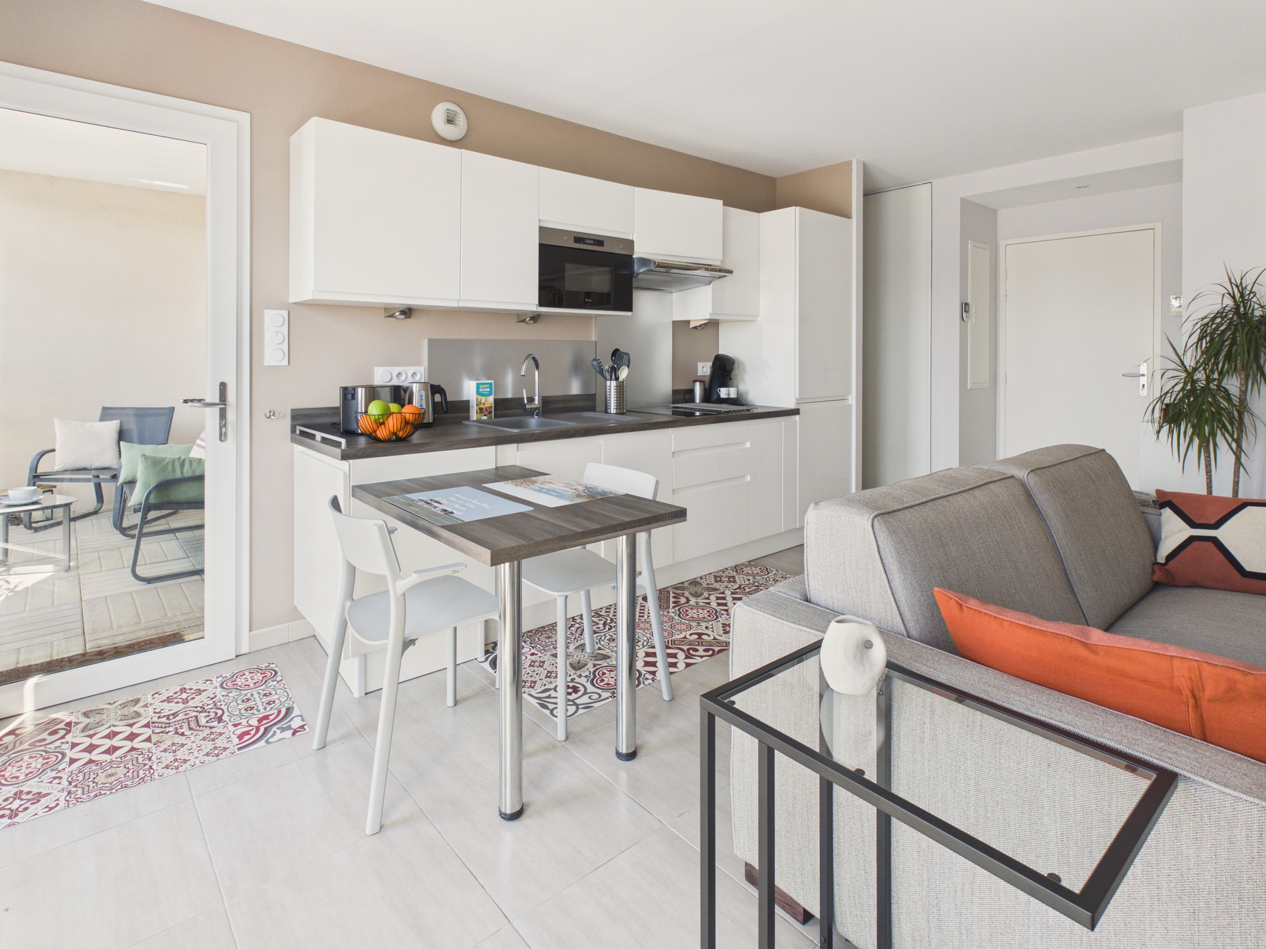 L'appartement, décoré avec goût, vous séduira par sa luminosité et sa modernité. Vous y trouverez tout le nécessaire pour un séjour réussi : une pièce de vie agréable, avec un coin salon équipé d'une télévision, que vous pourrez transformer, le soir venu, en coin nuit ; une cuisine ouverte entièrement équipée comprenant des plaques à induction, un réfrigérateur, un micro-ondes, un four, un congélateur, un lave-vaisselle, une cafetière Nespresso, un grille-pain et une bouilloire.