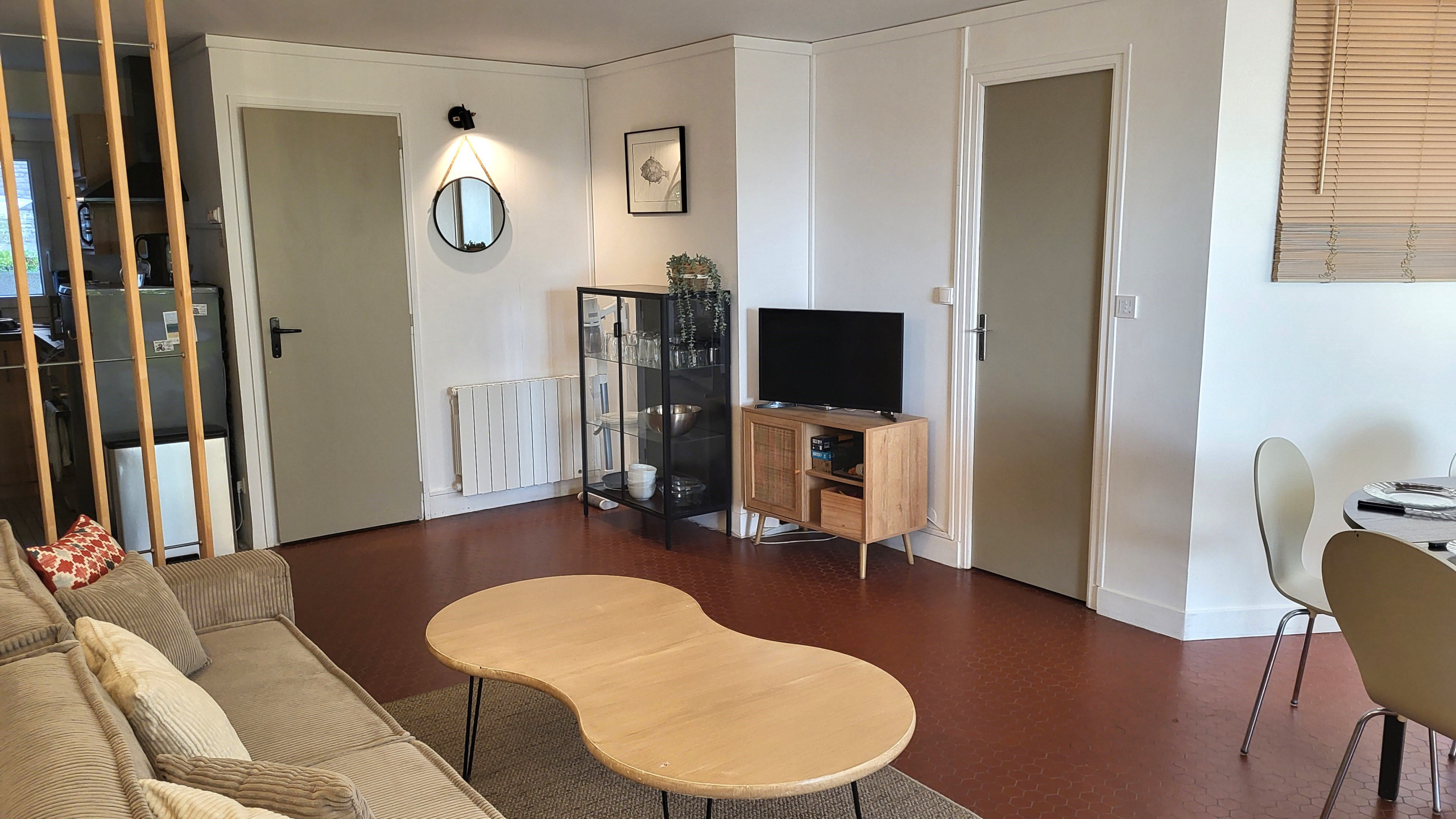 Le logement de 54 m² est accueillant et sa grande baie vitrée vous permet de profiter du bleu de l'océan à tout moment. Vous trouverez une cuisine indépendante moderne, très bien équipée (plaques à induction, réfrigérateur, micro-ondes, four, lave-vaisselle, cafetière à filtre, grille-pain et bouilloire) puis l'espace salle à manger où vous aimerez partager de bons mets et enfin un coin salon cosy où vous retrouver en fin de soirée devant un film à la télé.