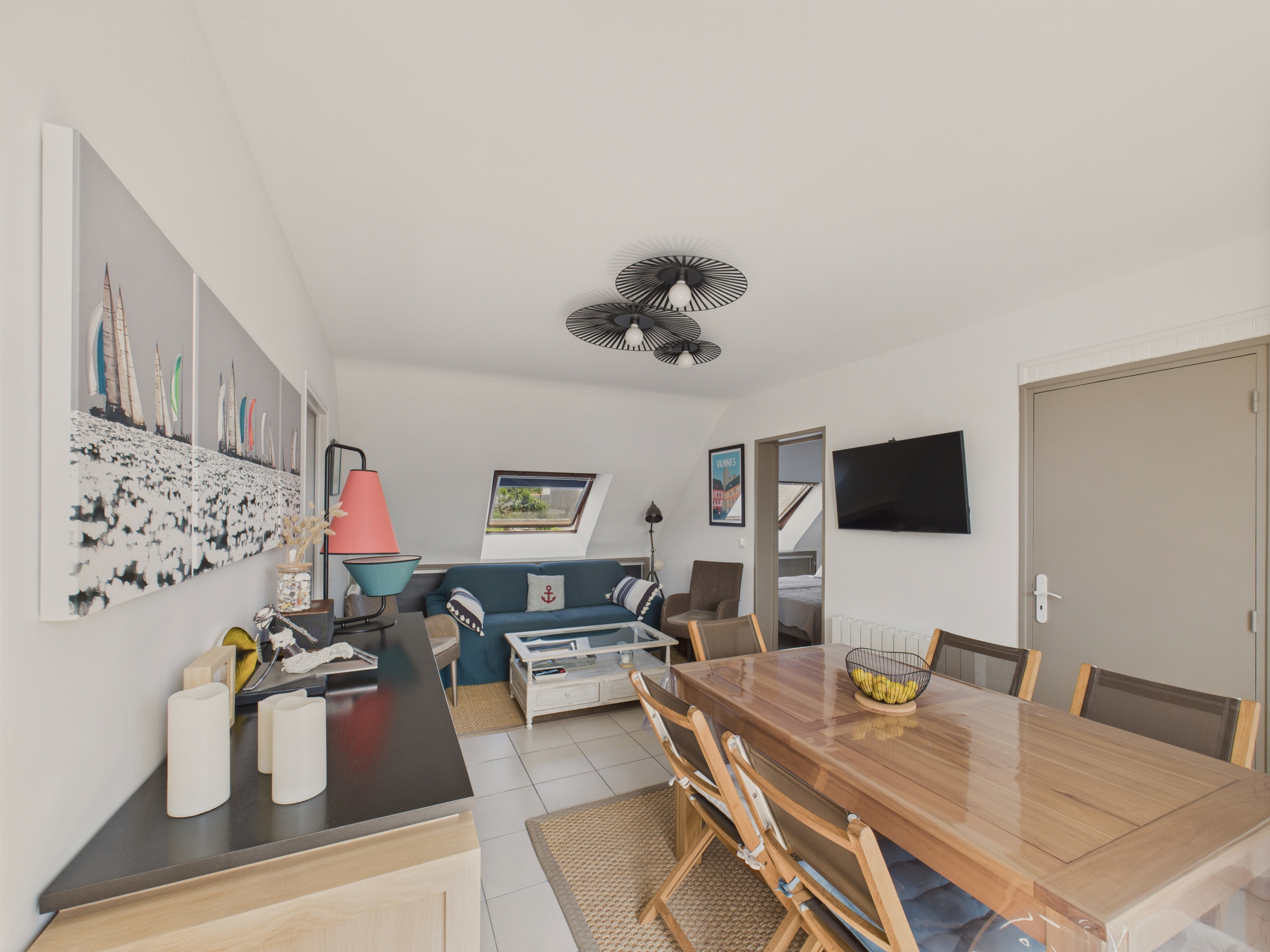 Passez la porte d’entrée et découvrez une agréable pièce de vie lumineuse avec accès direct à la terrasse grâce à une grande baie vitrée. La cuisine, moderne et ouverte, est entièrement équipée (réfrigérateur, congélateur, four, micro-ondes, lave-vaisselle) et vous offre tout le nécessaire pour cuisiner comme à la maison. Pour vos petits-déjeuners, une bouilloire, un grille-pain et une cafetière à filtre sont à votre disposition. Partagez vos repas autour de la table pour 4 personnes ou profitez de la terrasse aménagée lors des beaux jours. En soirée, détendez-vous dans le salon cosy, confortablement installés sur le canapé face à la télévision.