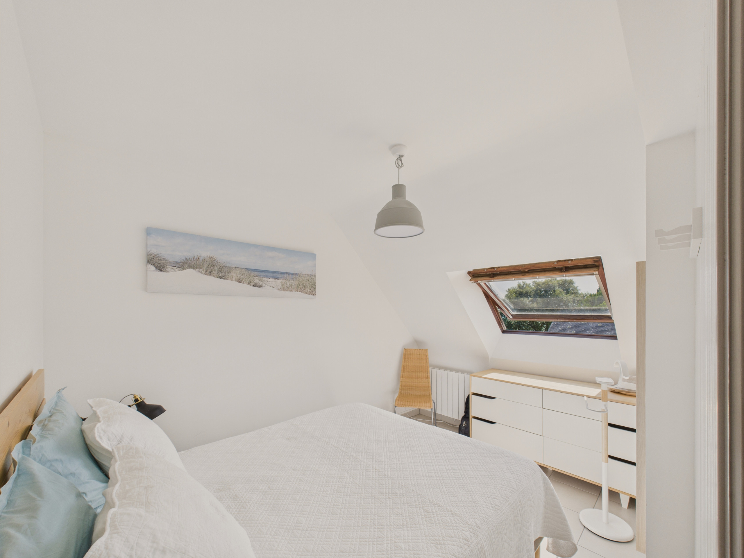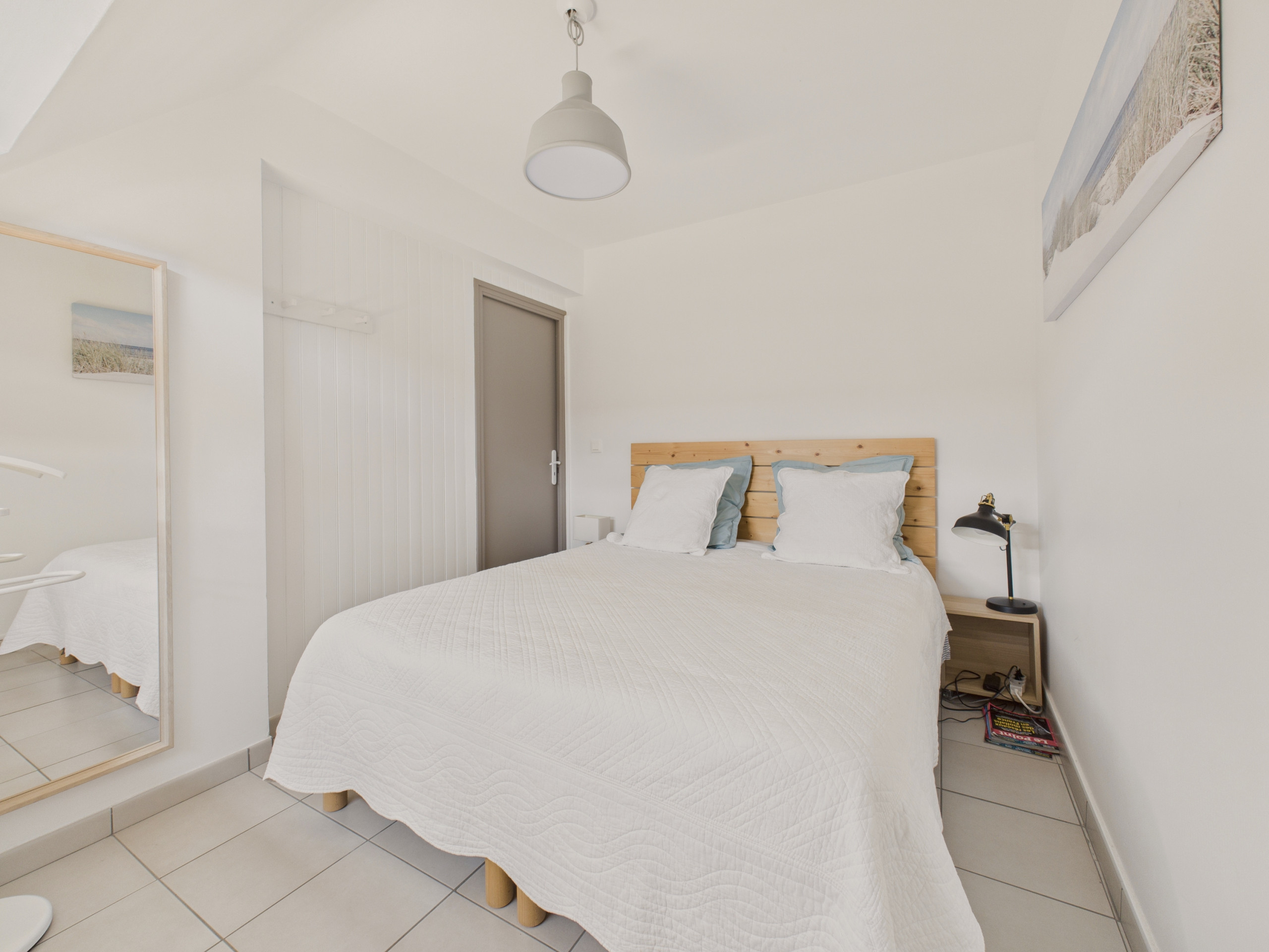 Le logement dispose de deux chambres : la première est équipée d’un lit double (140x190 cm) et d’une commode ; la seconde de deux lits simples (90x190 cm) et d’une penderie.