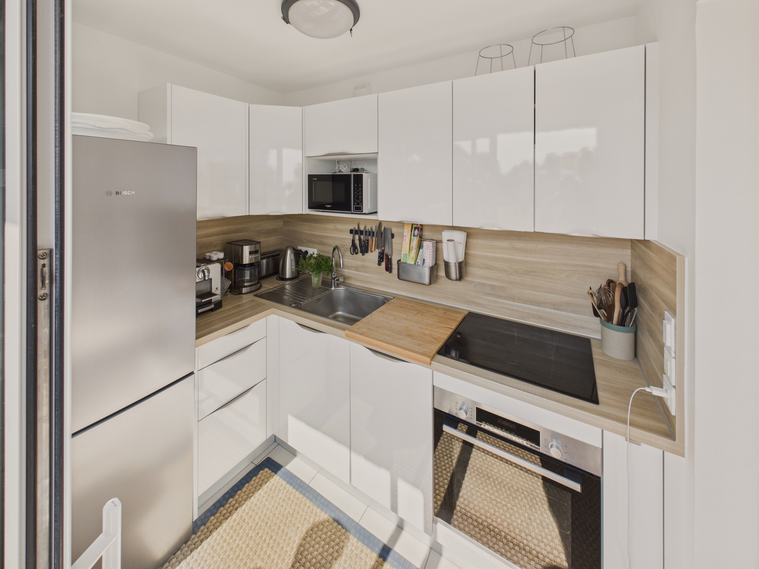 Passez la porte d’entrée et découvrez une agréable pièce de vie ouverte sur le balcon. La cuisine, indépendante, est entièrement équipée (réfrigérateur, congélateur, four, micro-ondes, lave-vaisselle) et vous offre tout le nécessaire pour cuisiner comme à la maison. Partagez vos repas autour de la table à manger pour 4 personnes ou profitez de celle du balcon lorsque le temps le permet. Le soir, retrouvez-vous dans le coin salon, confortablement installés dans le canapé face à la télévision.