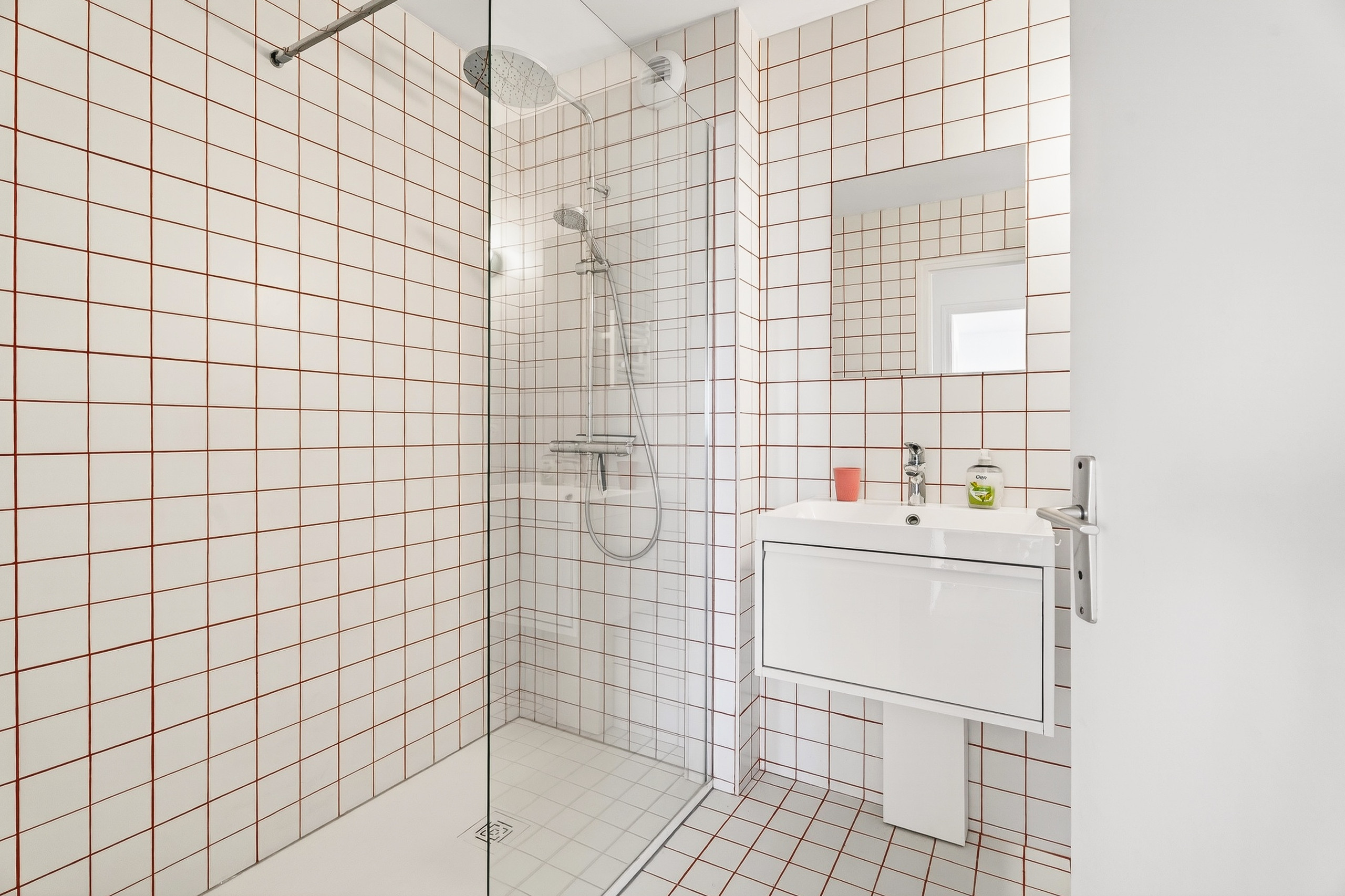 Une salle d’eau avec douche et sèche-cheveux ainsi qu’un WC séparé complètent le logement.