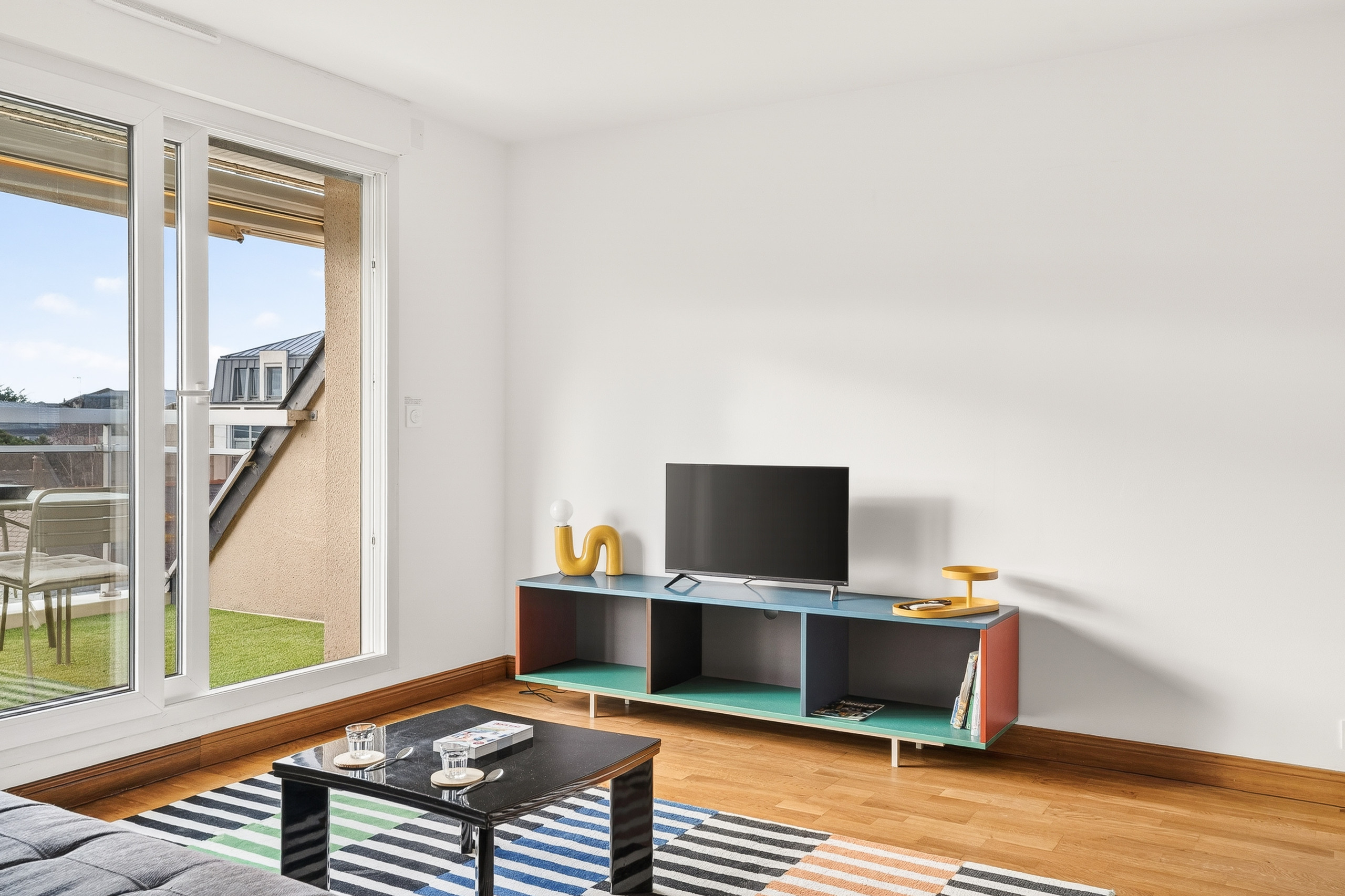 Dès votre arrivée, vous serez accueilli dans une pièce de vie lumineuse. Le salon, composé d’un canapé confortable et d’une télévision, invite à la détente. Une grande baie vitrée apporte une belle clarté naturelle et donne accès à une terrasse de 14 m² exposée Ouest, parfait pour profiter d’un apéritif au soleil courant. L’espace salle à manger, situé de l’autre côté de la pièce, dispose d’une table pouvant accueillir jusqu’à 4 personnes.
