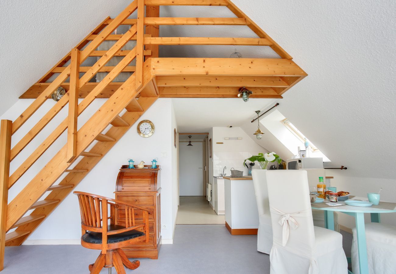 C’est dans un charmant cocon de 33m2 niché sous les toits d'Erquy que nous vous proposons de séjourner à 4 personnes. Situé côté cour, au calme, vous serez tout de suite séduits par la luminosité et la vue mer du balcon de cet appartement au 2eme étage de sa résidence. Ses sous pentes et sa mezzanine vous donnerons le sentiment de vous retrouve dans un véritable petit nid douillet.