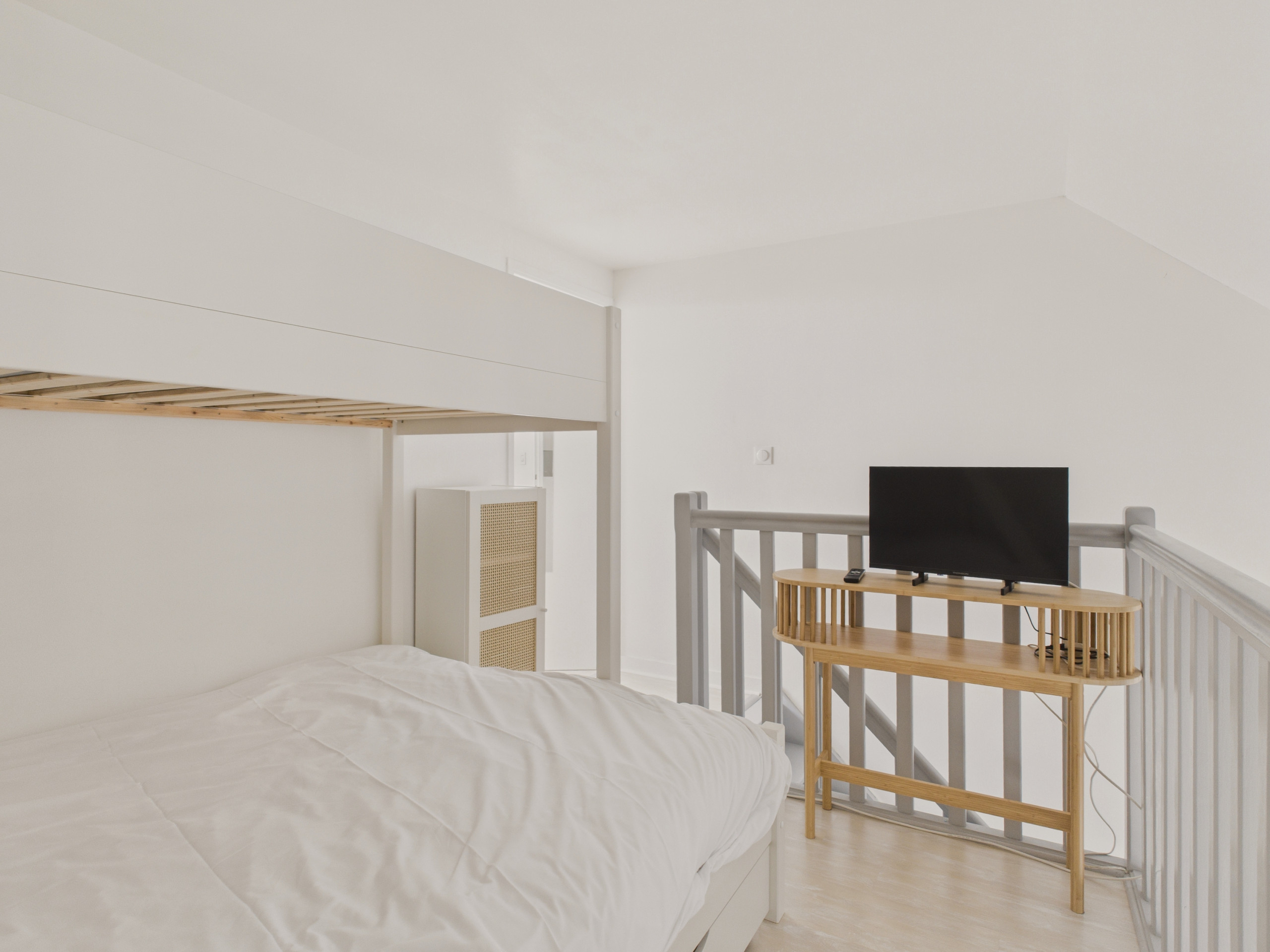 Vous découvrirez également la mezzanine qui dispose d’un lit superposé composé d’un lit double en bas (140x190) et d’un lit simple en haut (90x190).