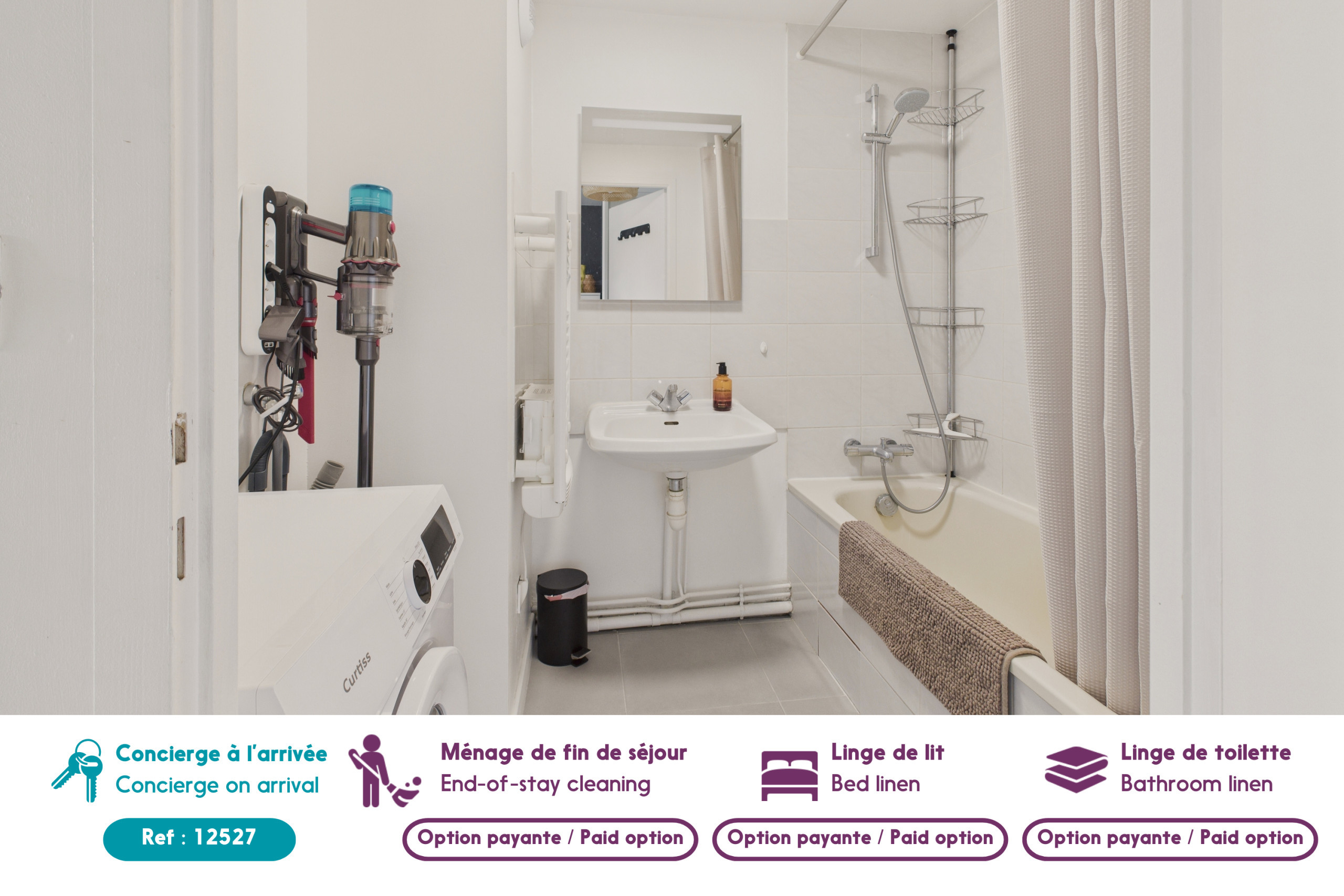 Dès votre arrivée dans cet appartement, vous découvrirez une agréable pièce de vie comprenant un canapé, une table à manger et une cuisine ouverte. Entièrement équipée, celle-ci dispose de tout le nécessaire pour cuisiner : four, micro-ondes, lave-vaisselle, bouilloire, grille-pain et cafetière Nespresso.