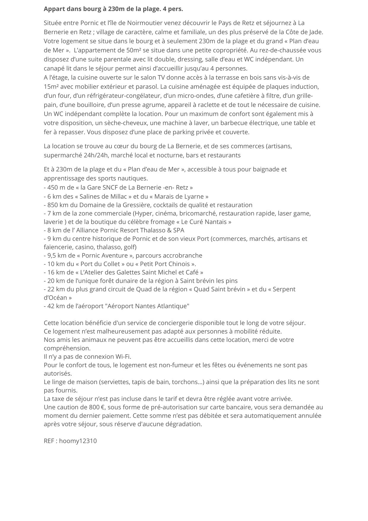 Votre logement se situe dans le bourg et à seulement 230m de la plage et du grand « Plan d’eau de Mer ». L’appartement de 50m² se situe dans une petite copropriété. Au rez-de-chaussée vous disposez d’une suite parentale avec lit double, dressing, salle d’eau et WC indépendant. Un canapé lit dans le séjour permet ainsi d’accueillir jusqu'à 4 personnes.