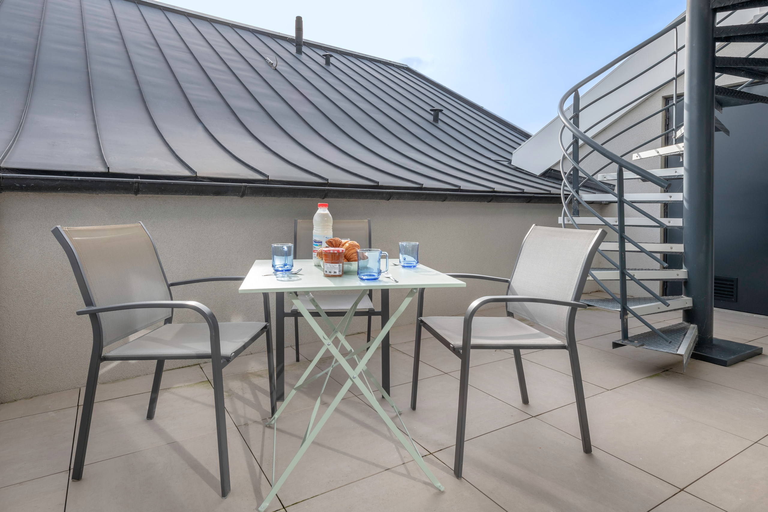 Depuis l’un des balcons, un escalier en colimaçon vous mène à la terrasse, où un salon de jardin vous attend pour un moment de détente. Vous y trouverez également un espace idéal pour un couple, comprenant une chambre avec un lit double (140/190) et une salle d’eau privative.