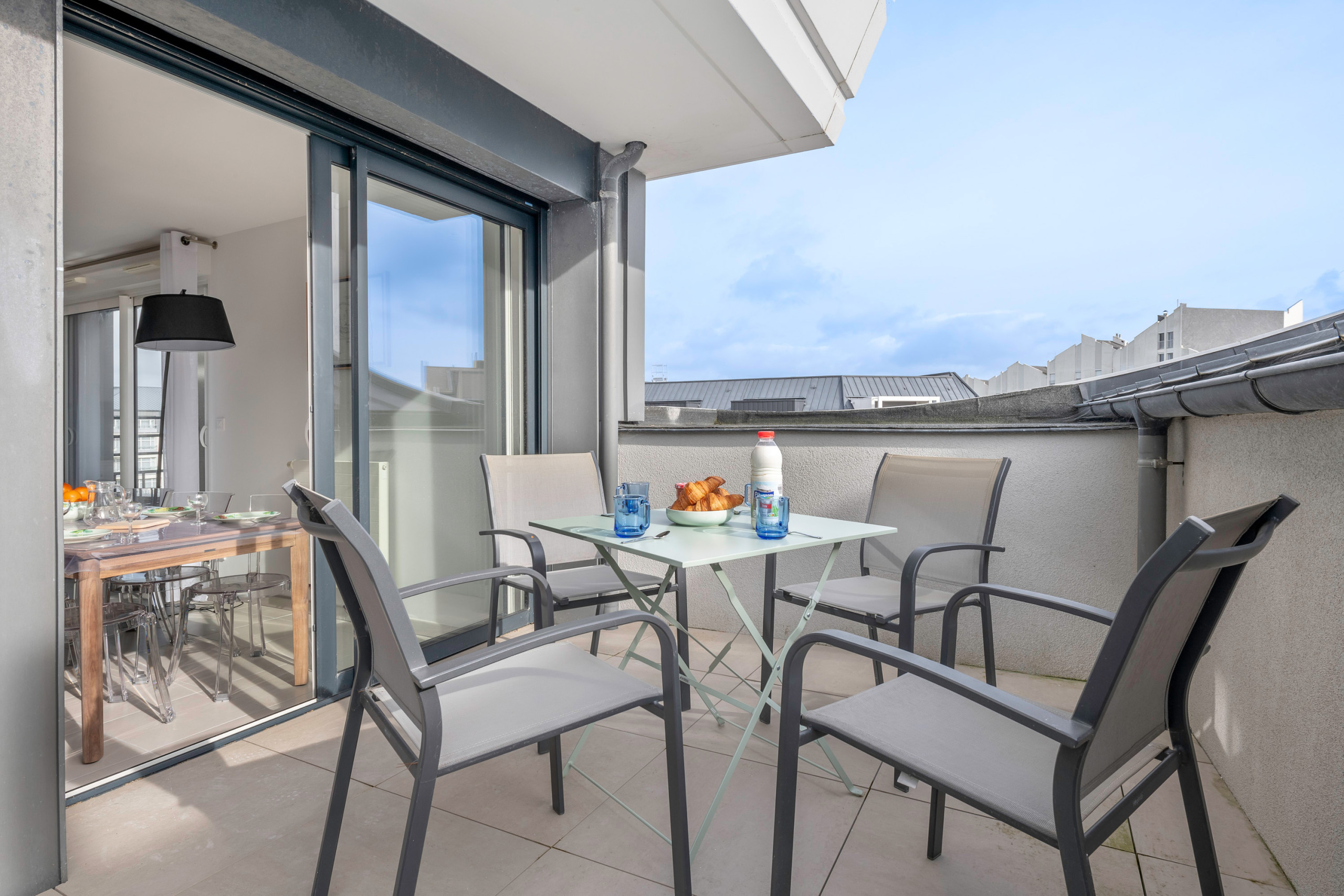 Situé au 4ᵉ étage de l’immeuble (avec ascenseur), l’appartement offre une belle vue dégagée sur le ciel ainsi que deux espaces extérieurs. Au premier niveau, vous trouverez deux balcons : le premier est parfait pour savourer un petit-déjeuner en plein air. Il donne sur la pièce de vie, composée d’un salon cosy avec un canapé confortable pour une pause TV, d’une salle à manger conviviale et d’une cuisine américaine moderne entièrement équipée : plaque à induction, réfrigérateur, micro-ondes, four, congélateur, lave-vaisselle, cafetière Nespresso, cafetière à filtre, grille-pain et bouilloire.