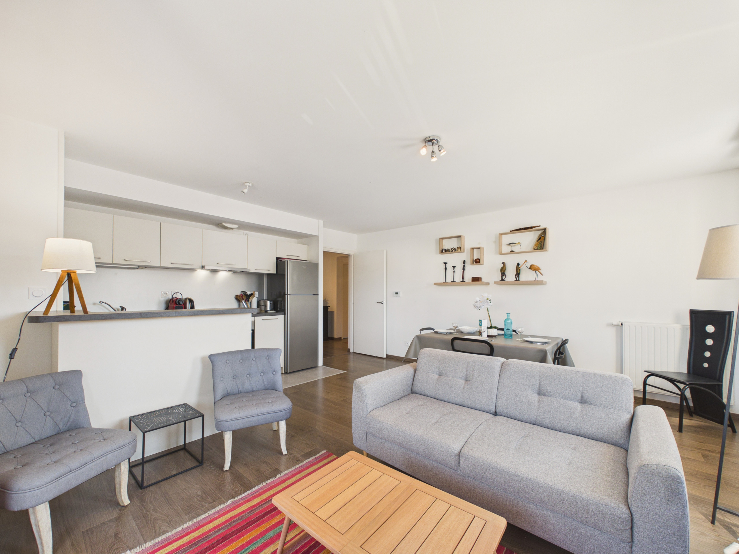 Vous accéderez à l’appartement par l’impasse des Coquelicots. Une fois à l'intérieur, vous découvrirez la pièce de vie comprenant la salle à manger, un salon équipé d'un canapé-lit et d'une télévision, ainsi qu'une cuisine ouverte. Celle-ci est entièrement équipée avec un four, un micro-ondes, un réfrigérateur/congélateur, un lave-vaisselle, un grille-pain, une cafetière à filtre, ainsi que tous les ustensiles nécessaires pour cuisiner.
