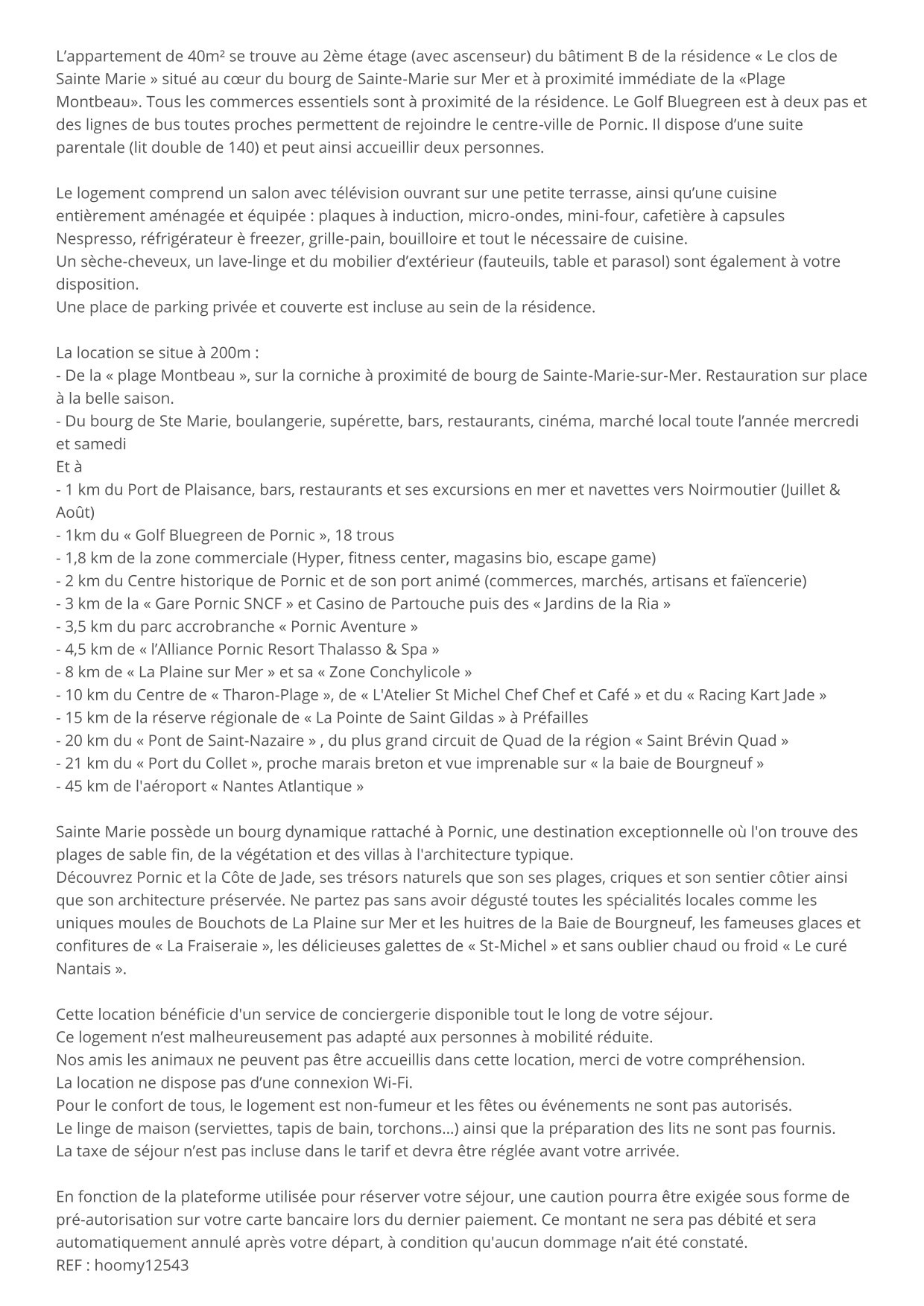 L’appartement de 40m² se trouve au 2ème étage (avec ascenseur) du bâtiment B de la résidence « Le clos de Sainte Marie » situé au cœur du bourg de Sainte-Marie sur Mer et à proximité immédiate de la «Plage Montbeau». Tous les commerces essentiels sont à proximité de la résidence. Le Golf Bluegreen est à deux pas et des lignes de bus toutes proches permettent de rejoindre le centre-ville de Pornic. Il dispose d’une suite parentale (lit double de 140) et peut ainsi accueillir deux personnes.