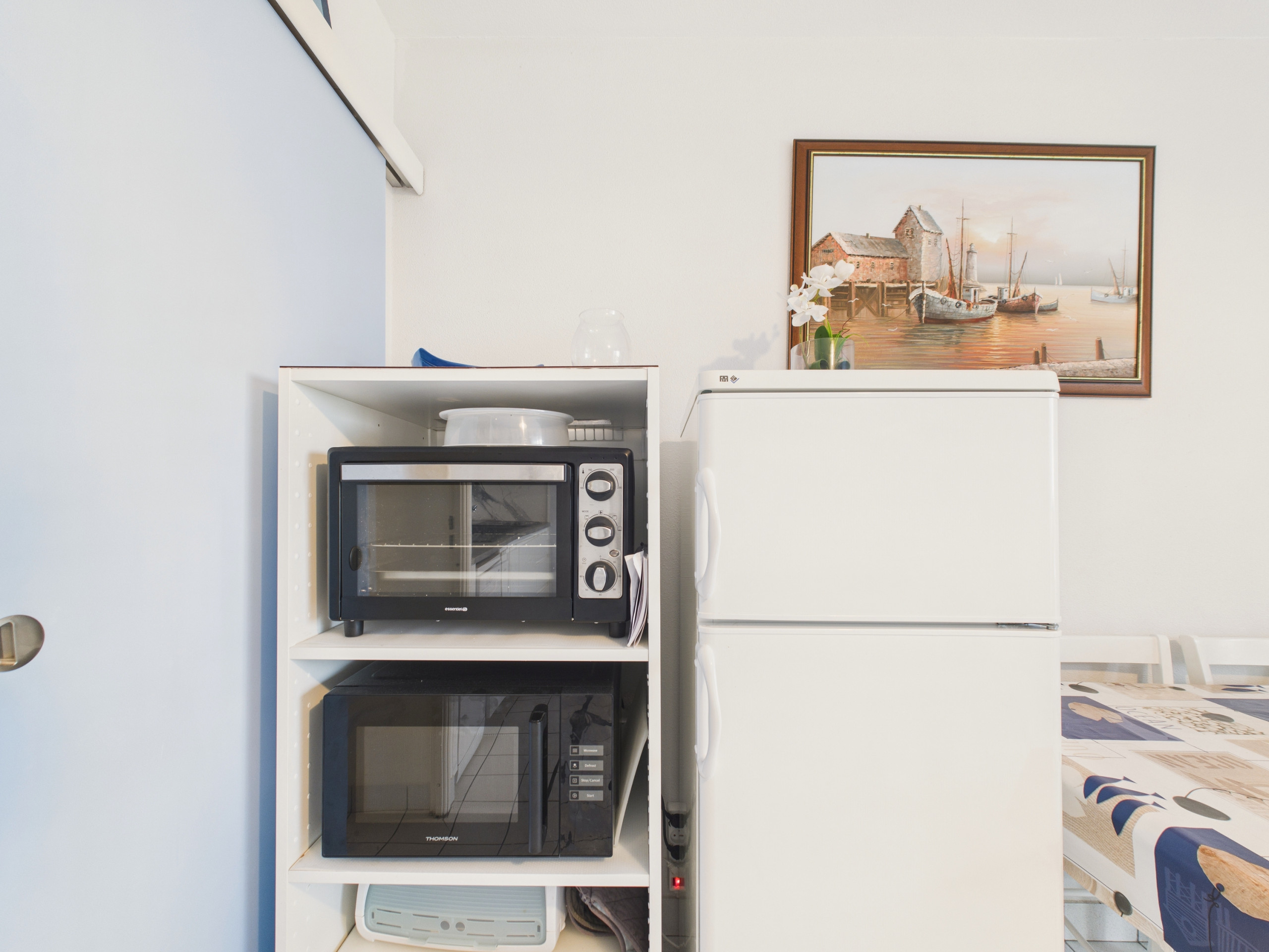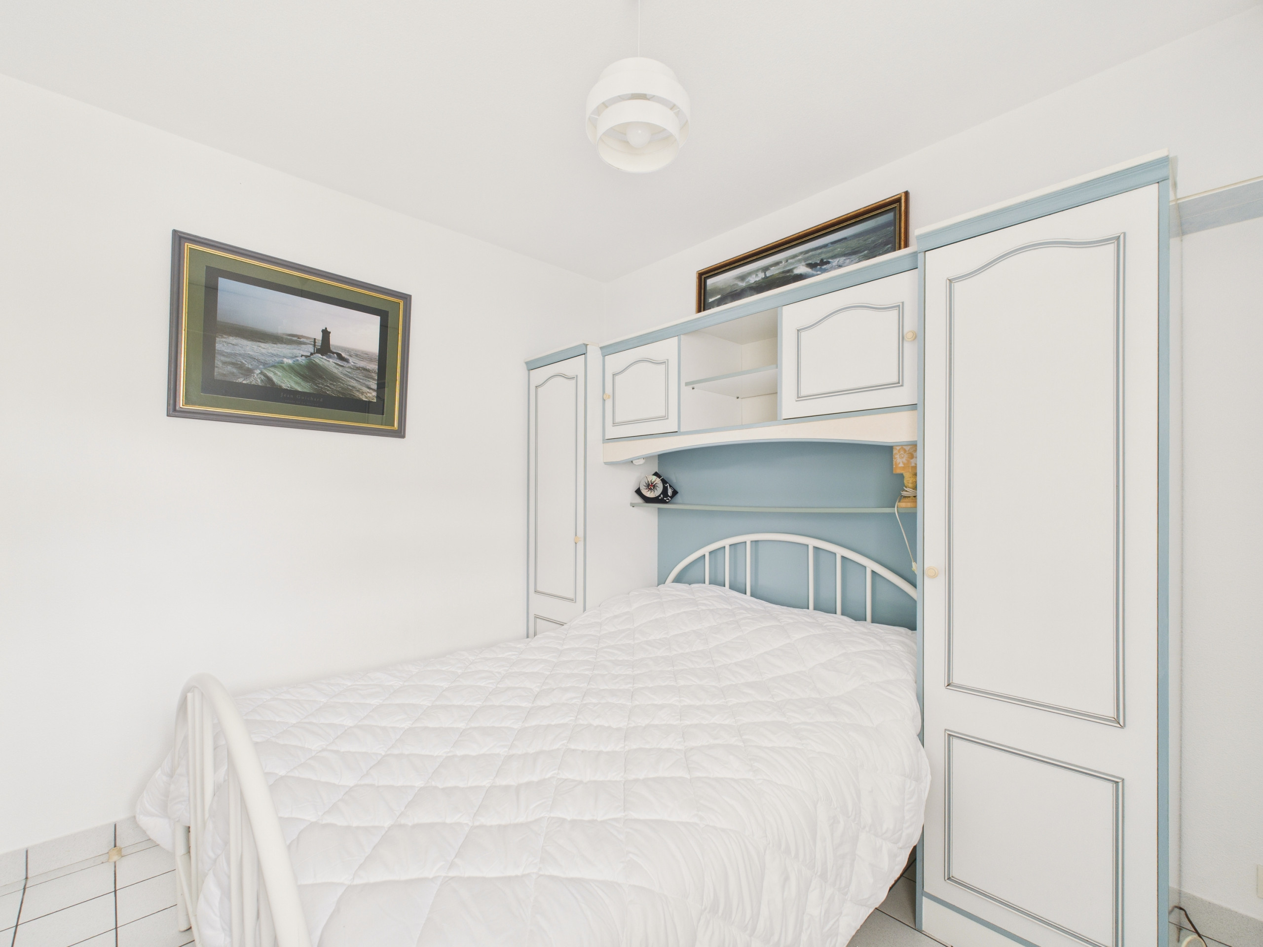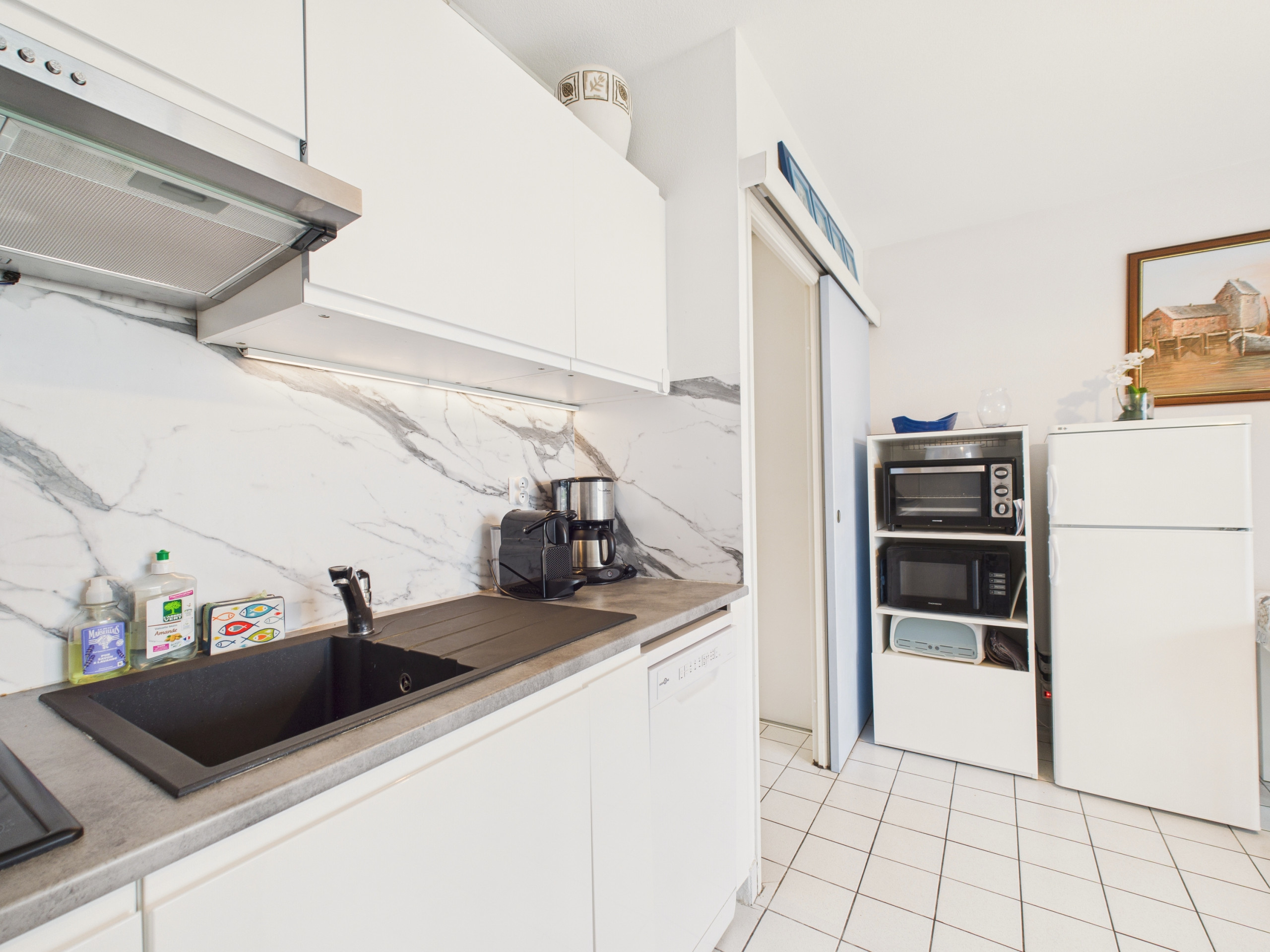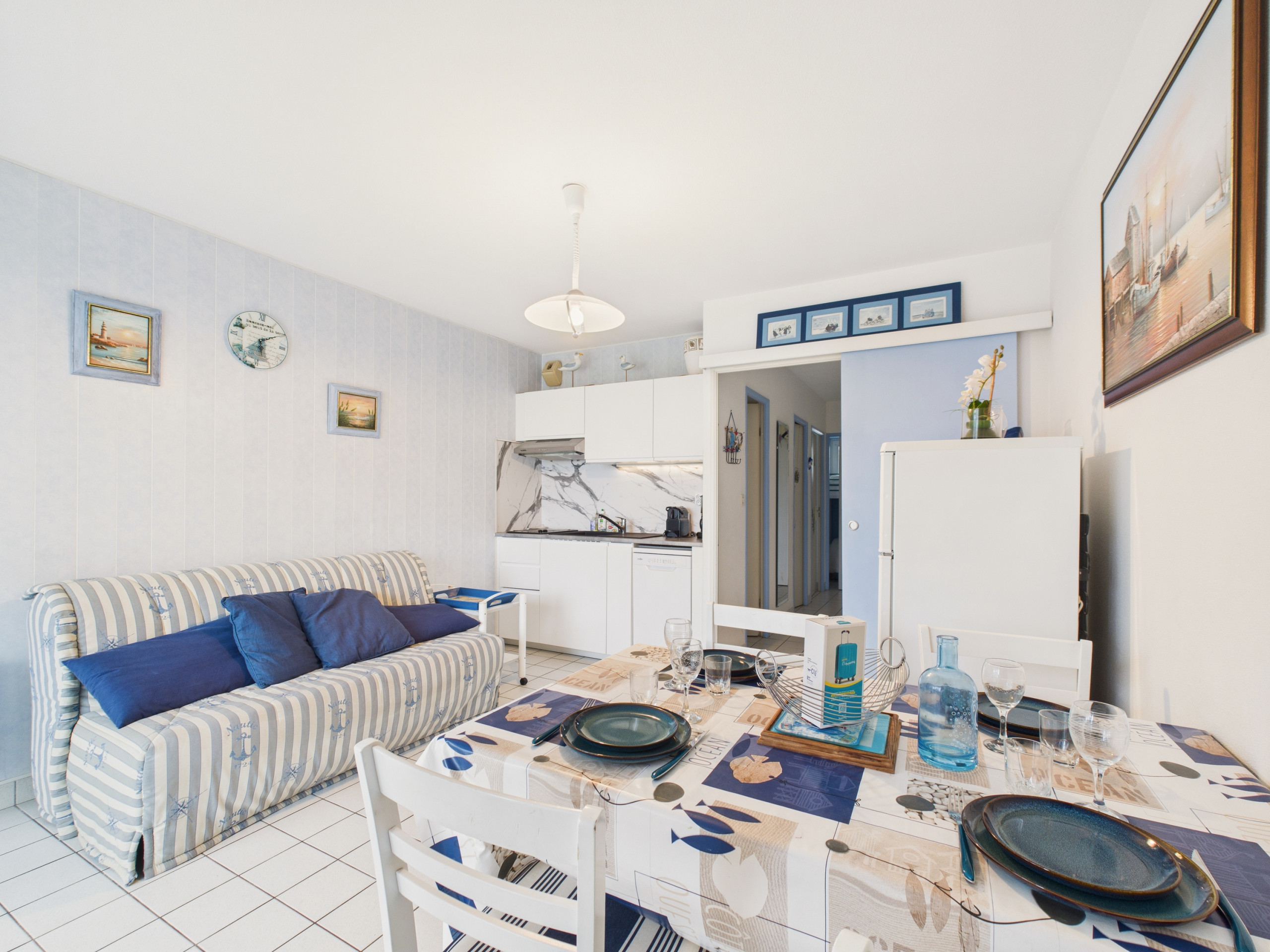 Dès votre entrée dans l'appartement, vous découvrirez une agréable pièce de vie réunissant cuisine, salle à manger et salon. Le salon est aménagé avec un canapé confortable et une télévision, parfait pour vos moments de détente après une journée à la plage. La grande porte-fenêtre apporte une belle luminosité à l’espace et offre une superbe vue sur la mer, tout en donnant accès à la terrasse.