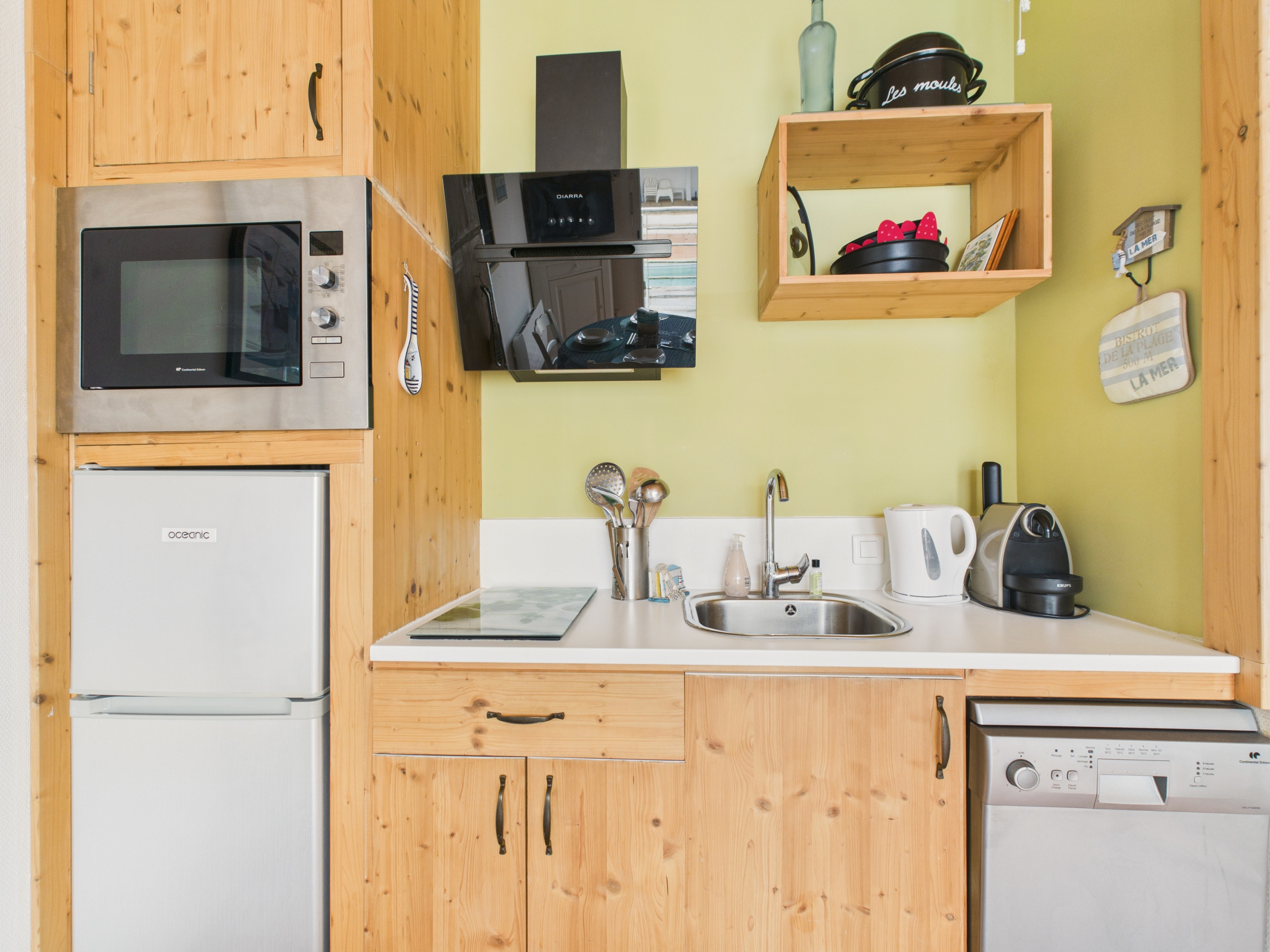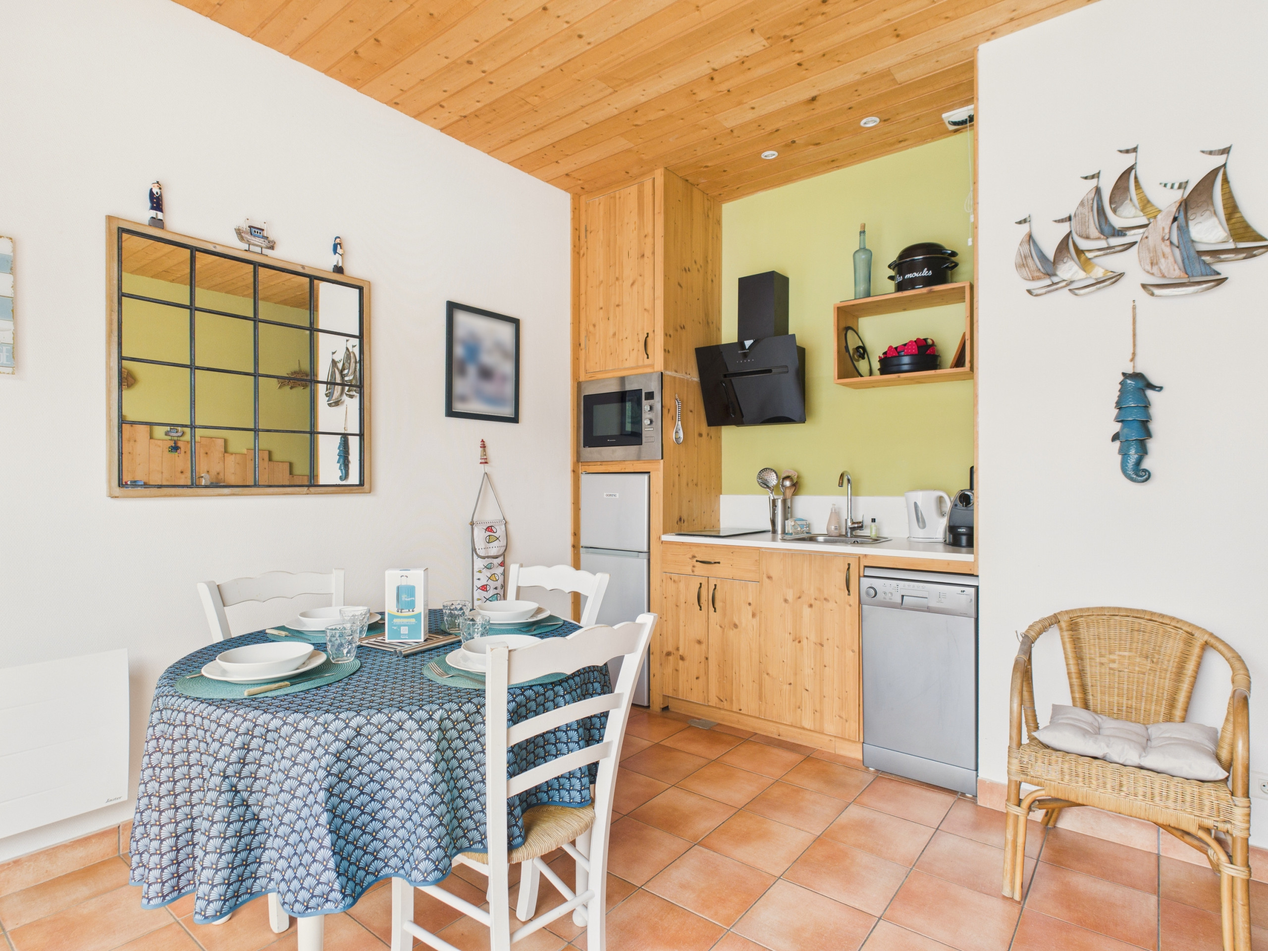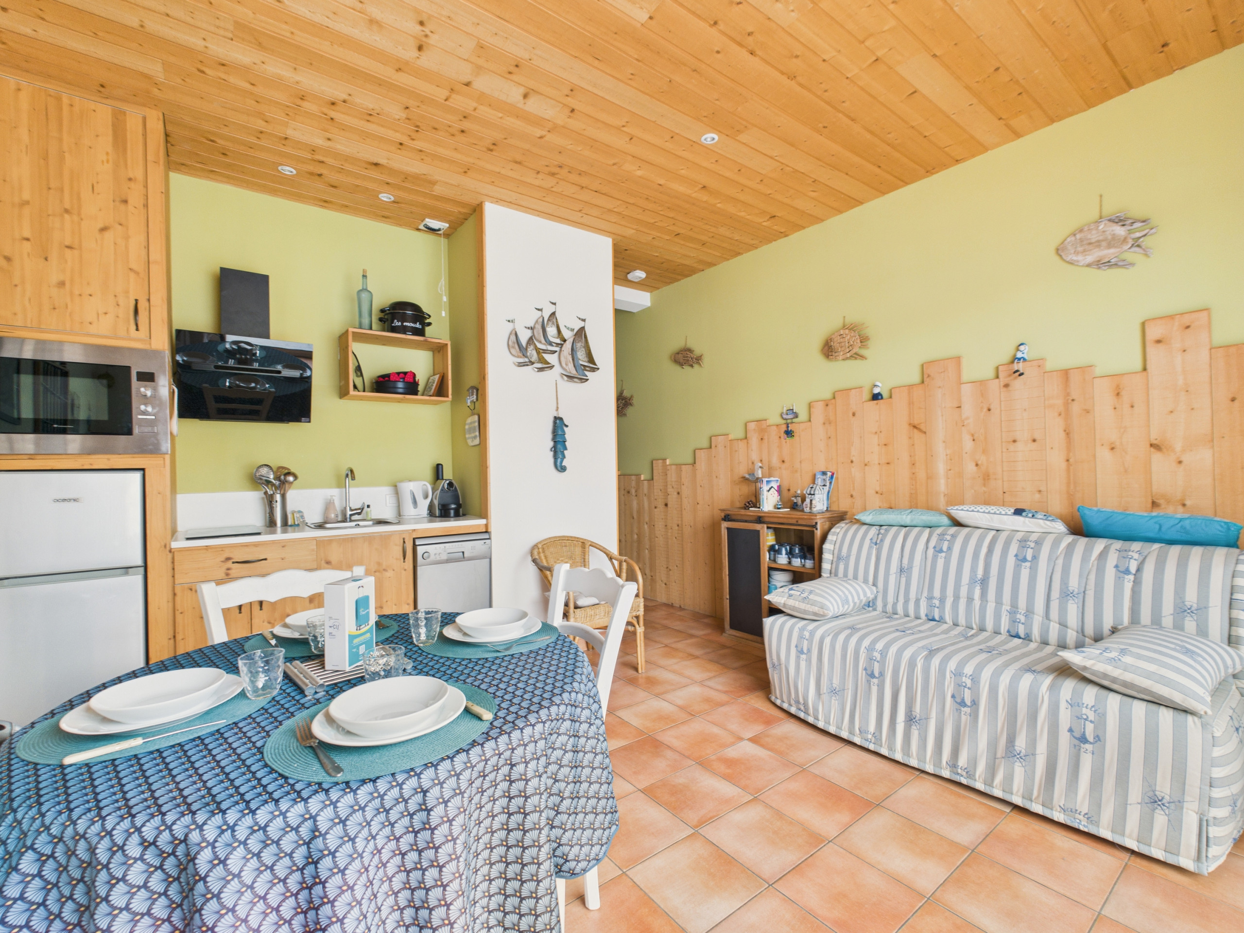 Vous trouverez une cuisine bien équipée (plaques à induction, réfrigérateur, micro-ondes, congélateur, lave-vaisselle, cafetière, grille-pain, bouilloire, hotte inclinée et presse-agrumes) pour y préparer de bons repas. Elle est ouverte sur une table ronde où vous aimerez vous réunir pour savourer ces délicieux plats et passer des moments de rire. Ensuite, le salon vous permettra une pause devant la télévision. Le soir venu, vous pourrez déplier le canapé pour vous y blottir pour la nuit. Enfin, vous trouverez une chambre avec un lit double aux tons clairs et une salle d'eau pour vous accorder une bonne douche après votre retour de plage.