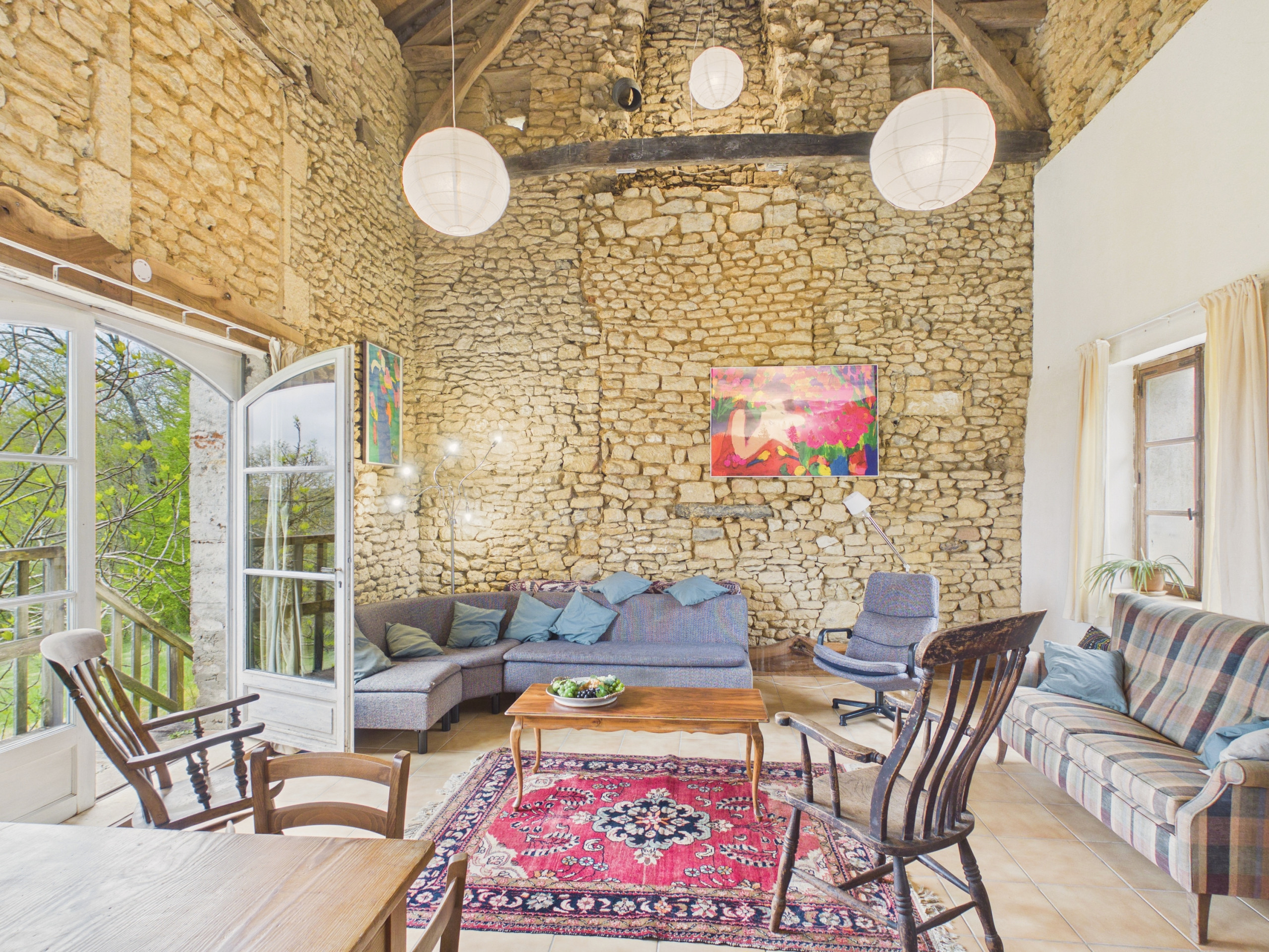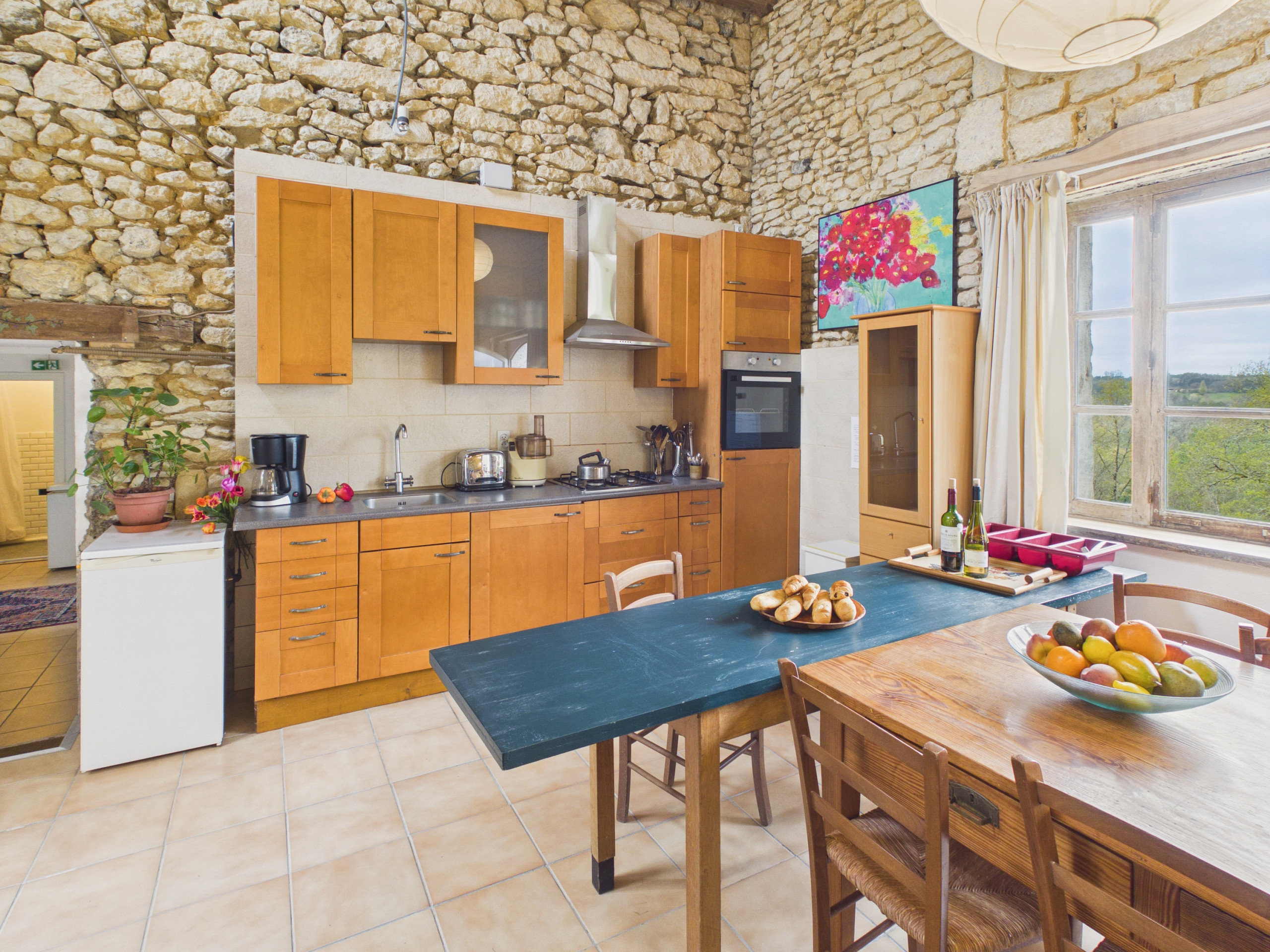 Dès votre arrivée, vous découvrirez la grande et charmante pièce de vie avec sa hauteur sous plafond et ses murs en pierre, il y a son coin salon avec les canapés et l’accès au jardin. Il y a également une grande table à manger conviviale et la cuisine ouverte juste derrière. Entièrement équipée, elle dispose du nécessaire pour cuisiner ainsi qu’un four, une bouilloire, un grille-pain et une cafetière à filtre.