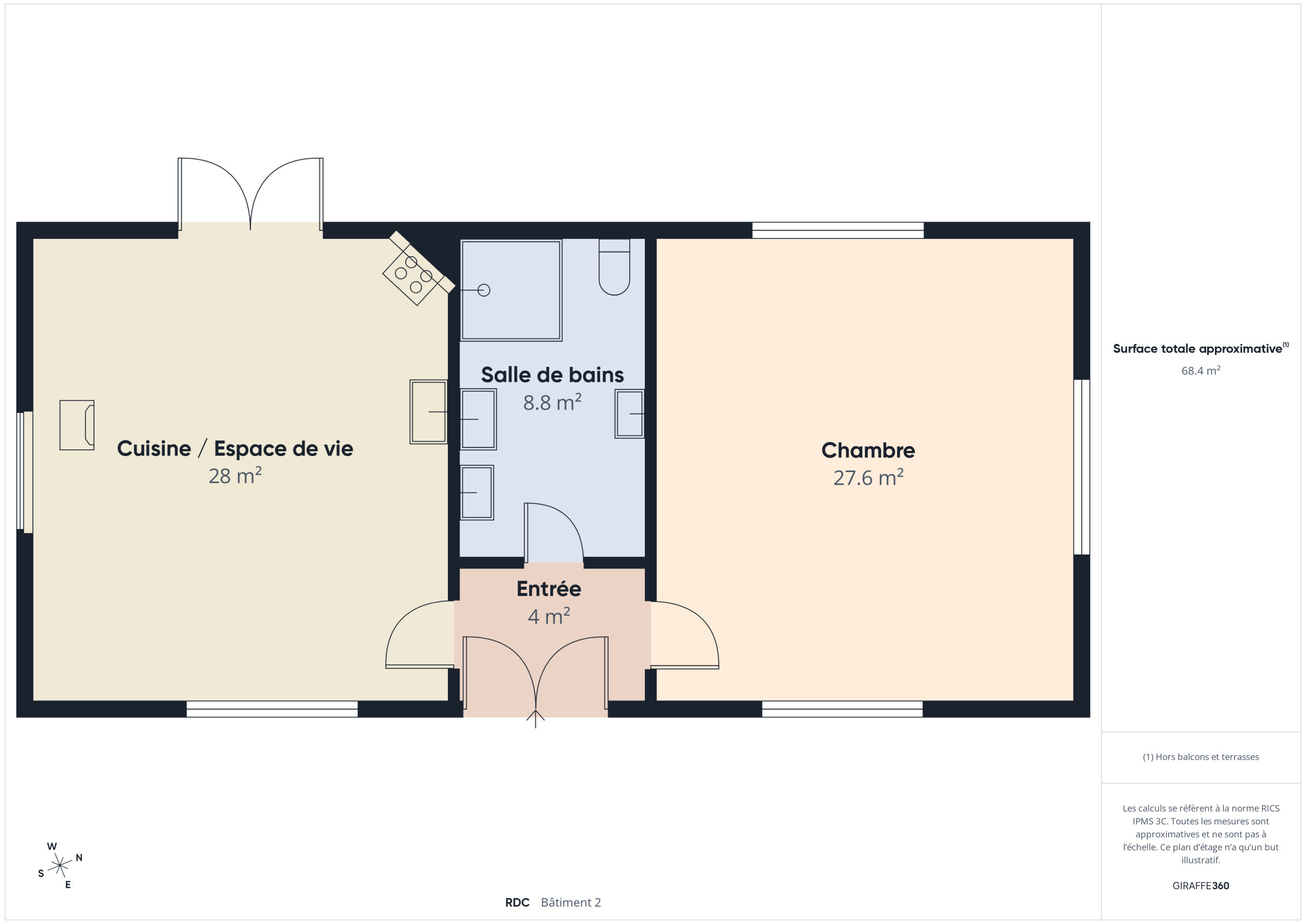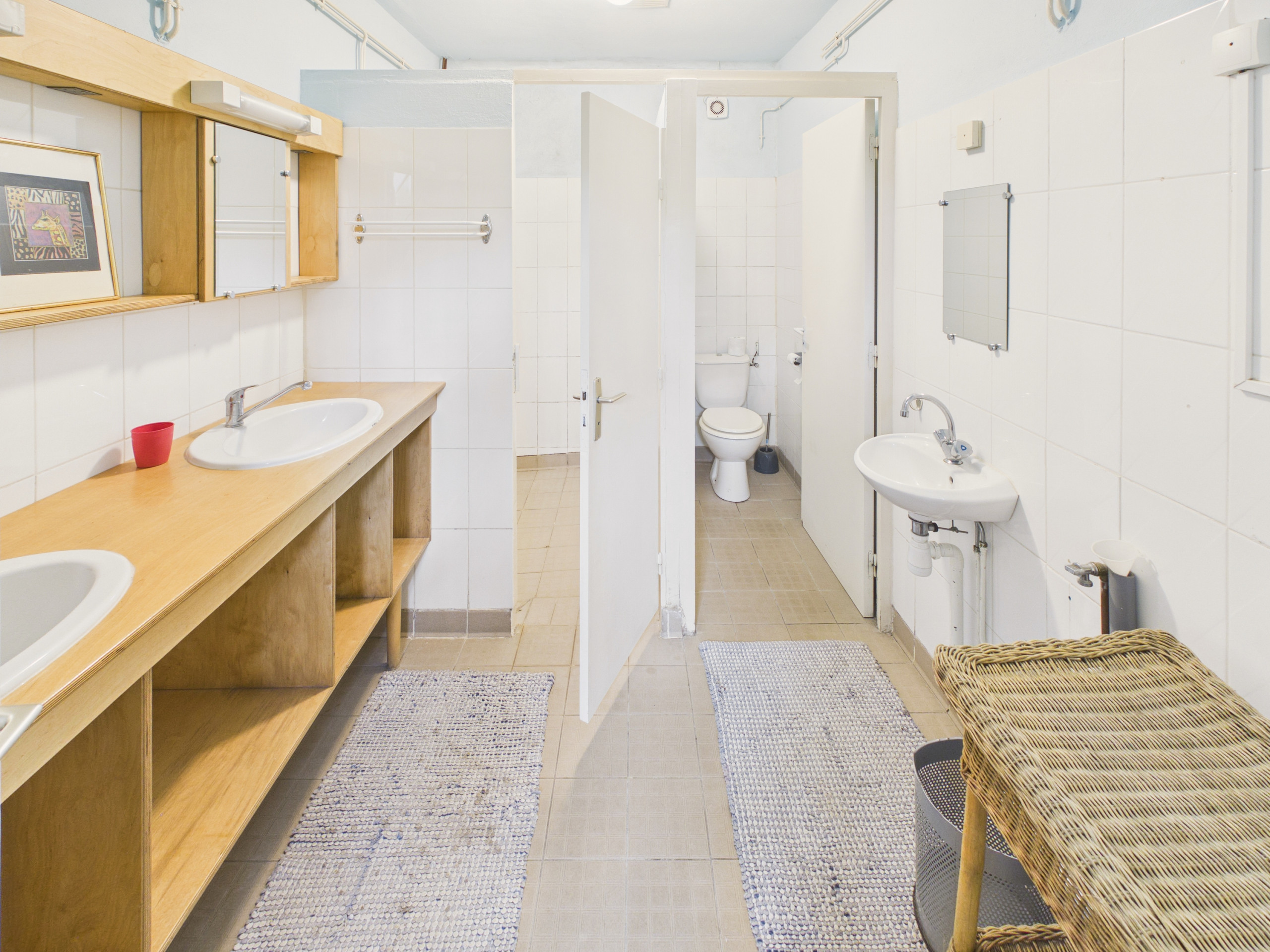 La salle de bain, avec une douche, un WC et une double vasque , se trouve entre le coin nuit et l’espace de vie.