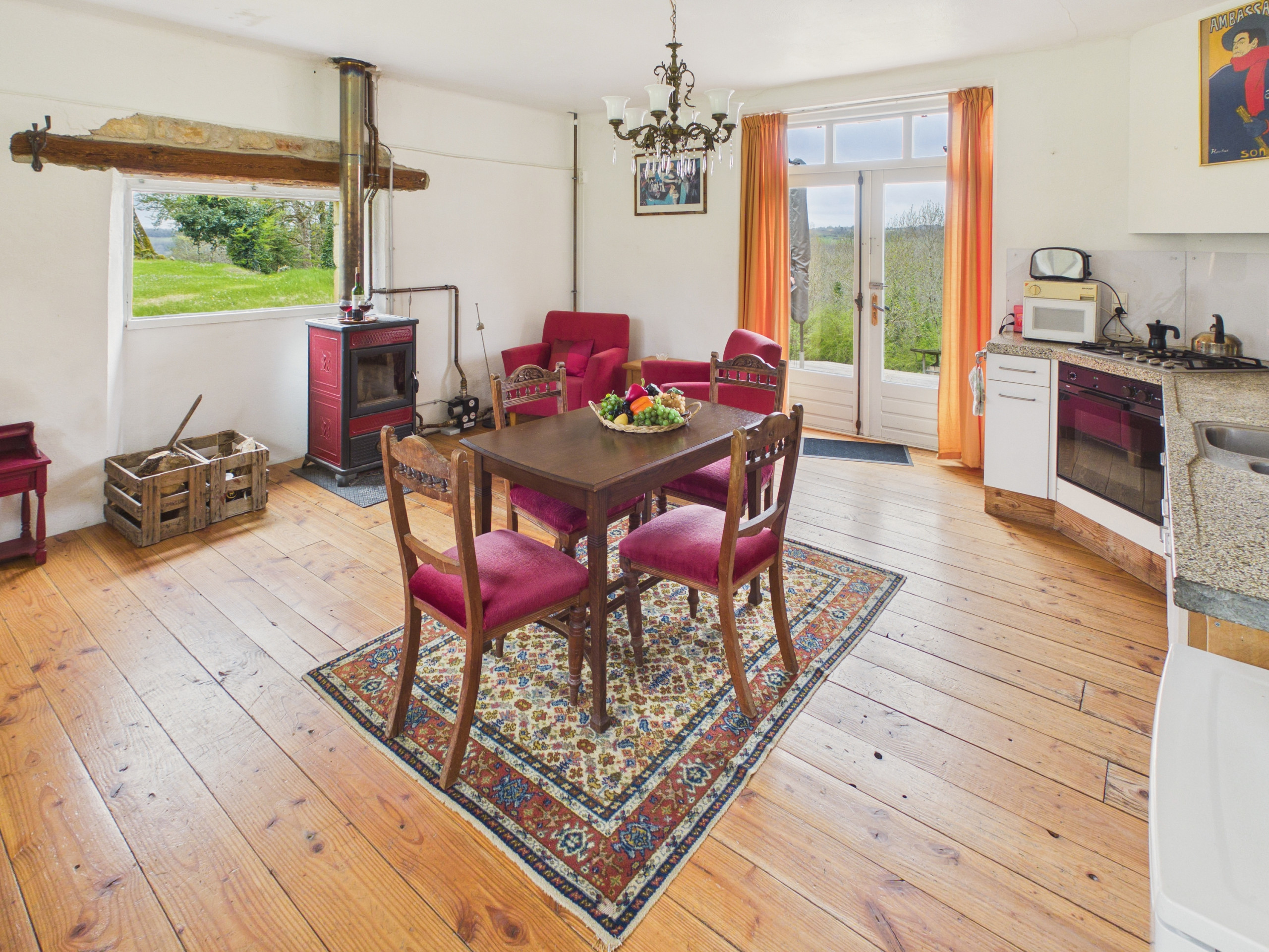 Le coin salle à manger, avec sa table en bois, vous permettra de partager des repas conviviaux tout en admirant la vue sur le jardin. La cuisine, ouverte sur le reste de la pièce de vie et entièrement équipée, dispose de tout le nécessaire pour concocter de délicieux repas : plaques de cuisson au gaz, réfrigérateur, four, grille-pain, cafetière à filtre, bouilloire et tous les ustensiles dont vous pourriez avoir besoin.