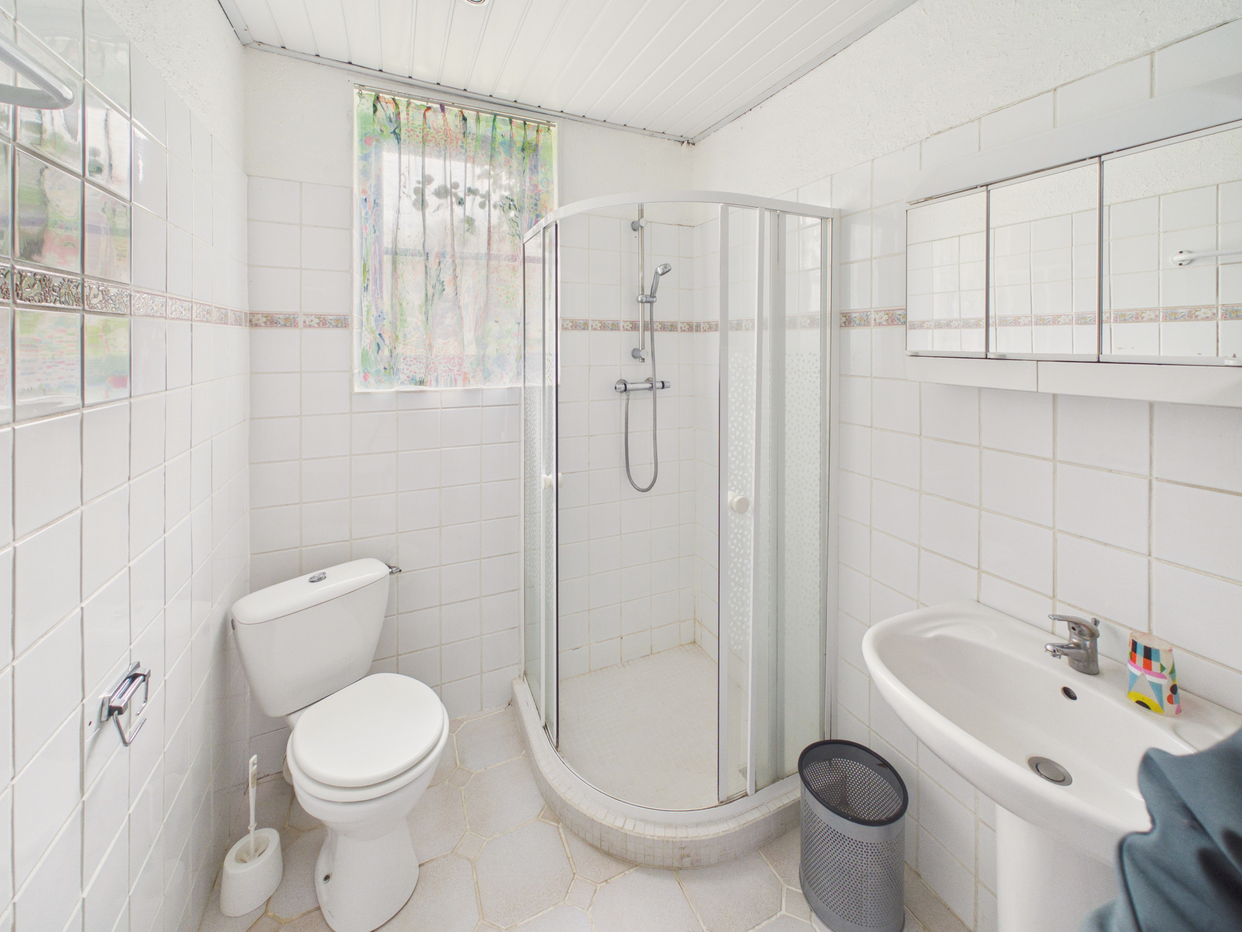 La salle de bain avec une douche et un WC se trouvent au fond du couloir.