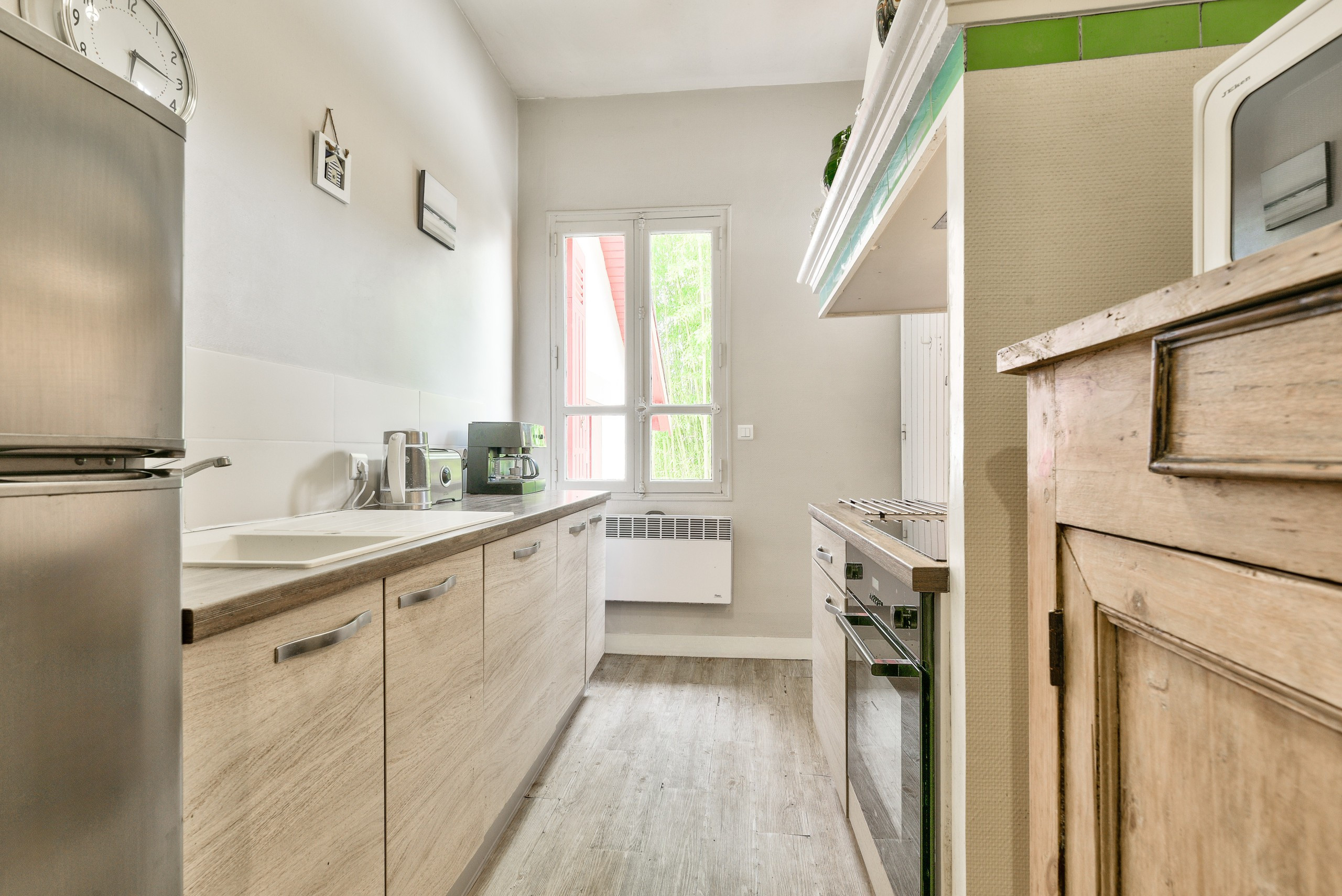 La salle à manger est un coin privilégié. Ses ouvertures vous permettront de profiter de la vue sur l'extérieur. Ce sera un lieu parfait pour partager de bons repas et des moments de réunion. Le salon, lui, est un coin accueillant. Son parquet ancien en fait un endroit agréable, propice à un moment de pause devant la télévision. Ensuite, la cuisine, indépendante, où vous trouverez tout ce dont vous avez besoin : plaques vitrocéramiques, réfrigérateur, micro-ondes, four, congélateur, lave-vaisselle, cafetière, grille-pain et bouilloire. Le logement de 100 m² est accueillant et la cuisine totalement équipée.