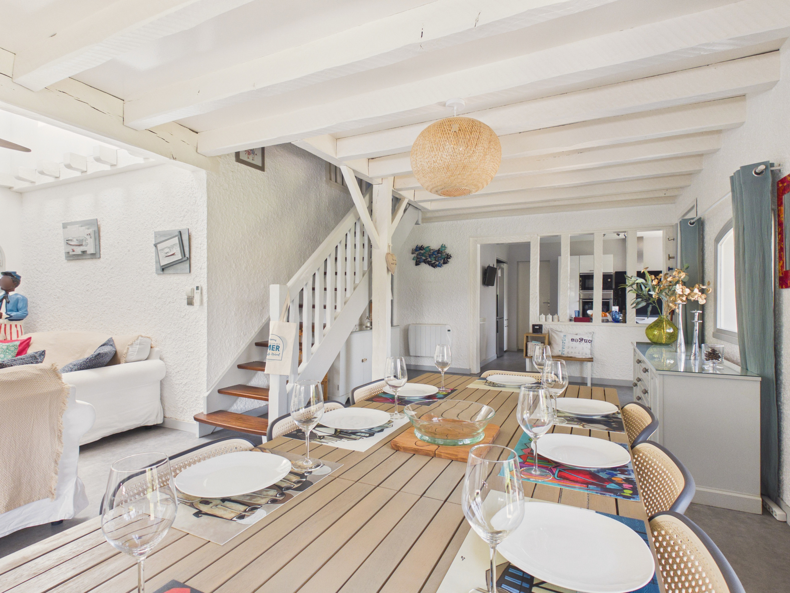 L'intérieur de la maison est tout aussi accueillant, avec sa décoration moderne et ses tons pastel qui vous apaiseront instantanément. Le salon, avec son canapé couleur ocre, vous invite à la détente, à savourer un café ou à bavarder en famille. La table à manger vous garantit des moments conviviaux autour de bons repas. La cuisine ouverte, entièrement équipée et moderne, vous offre tout le nécessaire pour vous sentir chez vous : plaques vitrocéramiques, réfrigérateur, congélateur, micro-ondes, four, lave-vaisselle, cafetière, grille-pain et bouilloire. De quoi laisser libre cours à vos talents culinaires !