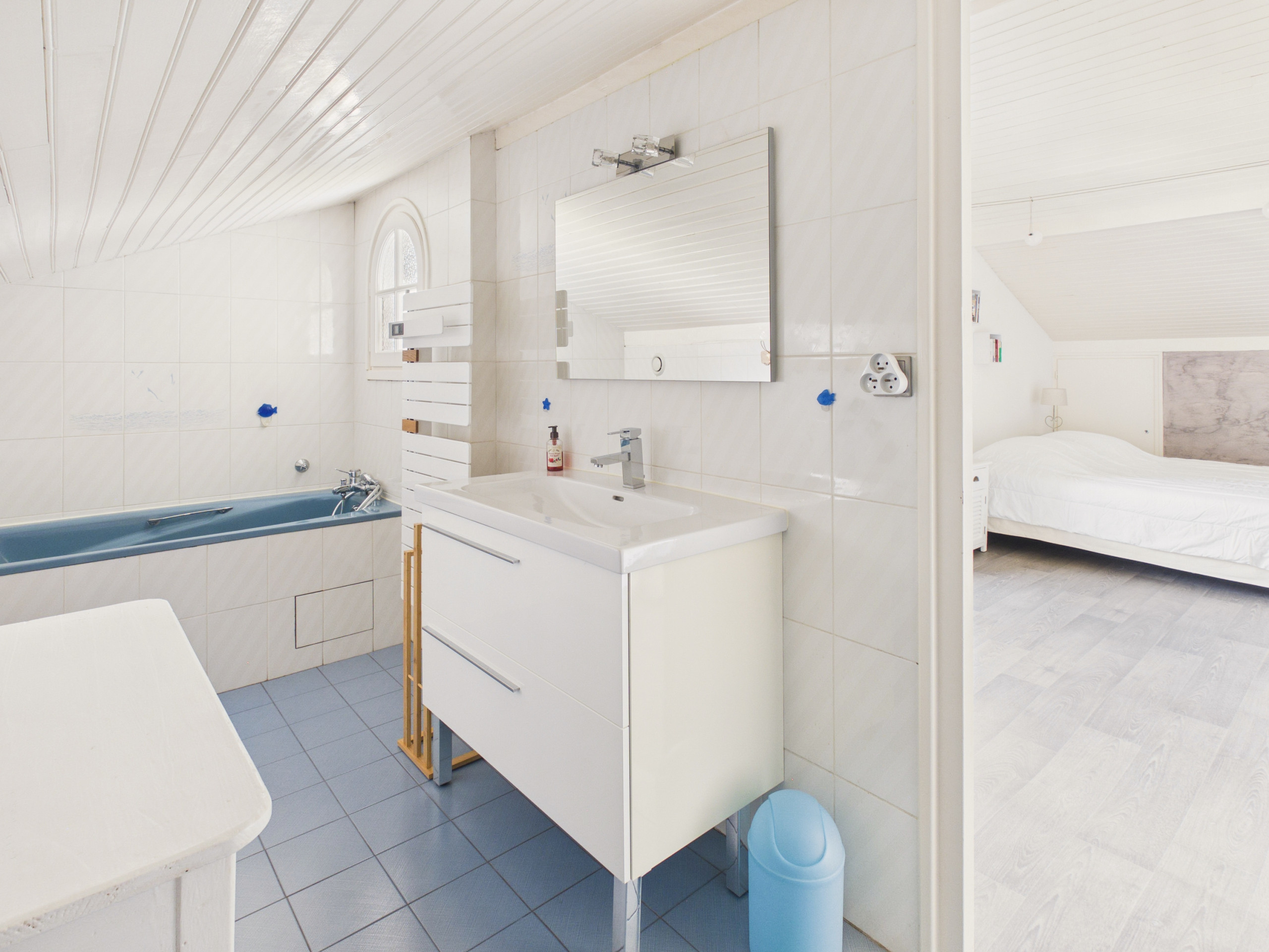 L’espace nuit se compose de deux chambres : la première dispose d’un lit Queen size (160x200) et la seconde d'unlit double et d'un lit queen size. Dans la salle de bain, vous trouverez une douche, une vasque, un WC, une machine à laver et un sèche-cheveux.