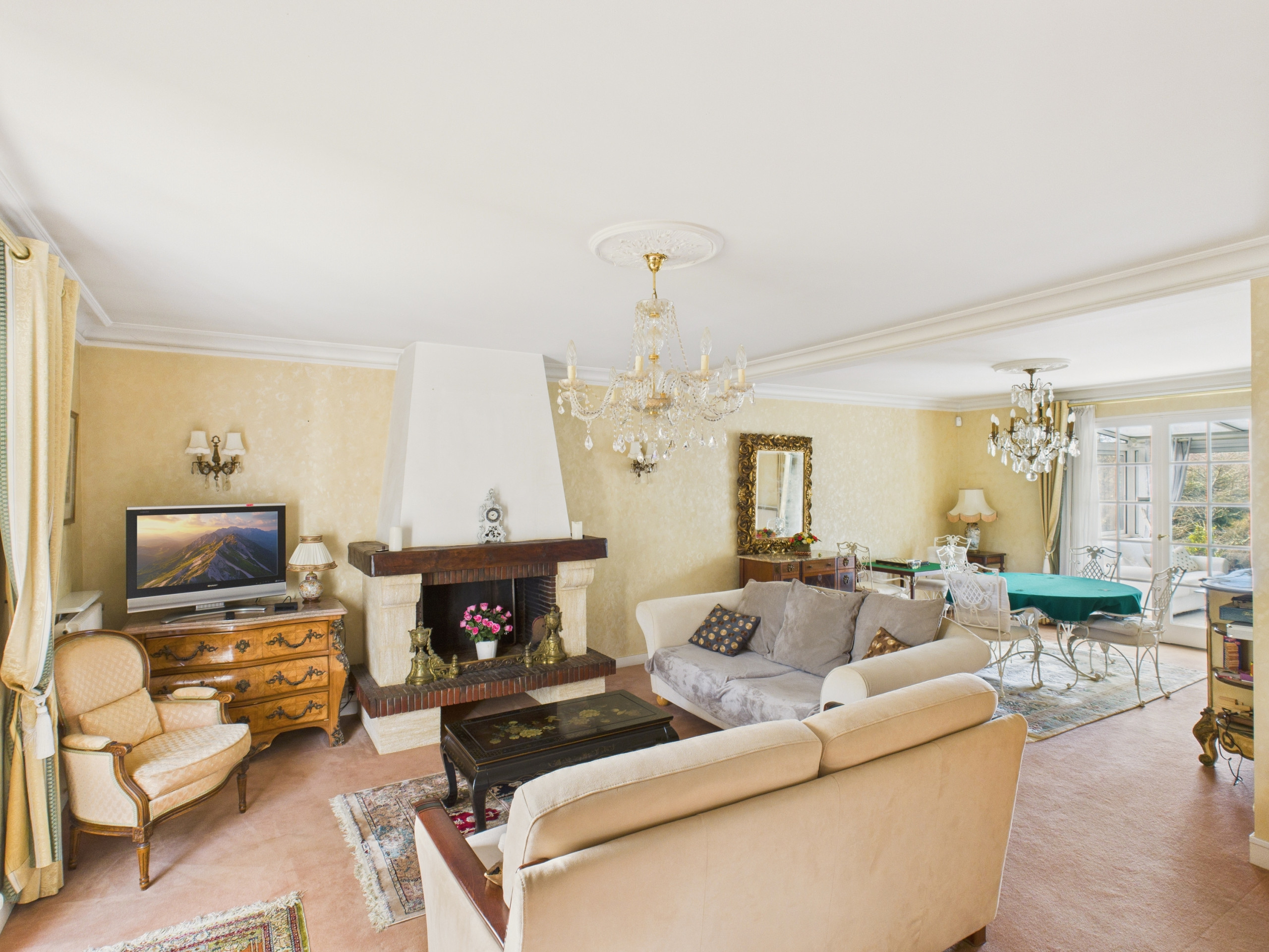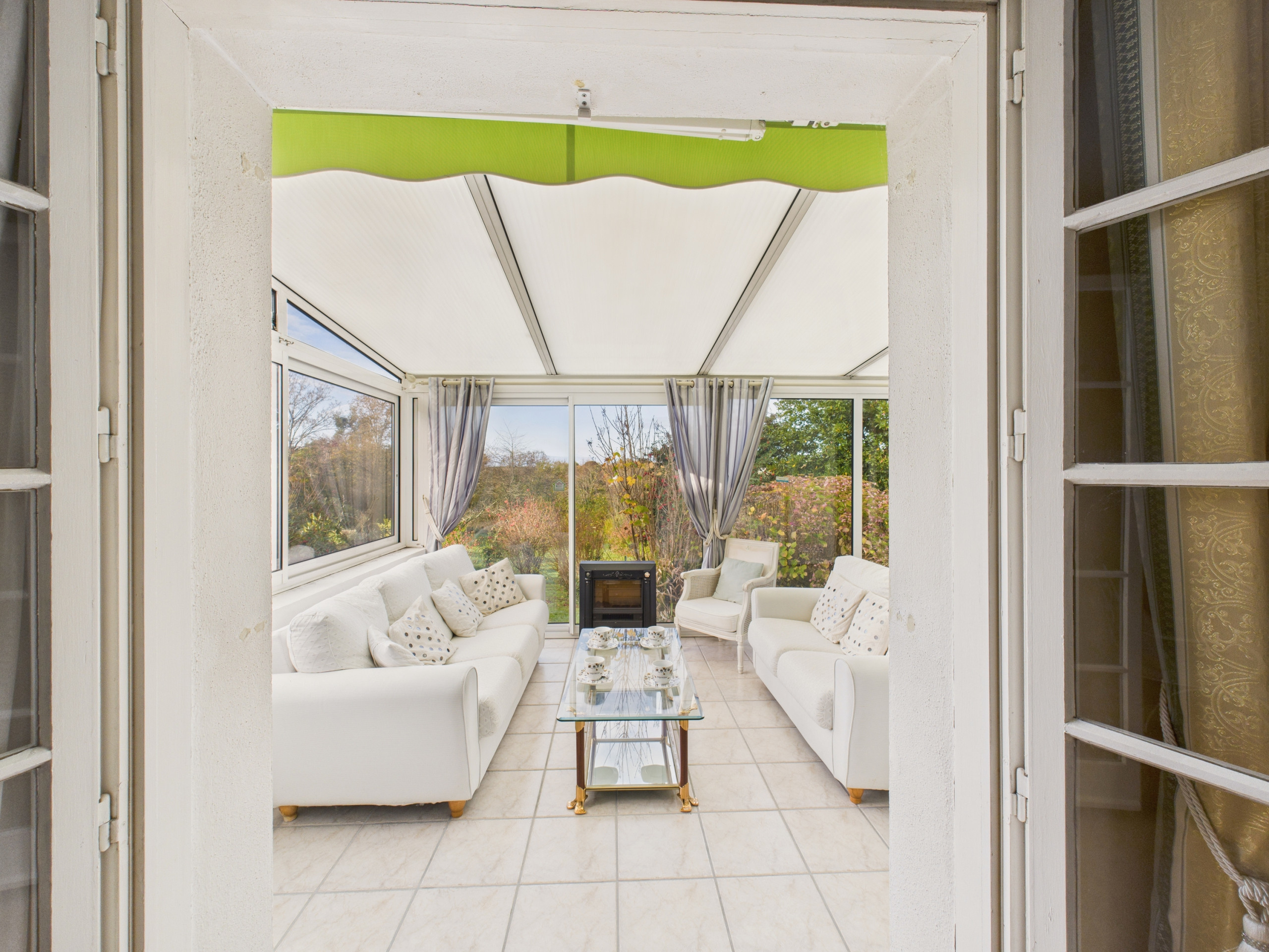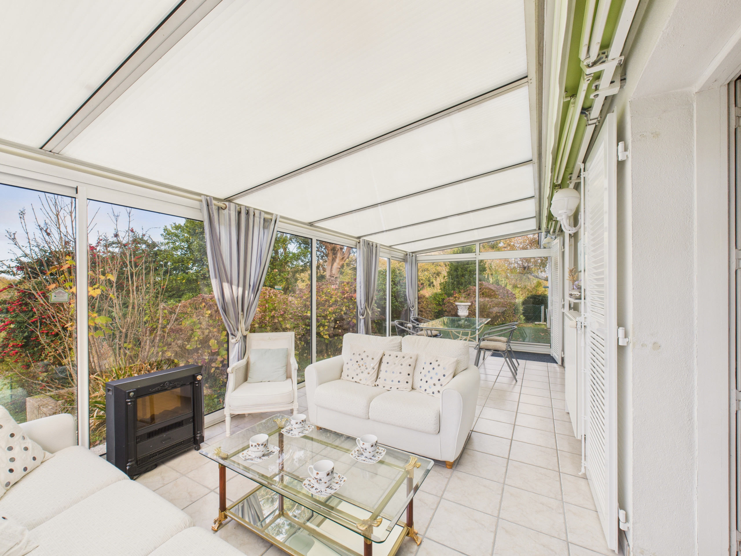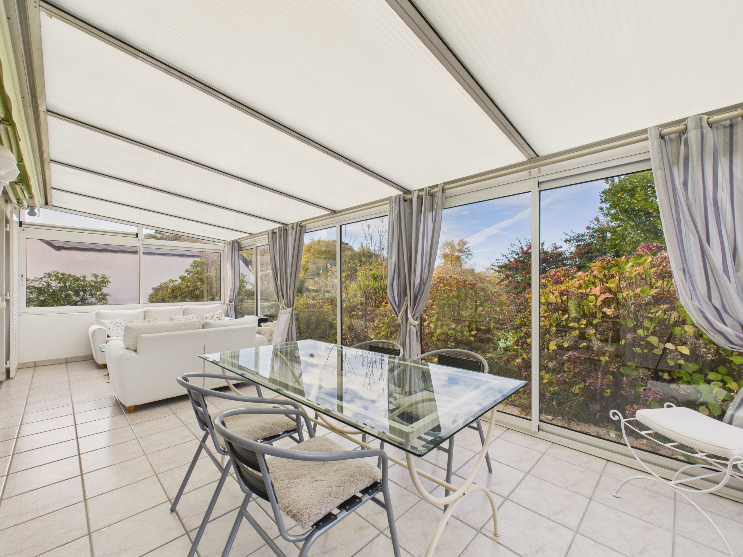 Au rez-de-chaussée, vous pourrez admirer le beau jardin de cette maison tout au long de l'année grâce à sa véranda, un espace idéal pour manger autour de la grande table ou pour vous relaxer sur les canapés.