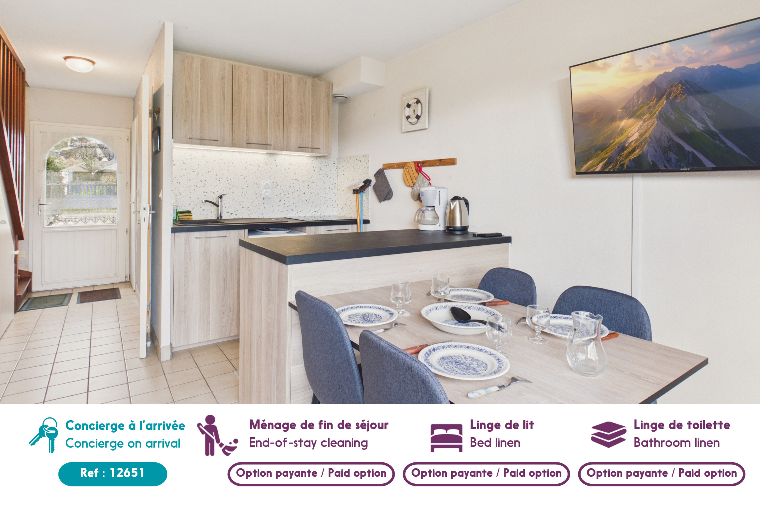 La maison compte deux chambres dont une en mezzanine au dessus du garage (attention l'accès à cette seconde chambre par échelle de meunier n'est pas sécurisée pour des enfants), Vous disposerez d'une place de parking dans la résidence. A votre disposition dans la location: un sèche-cheveux, , une télévision, une radio et un lave-linge. La cuisine américaine avec plaque vitrocéramique, est équipée d'un réfrigérateur, d'un four micro-onde multifonction, d'un congélateur, d'un lave-vaisselle, d'une cafetière à filtre, d'un grille pain et d'une bouilloire.