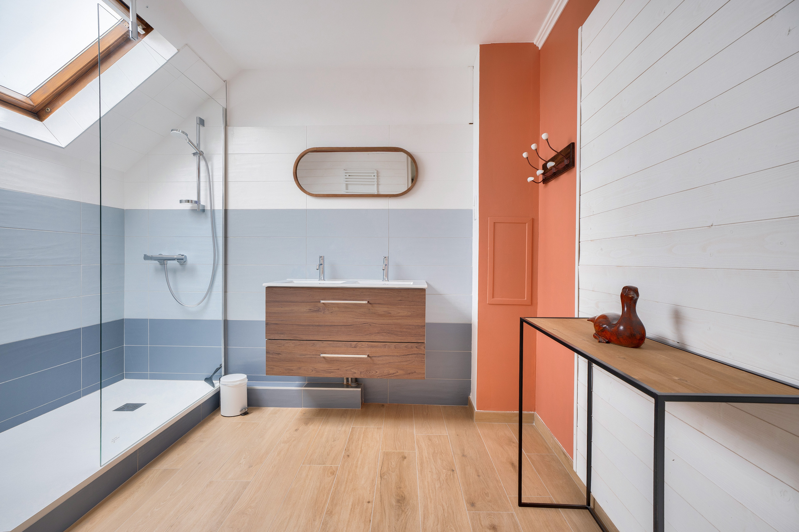 Le rez-de-chaussée se complète avec un WC indépendant, une chambre bleue turquoise avec un lit simple et une salle d’eau avec sa douche. À l’étage, on découvre trois chambres et une salle d’eau avec une grande douche et WC. La première chambre propose un grand lit Queen size (160/200), la seconde, aux murs bleus, deux lits simples assemblés pour n’en faire qu’un, mais pouvant être séparés, et la troisième dispose de 2 deux lits simples.