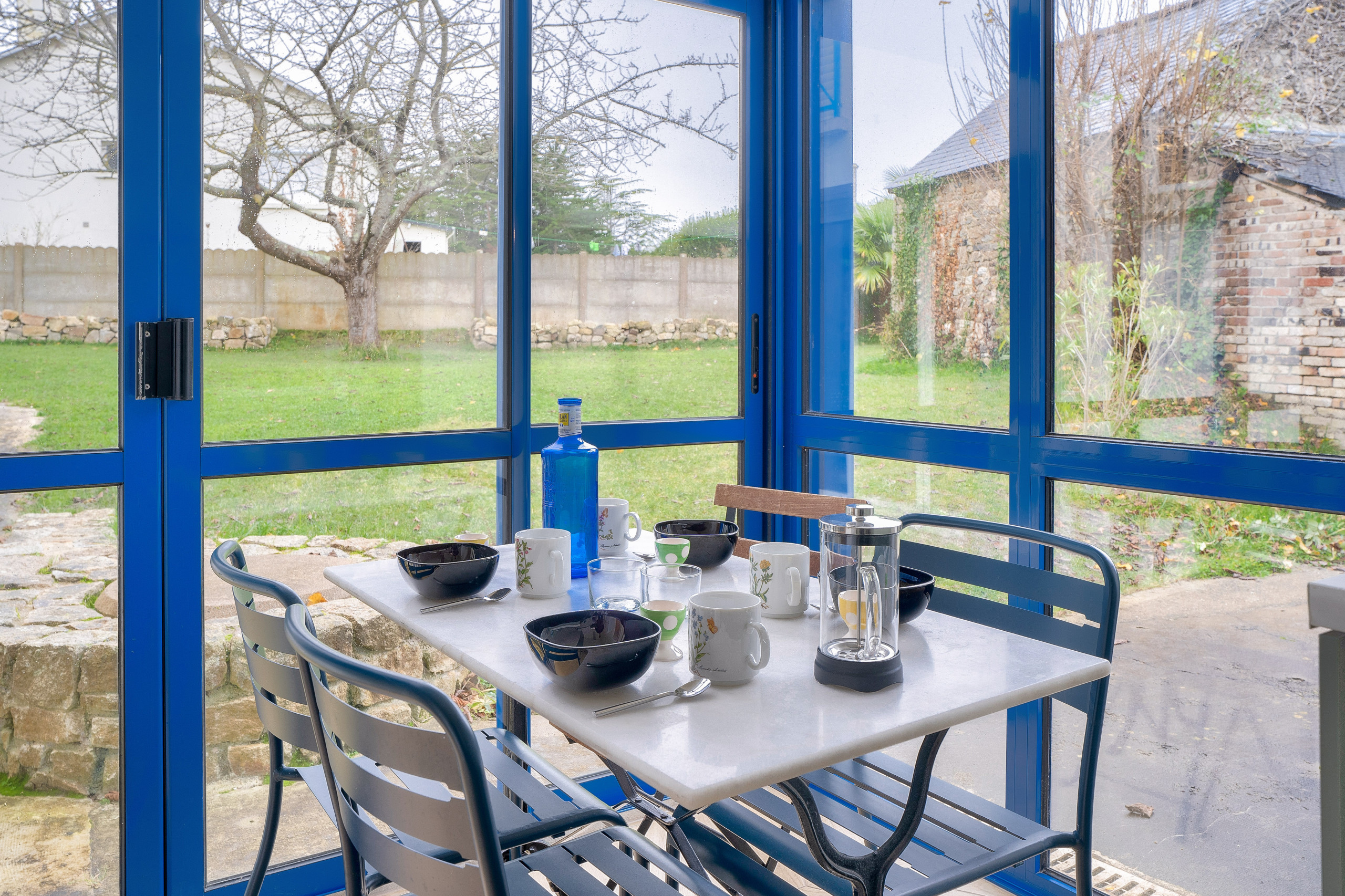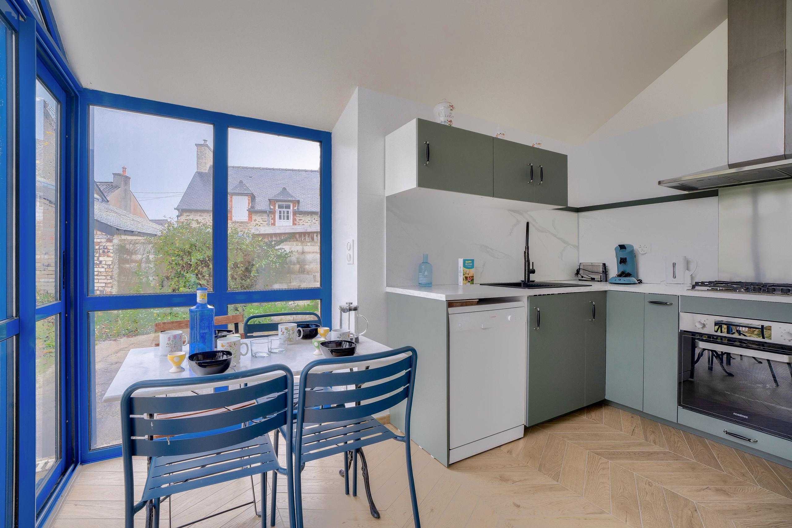 Pour cela, direction la cuisine, dans la véranda bleue. Bien équipée, vous y trouverez une cuisinière à gaz, un four, un four à micro-ondes, un réfrigérateur, un congélateur, ainsi qu’un lave-vaisselle. Pour vos petits déjeuners, une bouilloire, une cafetière et un grille-pain sont à votre disposition. Avec son accès au jardin, que l’on soit dans la salle à manger ou dehors sur la terrasse de 20 m², la cuisine de cette maison est le point central des bons moments autour de la table.